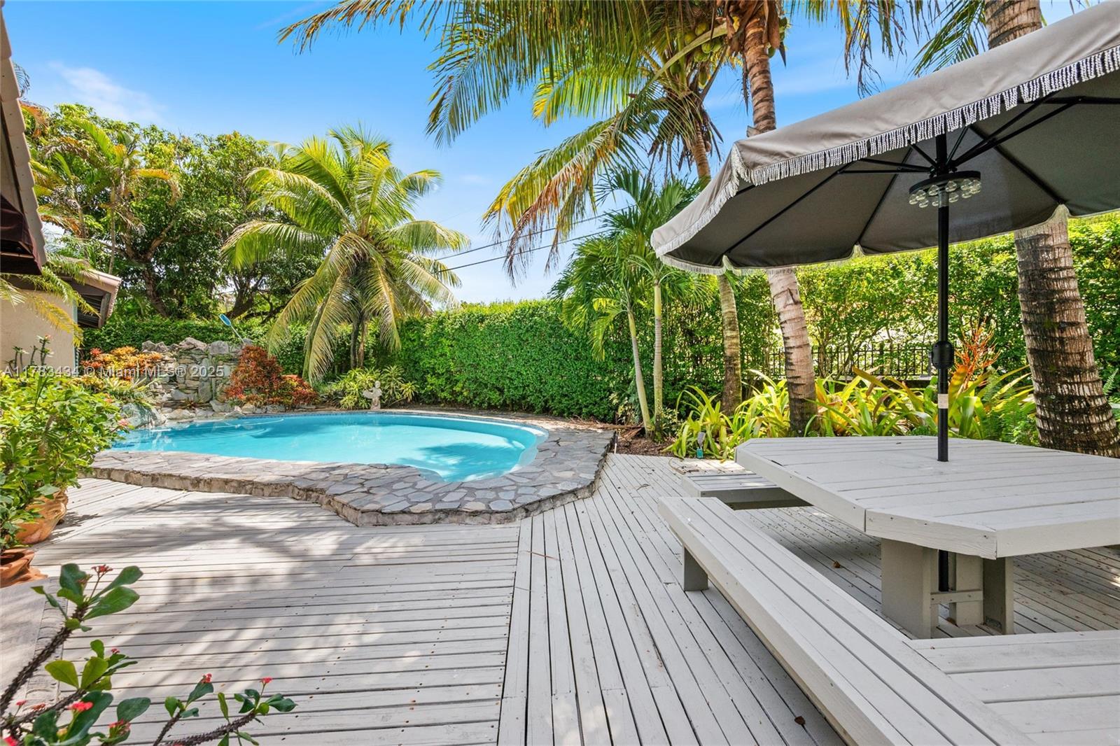 Tucked away on a lush lot in coveted Coral Gables, this meticulously maintained tropical oasis brims w/warmth, character & potential. Its premier location 1 blk from UM places this classic mid-century home in the heart of walkable Coral Gables. Tidy interiors feature: vaulted ceilings, crown molding; built-ins; tile floors; skylights & impact windows. Graciously scaled living rm. Family rm invites nature indoors. Updated kitchen w/Viking appliances & pass-thru to dining area. Primary suite boasts spa-style shower, 2 walk-ins & patio access; 2nd bdrm w/patio access + flexible extra space for 3rd bdrm or office w/ full bath. Beautiful resort-style backyard anchored by waterfall pool, deck & mature palms. Enchanting & timeless, this lovely little paradise is a hidden gem.
