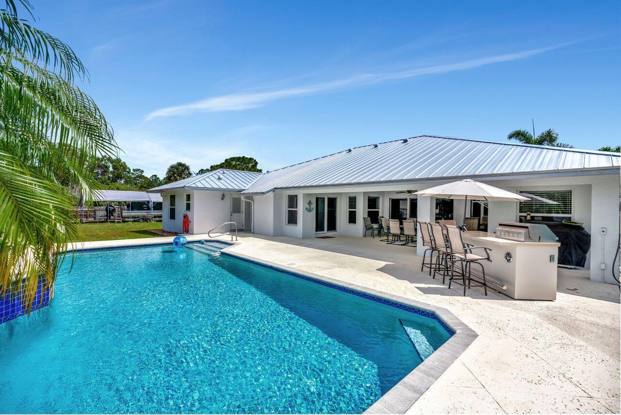 Welcome to your dream home in desirable Jupiter Farms! This CBS-built beauty offers 5 bedrooms (including a private en-suite), 4 full bathrooms, and a spacious 3- car garage. Sitting on 1.15 acres, with backyard fully fenced, this property is loaded with upgrades with a new metal roof. Home is secure with full impact windows, doors and sliders, plus shutters for added peace of mind. Step inside to a bright, open layout with a gorgeous kitchen featuring stainless steel appliances and plenty of space for entertaining. The home flows beautifully with spacious living areas and separate laundry room complete with sink. Step out back to your private oasis- an oversized heated pool, covered patio and built-in summer kitchen with grill perfect for year-round enjoyment.