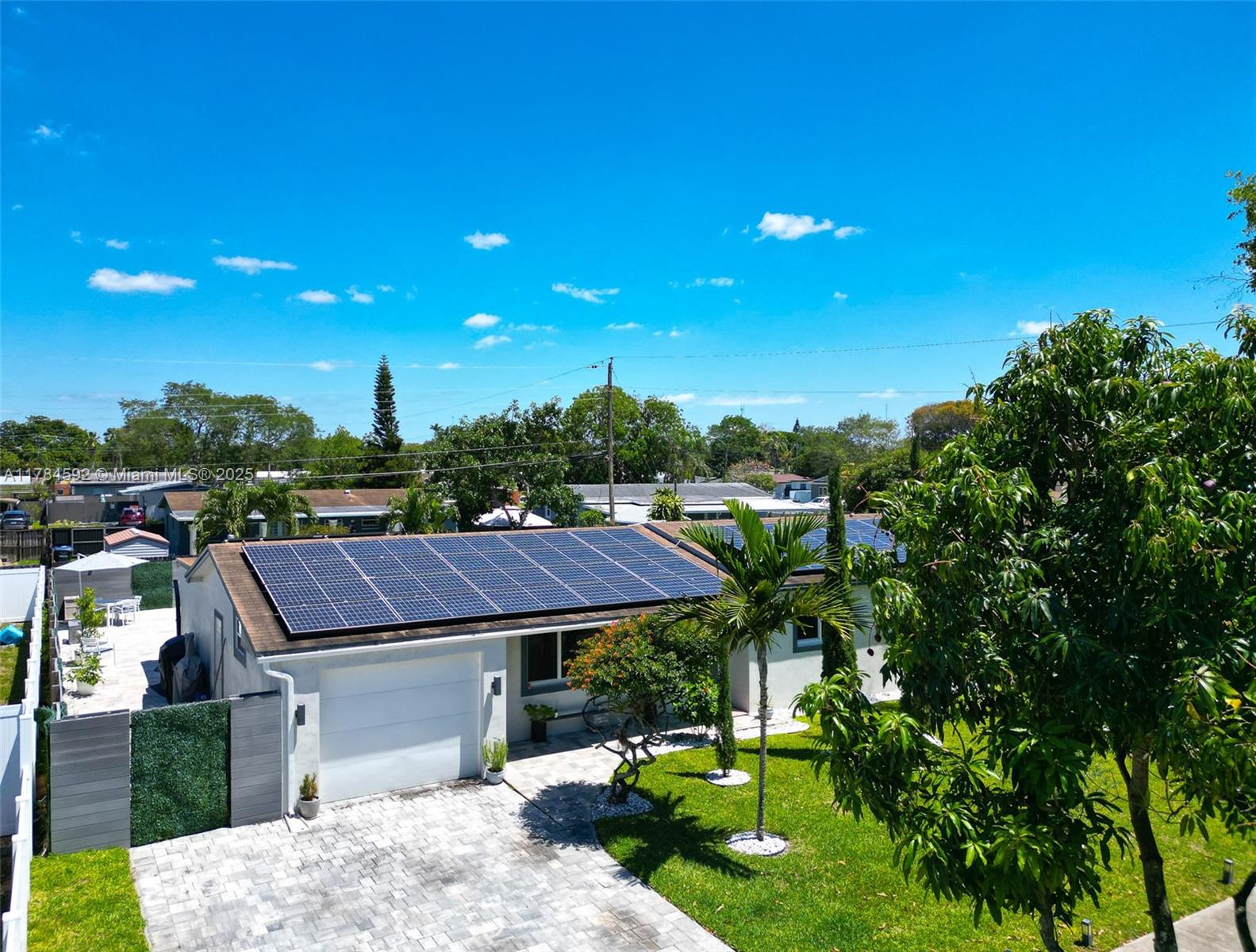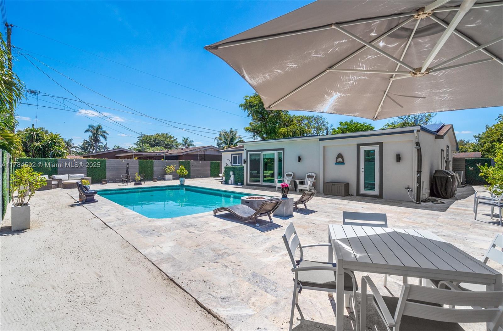 Stunning upgraded home in one of Hollywood’s most desirable zip codes—Features include a stone paver driveway, stylish composite cladding, impact windows/doors, newer A/C (2020), washer/dryer (2025), and gas water heater (2020). Open-concept layout with porcelain tile throughout, a chef’s kitchen with quartz waterfall countertops, ample countertop space and beautiful backsplash in kitchen, stainless steel appliances, dinning area, living room and a spacious Florida room great for a movie theater room or game room. The backyard is a resort-style paradise with a remodeled saltwater pool, travertine tile, white silica sand, outdoor shower, and designer composite fencing. Solar panel system for energy efficiency. NO HOA! A true move-in ready gem!