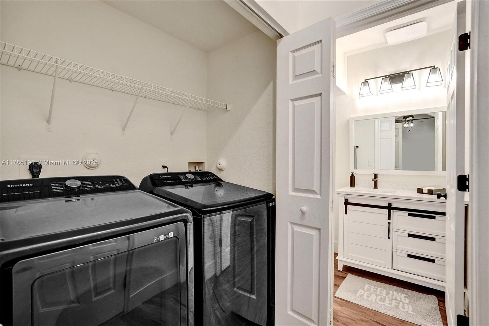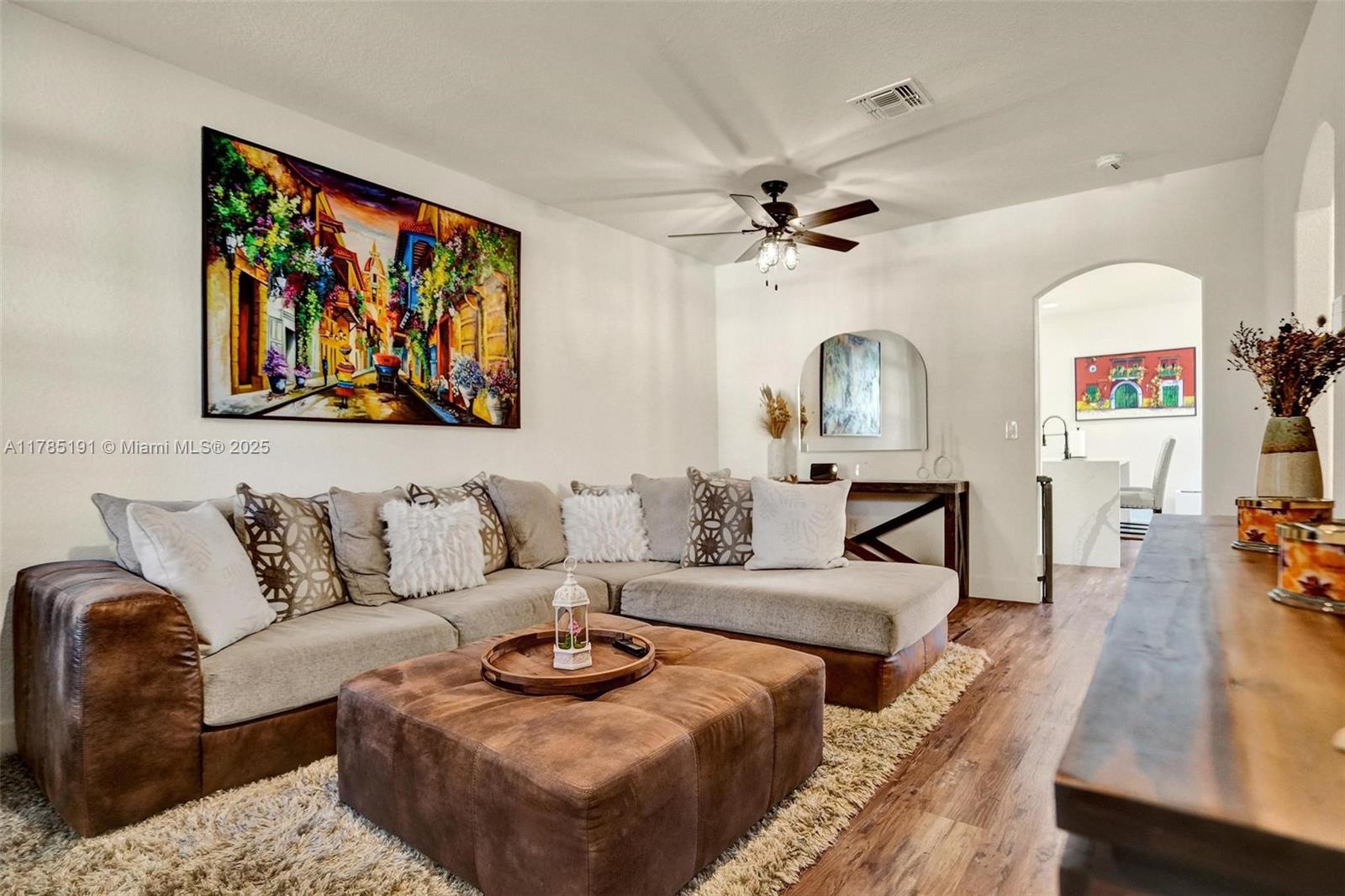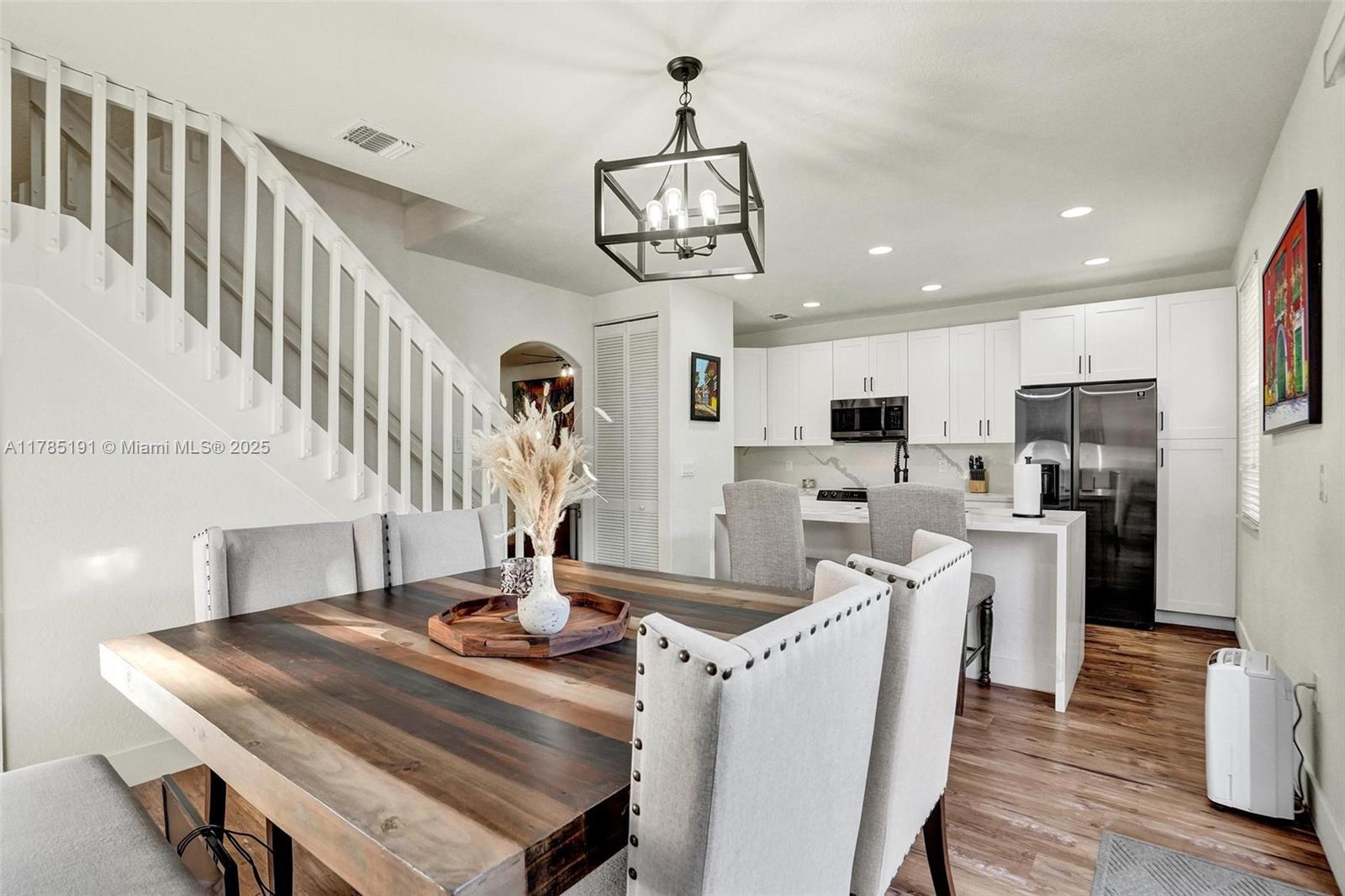 Fully renovated townhome with bamboo floors and barn-style charm. Features include quartz countertops, black finishes, and spacious living, dining, and family rooms. The large primary suite offers a walk-in closet and a luxurious bath with dual sinks, dual shower heads, and private toilet. Guest rooms are generously sized with upgraded baths. Accordion shutters upstairs, panel shutters downstairs, one-car garage, and barrel tile roof. Located in a gated community with a pool, gym, tennis court, kids’ play area, and community mailbox. Move-in ready and beautifully updated!