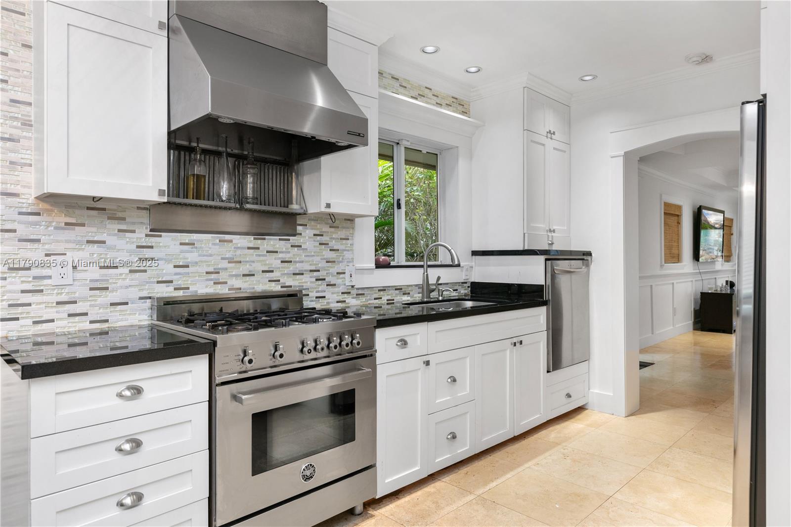 Waterfront, Spanish style 5 bed/ 4 bath home with direct ocean access no fixed bridges 55 ft waterfront with 4 boat slips (12 W x 40 L each slip) nestled in Miami Upper East side is the perfect home. Marble flooring in main areas and wood floors in all bedrooms, two ground floor bedrooms (one en suite) and primary bedroom & 2 bedrooms upstairs. Galley kitchen with stainless steel appliances. Spacious open floor plan ideal for entertaining. Backyard is a private oasis featuring privacy wall, pool and built-in bbq area shaded. Impact windows and doors upstairs and regular windows (kitchen and front bedroom only with exterior shutters). Stove, dryer and tankless water heater and whole house generator on natural gas. Two car garage enter from the back of property.