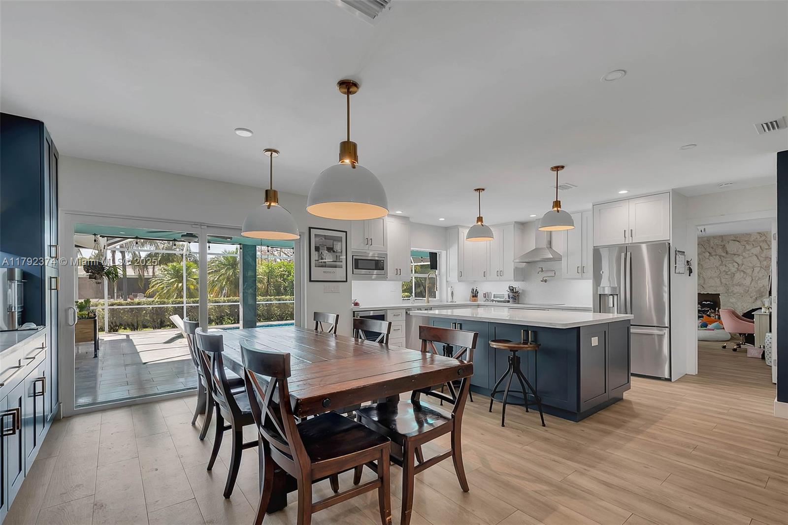 Canalfront, 4 bdrm/ 2 bath updated home in Palmetto Bay. Open concept living area, dining with butler’s pantry. Gorgeous, remodeled kitchen with quartz countertops, beautiful cabinetry, tile backsplash in herringbone design, center island and seating, beverage cooler. Family room w stone fireplace, currently used as 4th bedroom. Well-distributed guest bedrooms, new guest bath with artistic tile flooring, double sinks. Primary bdrm w/ serene pool views, glass enclosed shower, walk-in closet. Plank tile flooring in living areas, carpet flooring in bdrms. Impact glass windows/ doors. Metal roof. Fenced yard, screened-in pool with beach entry and modern, stone patio. Circular drive, 2 car garage with side entry.