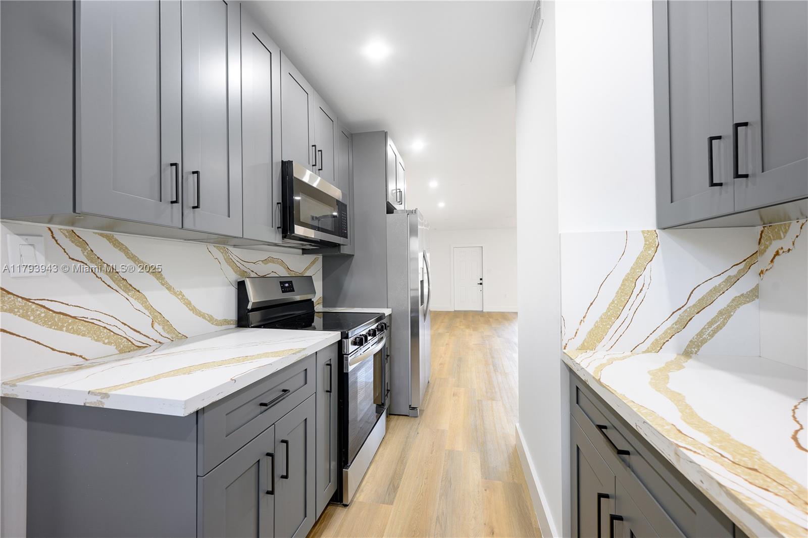 NEW roof installed in 2019! UPDATED home offering modern comfort. Features 2 spacious master bedroom suites, each with en-suite bathrooms and walk-in showers. New wood laminate flooring throughout, fresh interior and exterior paint, and an UPDATED kitchen with NEW appliances. 1 of the bedrooms also offers private access to the outside. Hurricane impact windows ensure safety and energy efficiency. The property boasts a large front yard and expansive side yard with ample space for RV or boat parking. Located on a quiet street, and near major expressways including I-95 and the Turnpike.