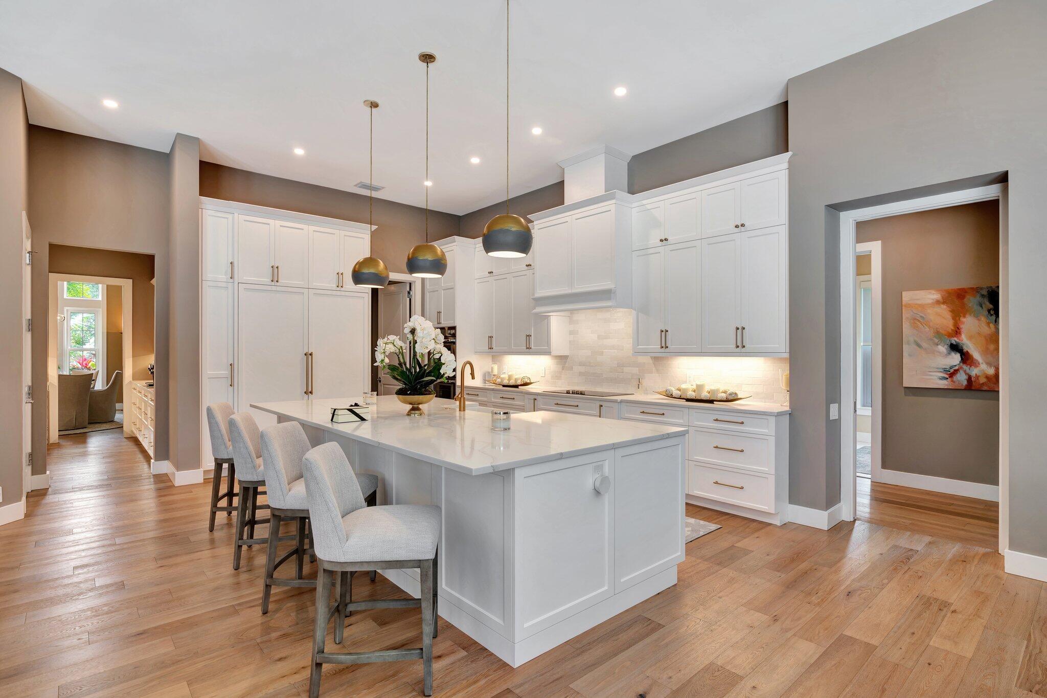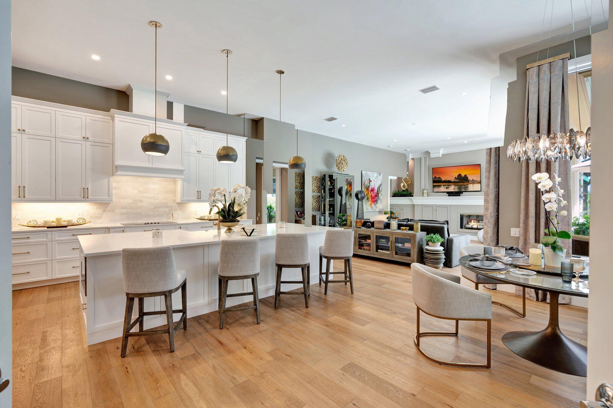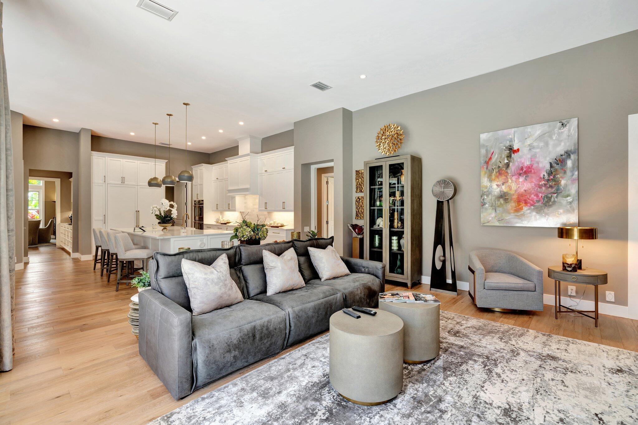 Stunning premiere golf course estate that blends elegance, comfort, and style. Modern luxury throughout! This impeccably designed residence features wood floors and exquisite designer furnishings , all situated in a prime location overlooking a legendary golf course. A Stunning remodel by RJS Construction, open and bright floorplan with 4 bedrooms on ground level including a spectacular primary suite. The primary suite is an oasis of pleasure with regal designer finishes and rich colors, complemented by plantation shutters, and window treatments that add warmth and sophistication. Chef's kitchen with top of line appliances, Butler's pantry, wet bar, and huge island with seating with a gorgeous view. (cont)