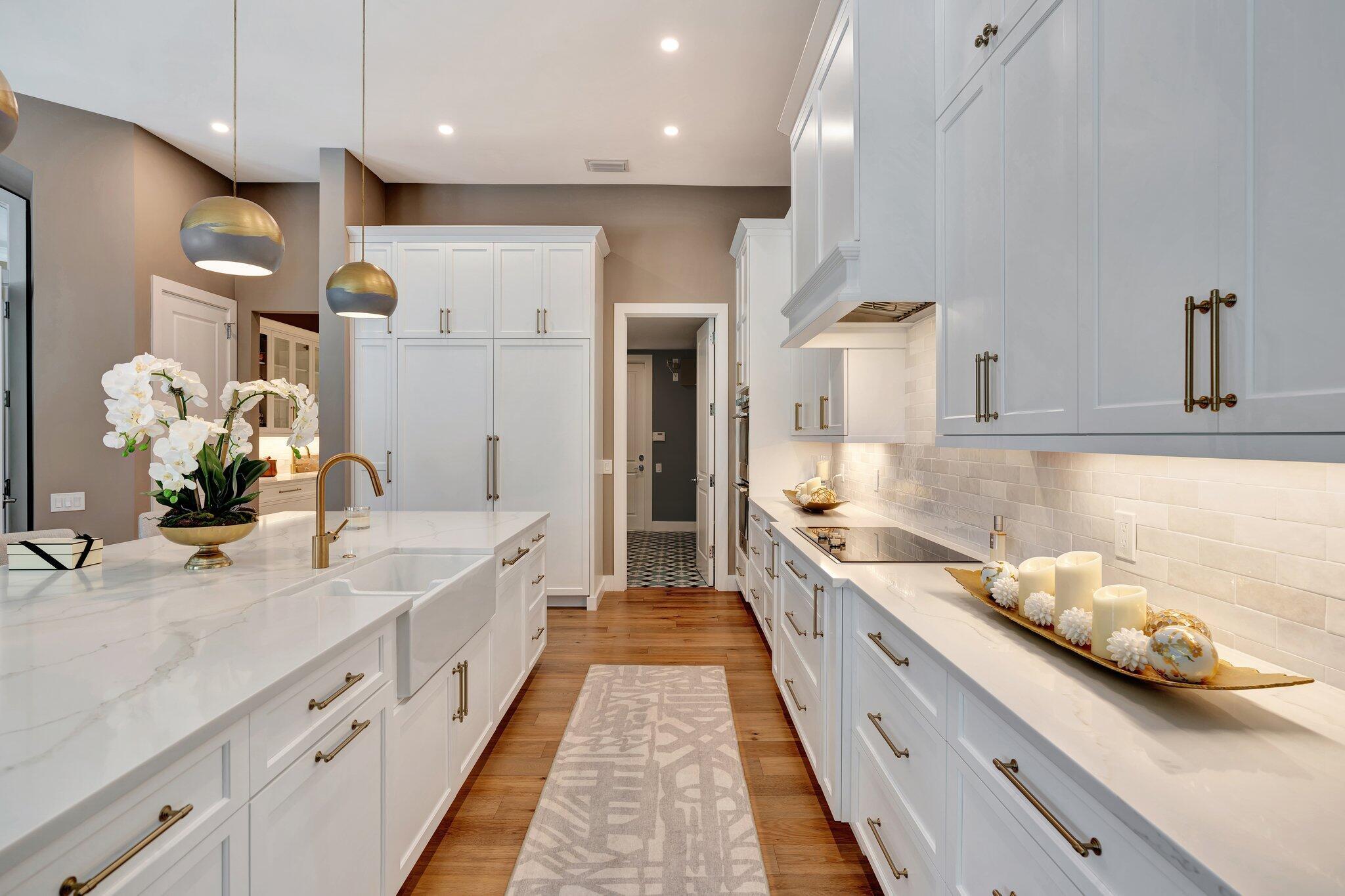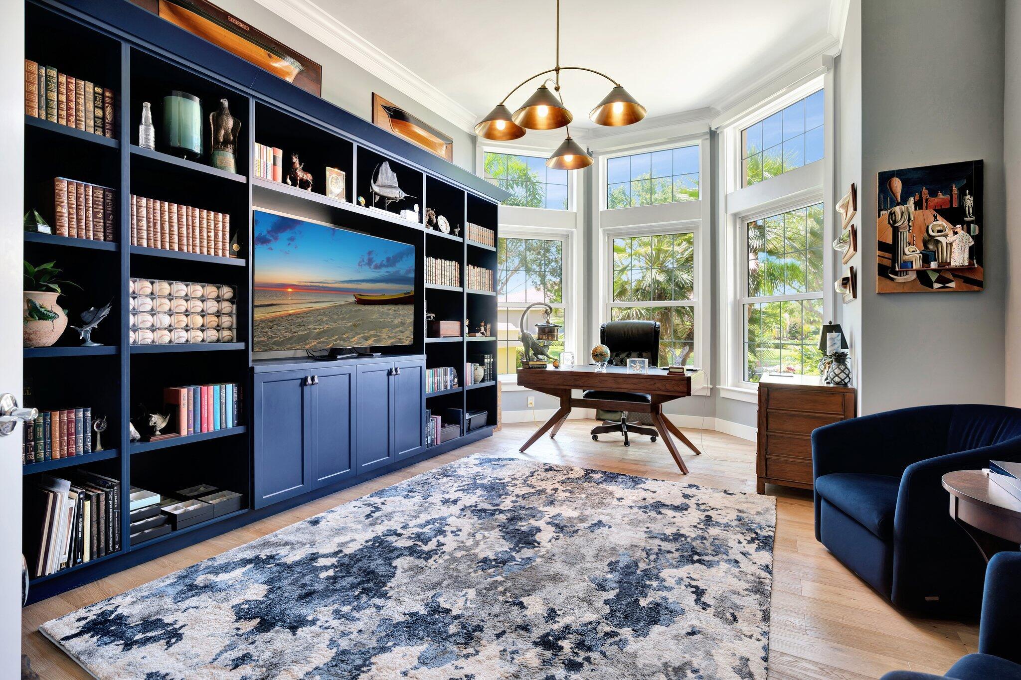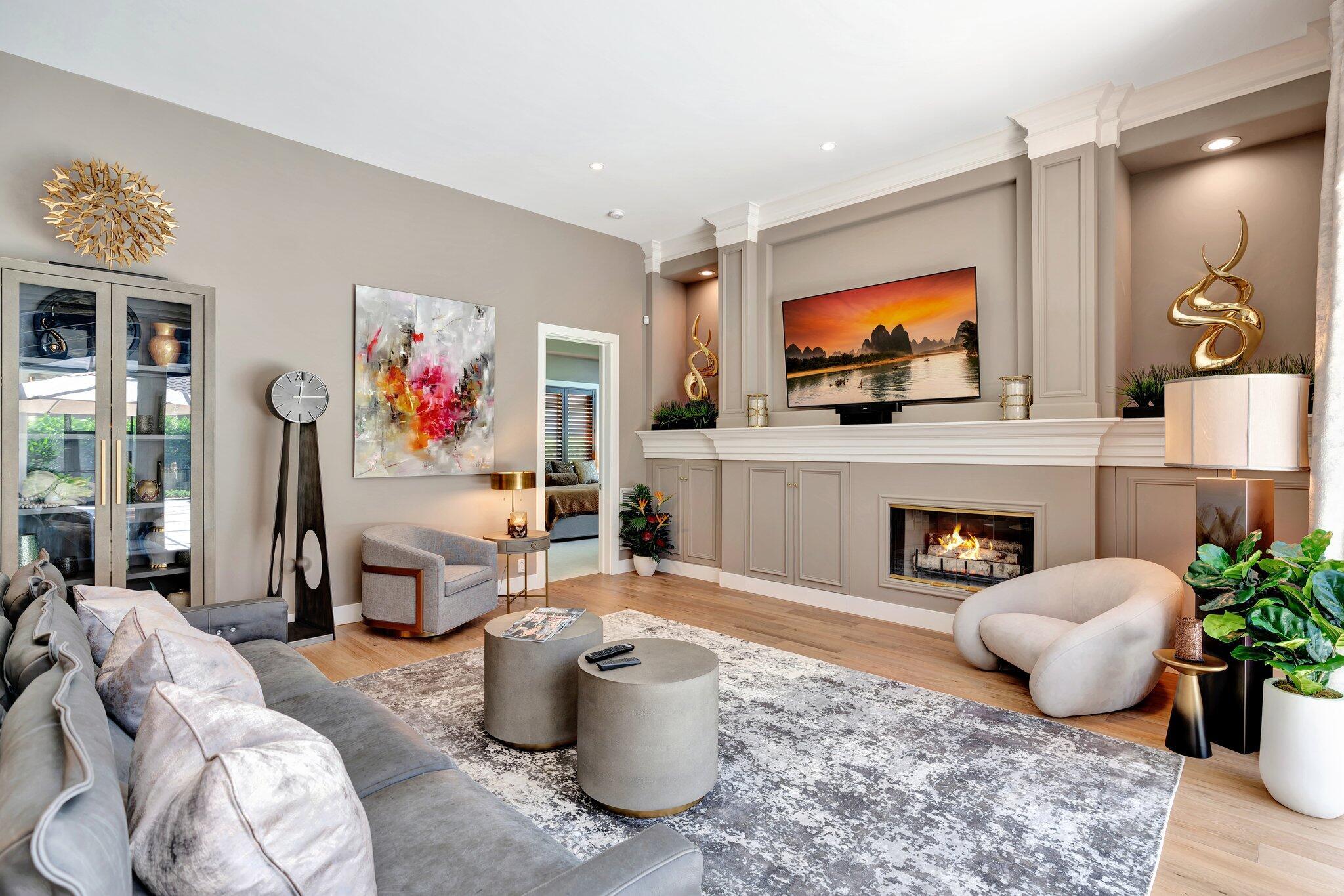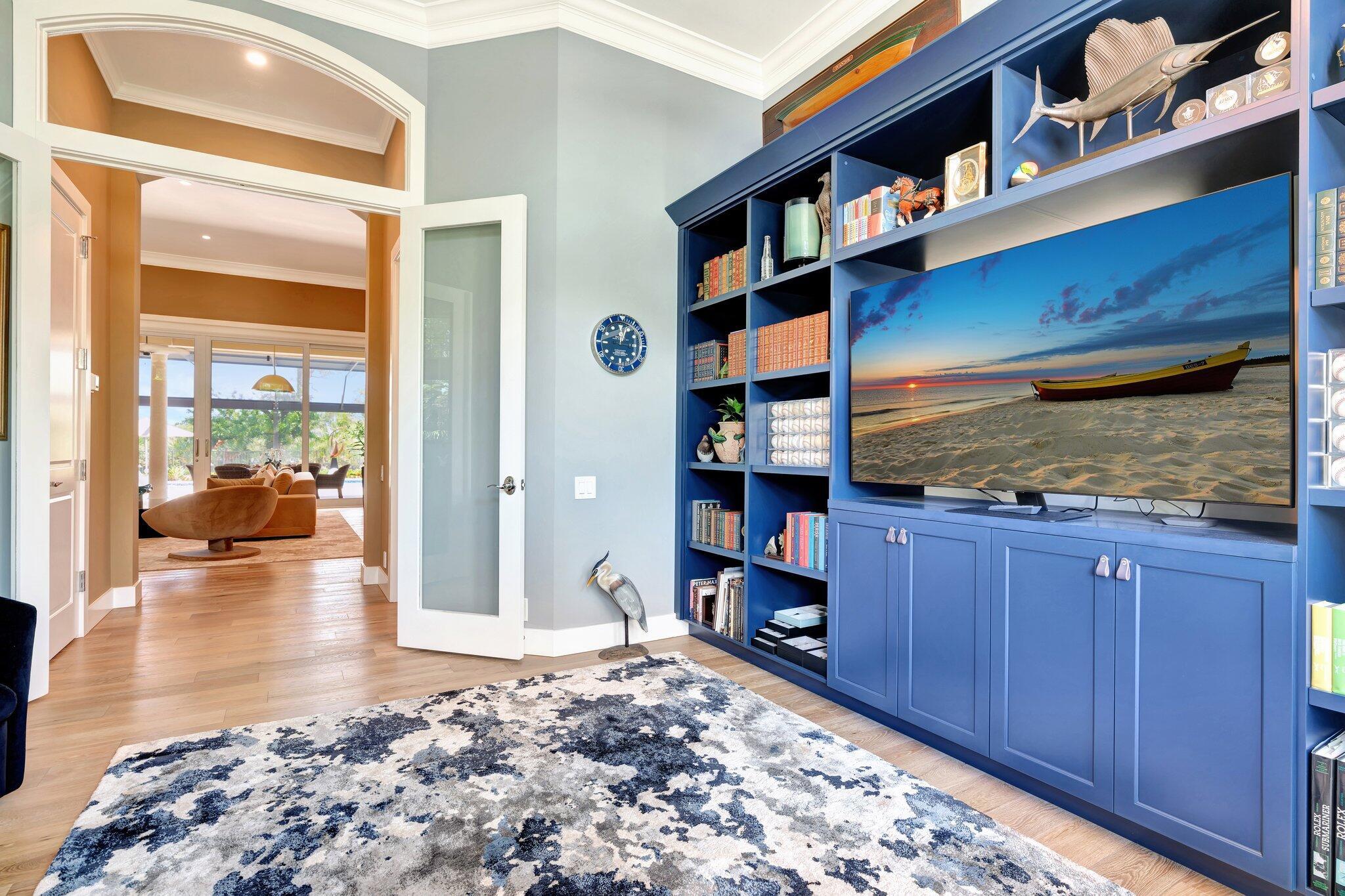 Stunning premiere golf course estate that blends elegance, comfort, and style. Modern luxury throughout! This impeccably designed residence features wood floors and exquisite designer furnishings , all situated in a prime location overlooking a legendary golf course. A Stunning remodel by RJS Construction, open and bright floorplan with 4 bedrooms on ground level including a spectacular primary suite. The primary suite is an oasis of pleasure with regal designer finishes and rich colors, complemented by plantation shutters, and window treatments that add warmth and sophistication. Chef's kitchen with top of line appliances, Butler's pantry, wet bar, and huge island with seating with a gorgeous view. (cont)