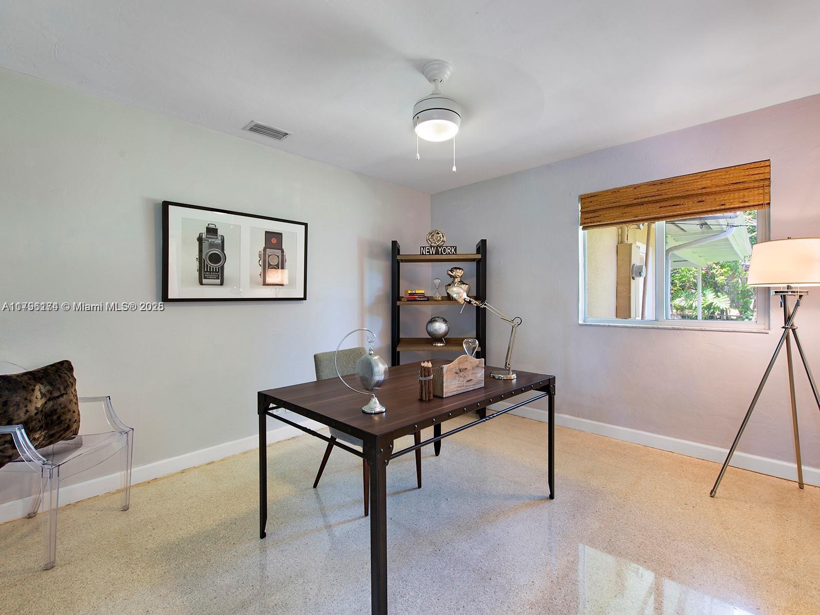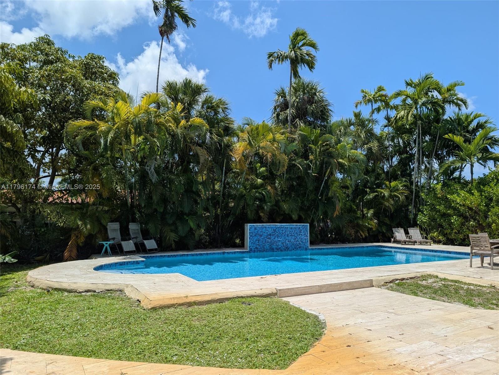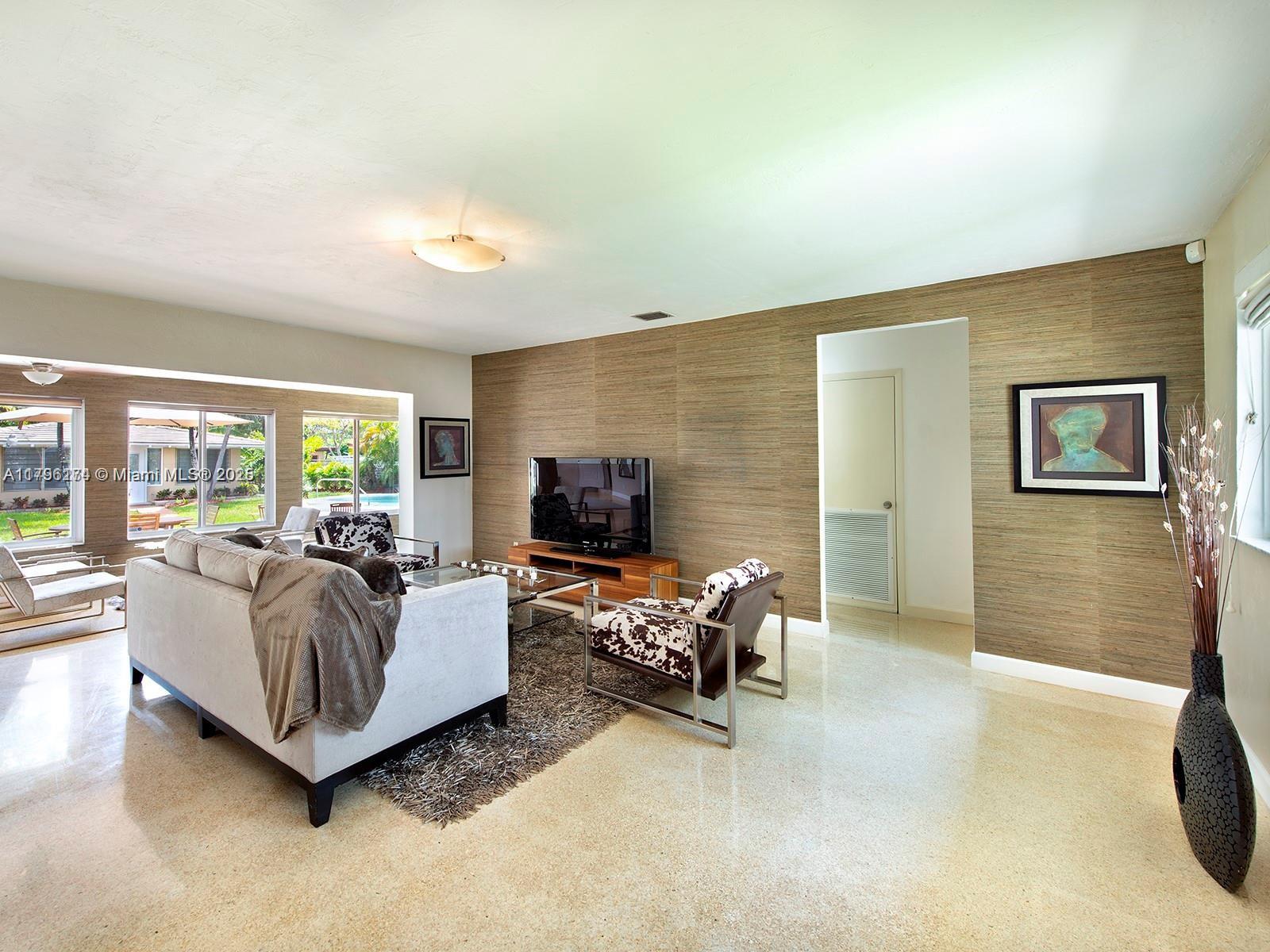 Spacious mid-century modern family home, located on an expansive, oversized lot in Miami Shores, steps from the golf course and Miami Country Day School. Comfortable split floor plan includes 4 bedrooms, 3 bathrooms, laundry room, storage room, double carport, large driveway. Original terrazzo floors in the living room extend into a bright, window-lined Florida room that overlooks stunning, recently updated pool (2019). Separate cabana perfect for entertaining or an artist studio. Notable features include mature landscaping providing privacy and shade, skylights, impact windows, stainless steel appliances, and granite countertops. This exceptional property presents a rare opportunity to purchase a large 2799 SF home with ample room for expansion on 17,875 SF lot. Photos 2018. Needs TLC.