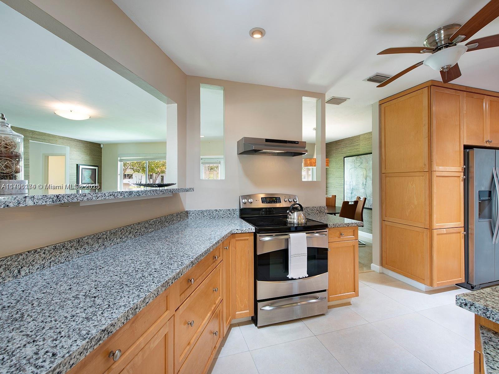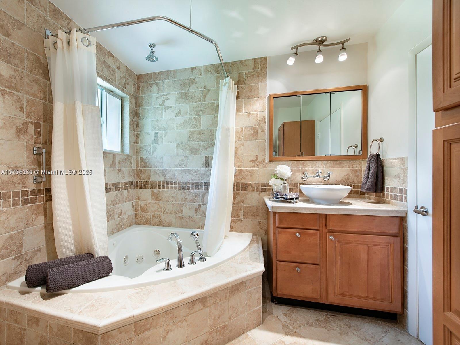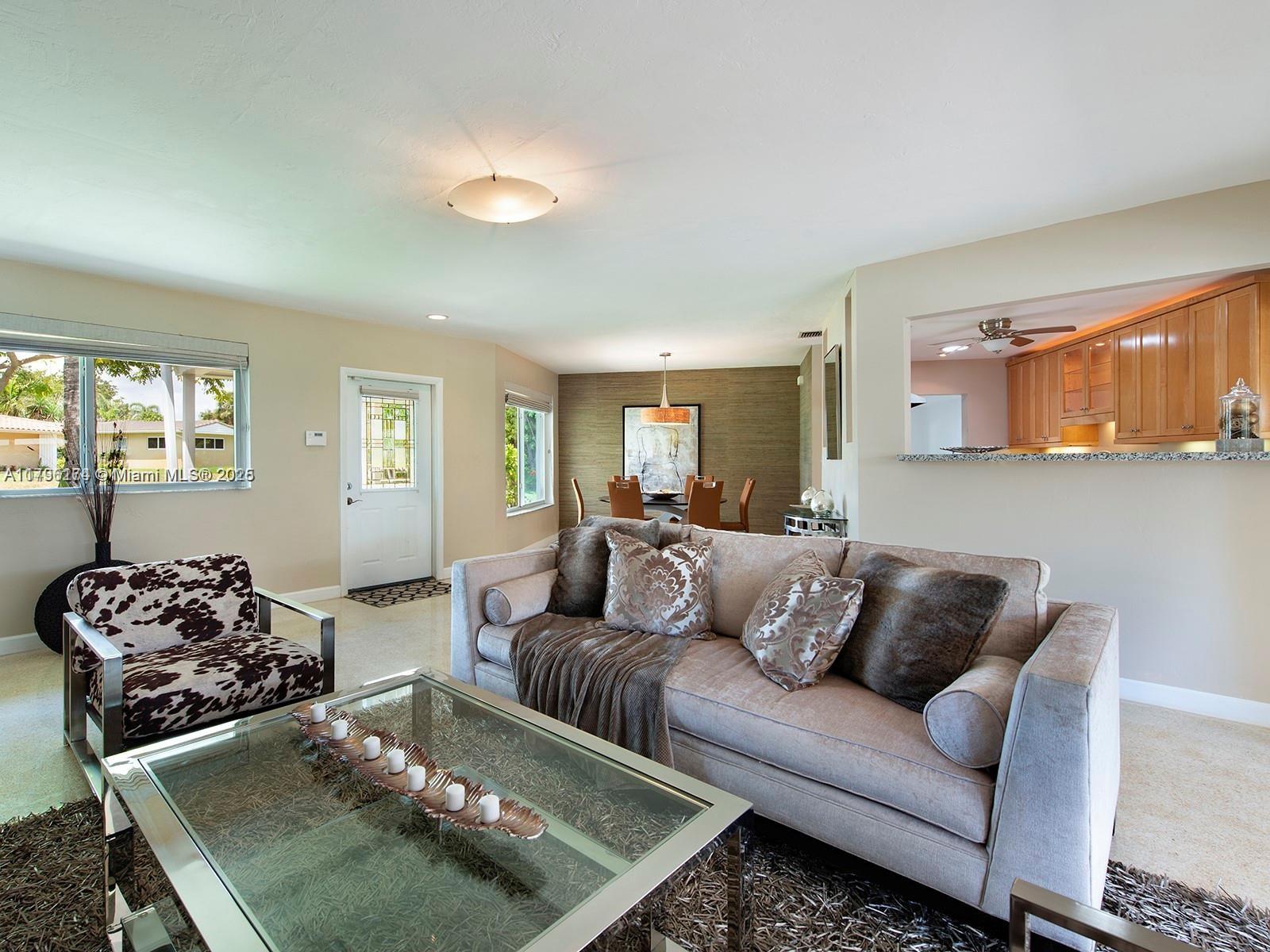 Spacious mid-century modern family home, located on an expansive, oversized lot in Miami Shores, steps from the golf course and Miami Country Day School. Comfortable split floor plan includes 4 bedrooms, 3 bathrooms, laundry room, storage room, double carport, large driveway. Original terrazzo floors in the living room extend into a bright, window-lined Florida room that overlooks stunning, recently updated pool (2019). Separate cabana perfect for entertaining or an artist studio. Notable features include mature landscaping providing privacy and shade, skylights, impact windows, stainless steel appliances, and granite countertops. This exceptional property presents a rare opportunity to purchase a large 2799 SF home with ample room for expansion on 17,875 SF lot. Photos 2018. Needs TLC.