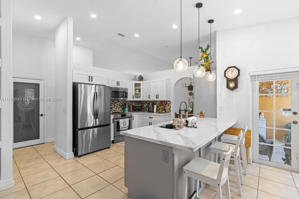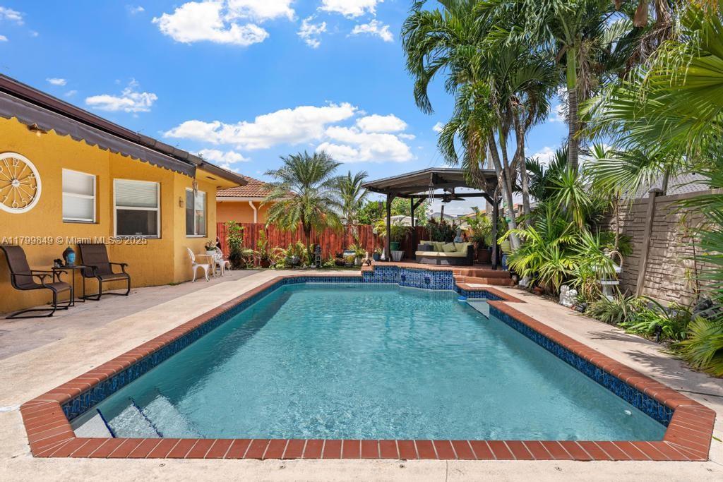 Welcome to your slice of paradise in the desirable Miami Lakes area! This beautifully designed 3-bedroom, 2-bathroom home is perfect for families and entertainers alike. Step inside to discover a brand-new kitchen that boasts elegant marble countertops and modern stainless appliances, ideal for culinary enthusiasts. The spacious master bedroom features a luxurious newly renovated bathroom, providing a serene retreat for relaxation. Enjoy Florida's sunshine in your expansive outdoor space, complete with a large pool, generous patio area, and outdoor kitchen, are perfect for hosting gatherings or simply lounging in the sun. With a two-car convertible garage and a spacious driveway, parking is never an issue. Don't miss your chance to make your dream home a reality!