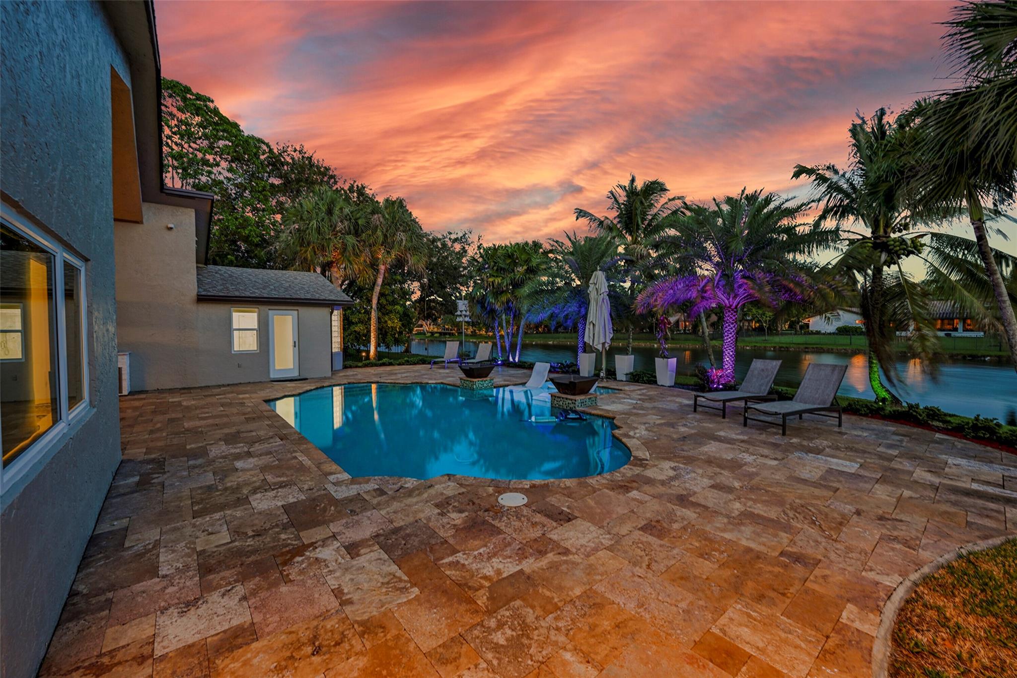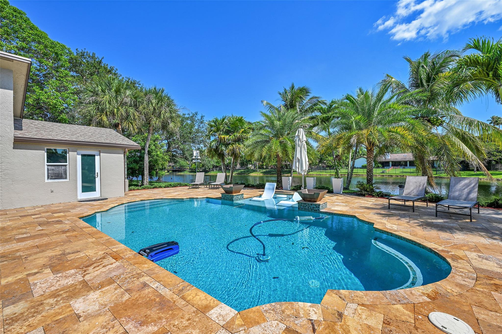 Discover refined living in the highly desirable Whispering pines community- where every home is uniquely crafted and surrounded by lush landscapes, peaceful water views and the soothing sounds of nature. This 5-bed, 3.5-bathroom estate is set on a builder's acre and offers the perfect balance of elegance and comfort. Designed with soaring 31-foot ceilings, the home features marble flooring in common areas, hardwood floors in bedrooms, and built in closets throughout. The oversized primary bedroom overlooks the pool. At the heart of the home is a chef-inspired kitchen outfitted with Thermador appliances and built in Miele coffee system. Step outside to your resort style backyard with heated pool, stunning water views, and a brand new in ground basketball hoop. This rare find won't last.