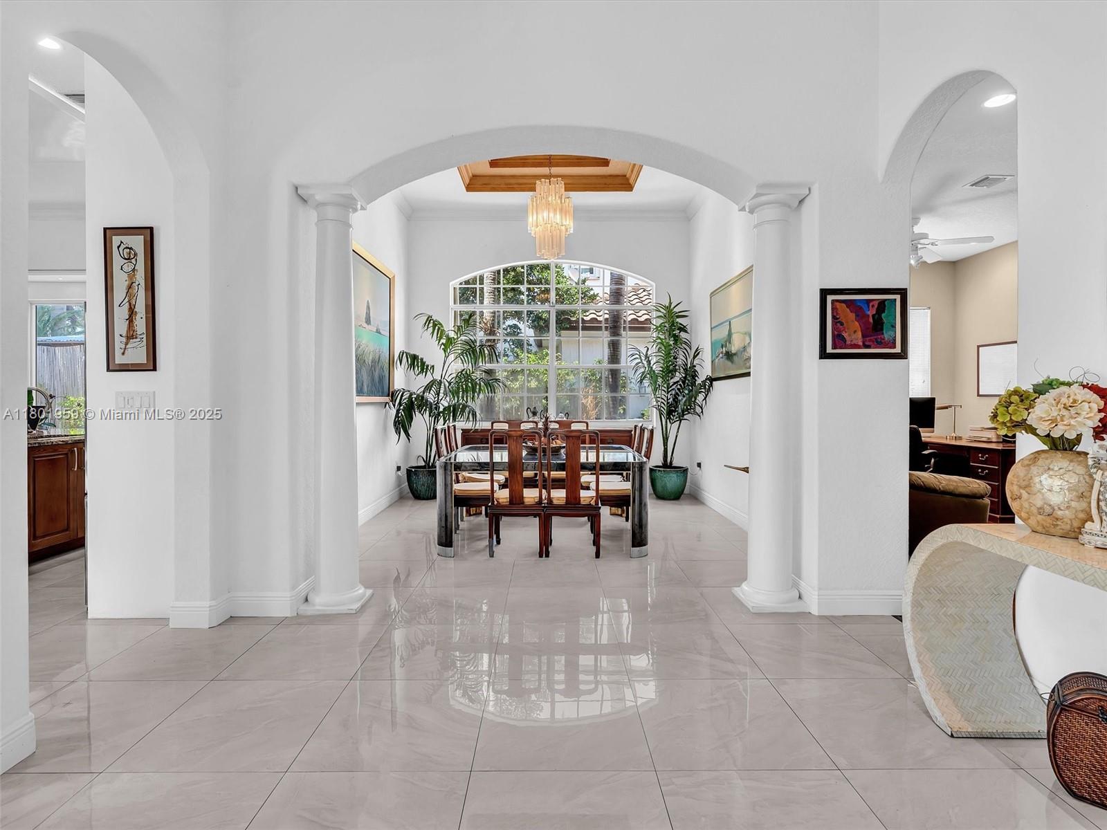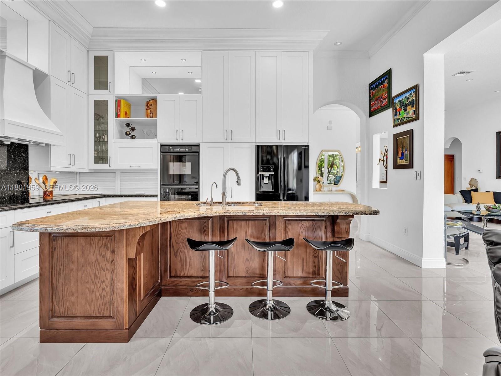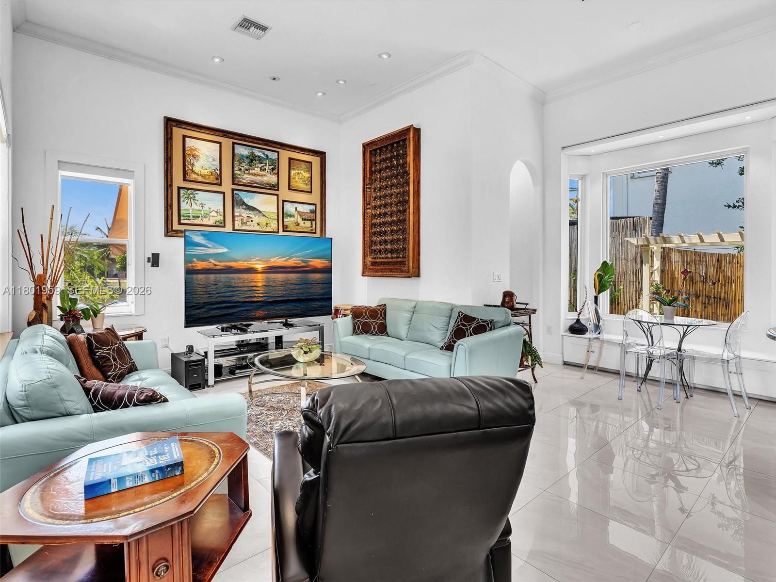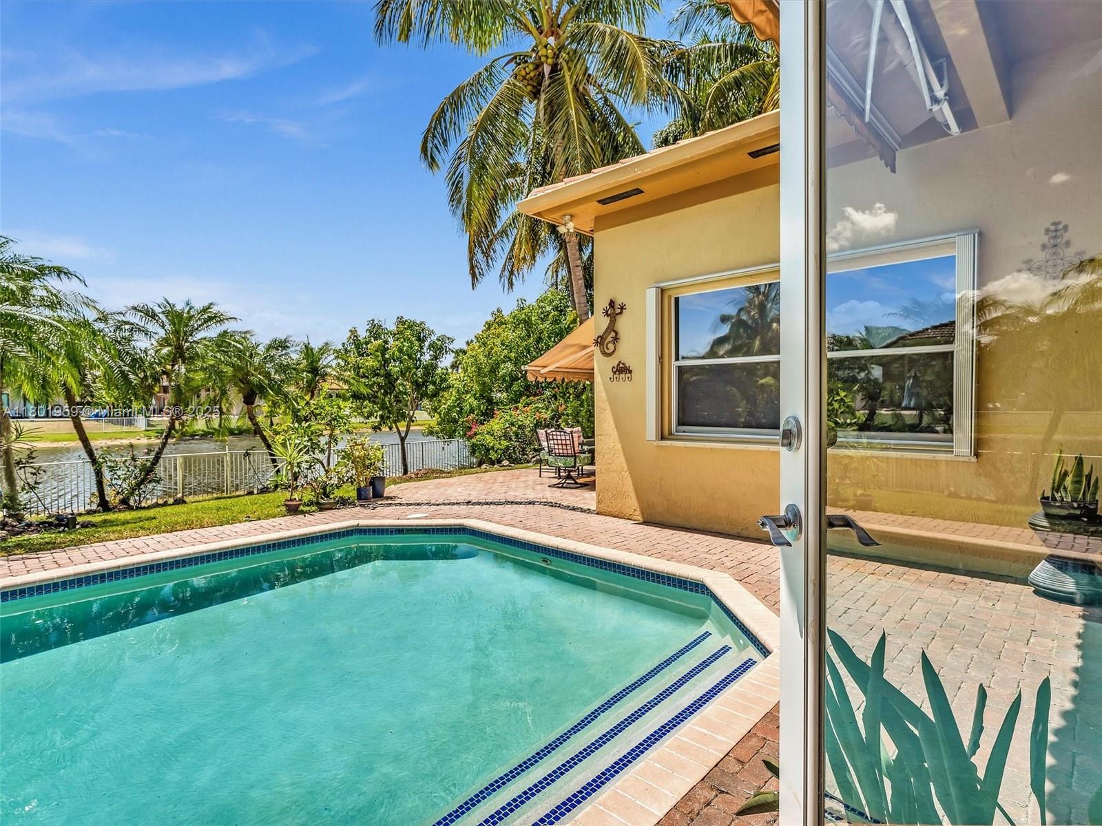 Bright and elegant 4-bedroom, 2.5-bath lakefront home located in the gated community of Sunset Isles at Sunset Lakes. Features an open floor plan with expansive windows and porcelain tile throughout. Updated kitchen with white custom cabinets, pull-out pantry drawers, granite countertops, mirrored backsplash, and breakfast nook with built-in seating and storage. Enjoy outdoor living with a private pool and lush backyard with fruit trees. Fourth bedroom currently used as an office. Original floor plan modified to expand social areas. All sliding doors are impact. Community offers resort-style amenities including clubhouse, fitness center, tennis and basketball courts. HOA includes cable, internet, and alarm services.