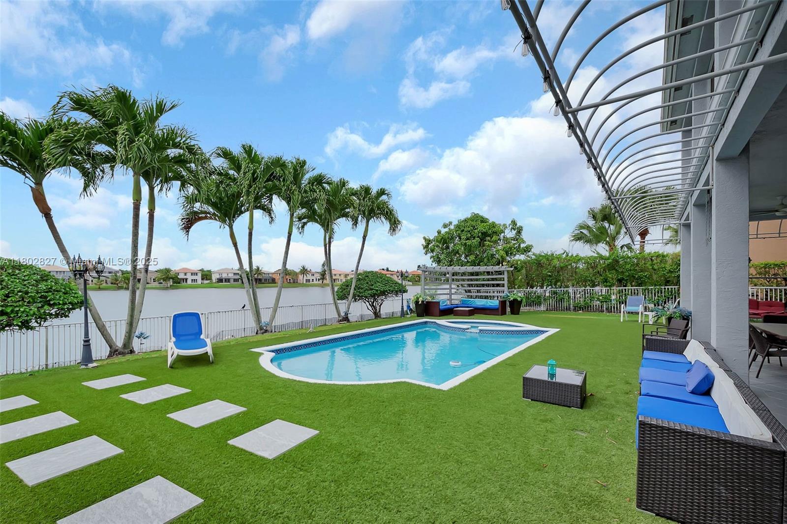 Modern oasis of elegance & luxury, offering spacious bedrooms w/plenty of storage, including a full bedroom & bath on the main level.The bright & open floor plan is highlighted by brand new floors & modern lighting, leading you to a gourmet island kitchen.The renovated kitchen and bath, coupled w/high ceilings & chandeliers, add a touch of grandeur throughout. Relax in the master suite, w/large balcony that offers wide, breathtaking lake views. The home features various spaces for entertainment,& a fantastic backyard—an entertainer's dream. Enjoy the outdoors with a private terrace, balcony, patio, below ground pool. Amenities communal tennis court, gym, clubhouse, basket ball courts and guard athe gate. A true gem in Miramar, this home is ready to welcome you.