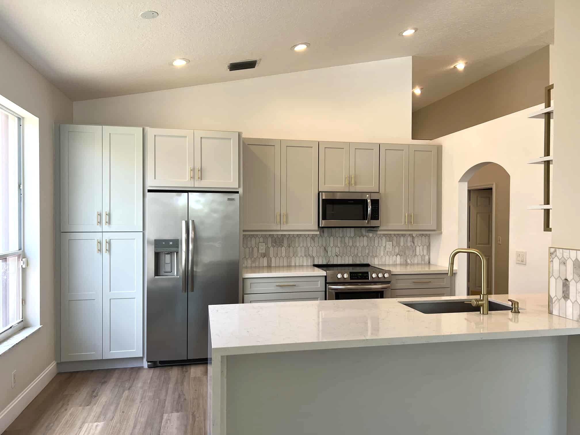 Discover this spacious 3-bedroom, 2-bath single-family home with a 2-car garage, complete with a sparkling pool under a domed screen enclosure. Inside, laminate flooring flows throughout the home. The kitchen features elegant quartz countertops, shaker-style cabinetry, and sleek stainless-steel appliances, ideal for both everyday living and entertaining. The primary suite offers a luxurious retreat with a Roman tub, separate shower, dual vanities, and a large walk-in closet. Located in the Starlight Cove neighborhood where residents enjoy access to a clubhouse, community pool, and pickleball court. Situated just 7 miles from the Boynton Harbor Marina and popular waterfront dining and only 8 miles from Ocean Front Park and beach. 7 miles to