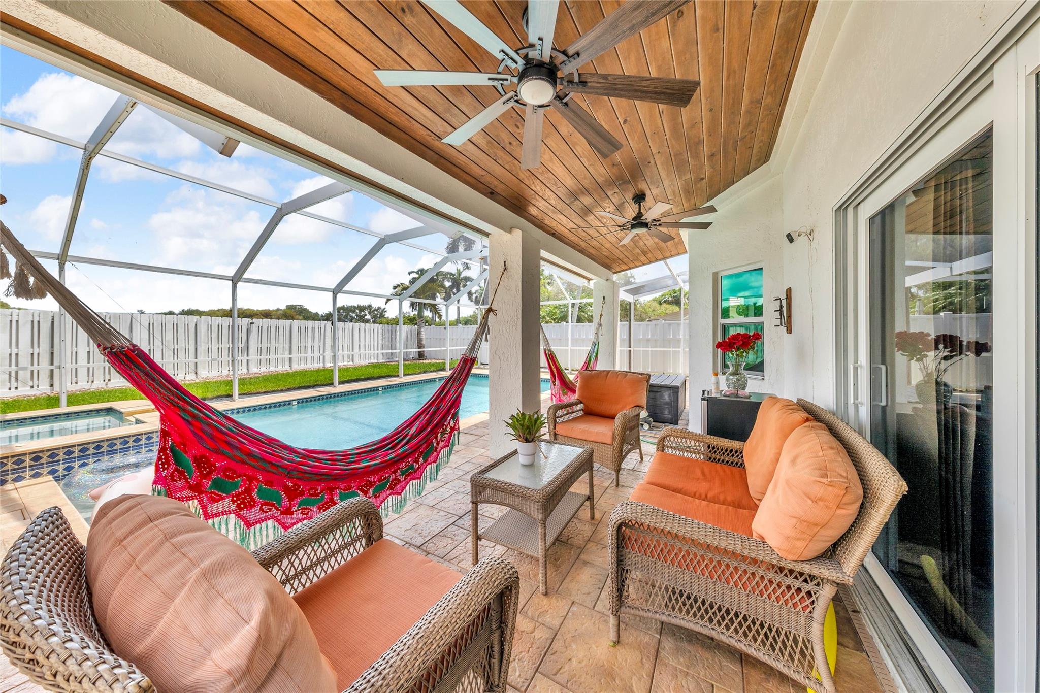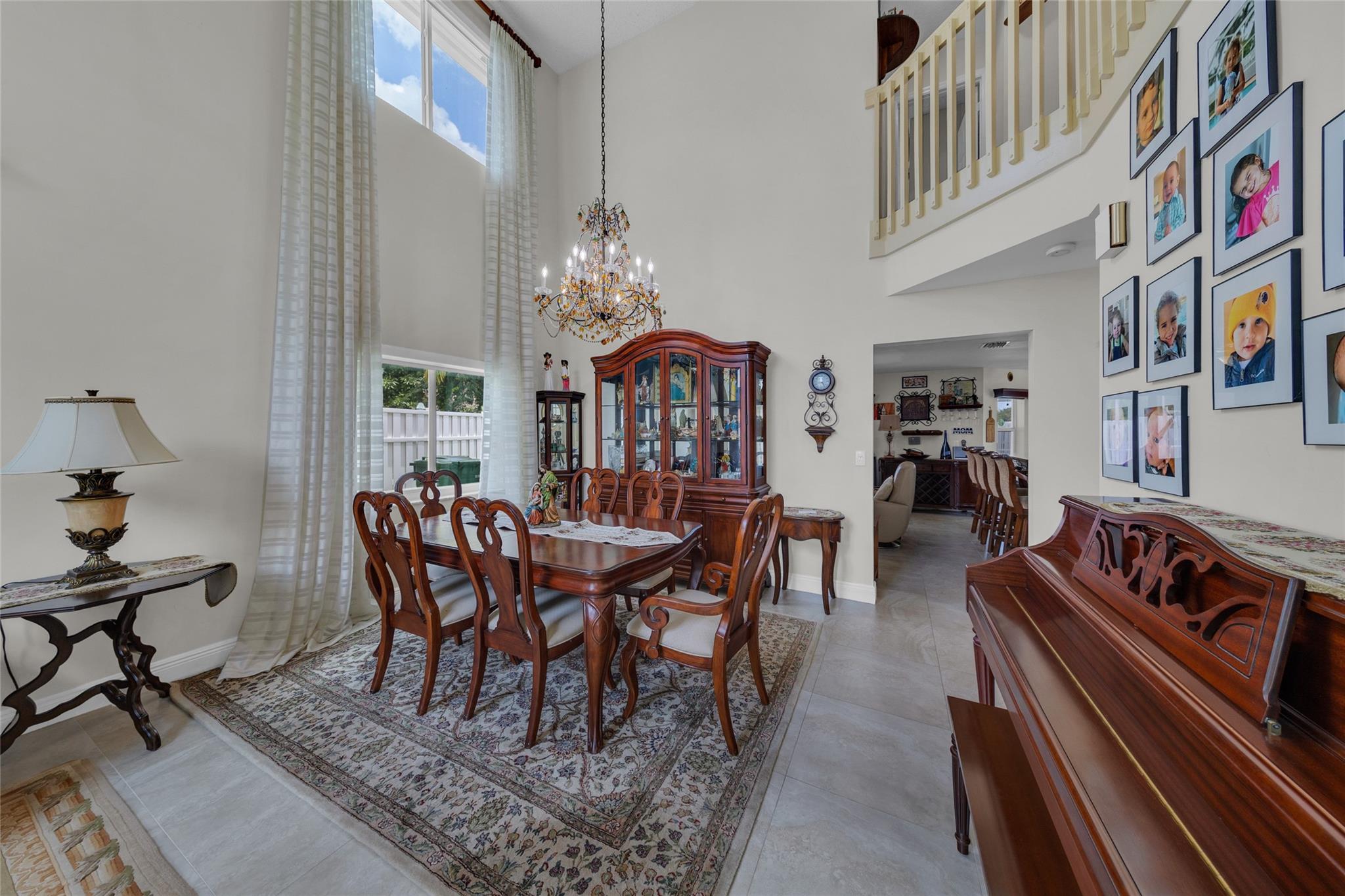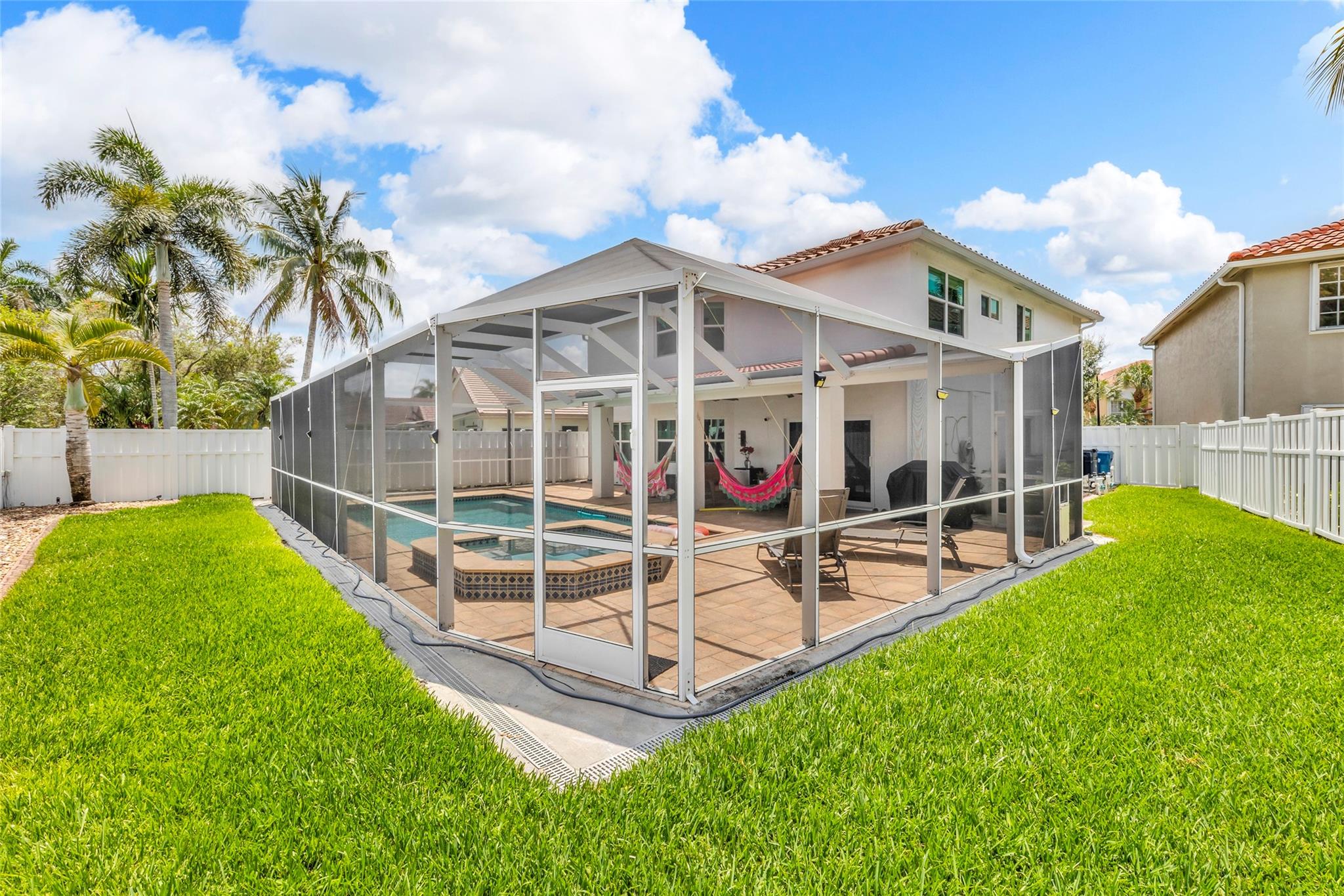 Rare 5 bedroom model with full bedroom & bathroom downstairs. Soaring double height ceiling in main living area along with open concept kitchen/family room. Primary suite upstairs is HUGE. Original owners have updated the ROOF (2021) and all bathrooms with contemporary look. Sparkling screen-enclosed saltwater pool has hot tub - relax and unwind! Home has IMPACT windows and doors, reverse osmosis water filtration system and gas water heater & dryer. Stove can be convered from electric to gas if desired. Extra large expanded driveway easily parks 4 cars - plus more in the 2 car garage. Appliance package is recent with double convection oven. 5 ton A/C is 4 years old. Imported Spanish porcelein tiles in downstairs living area.