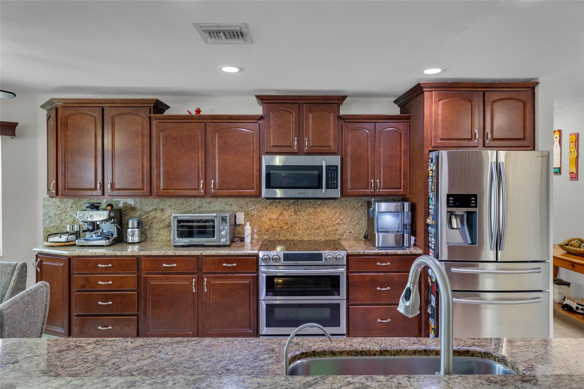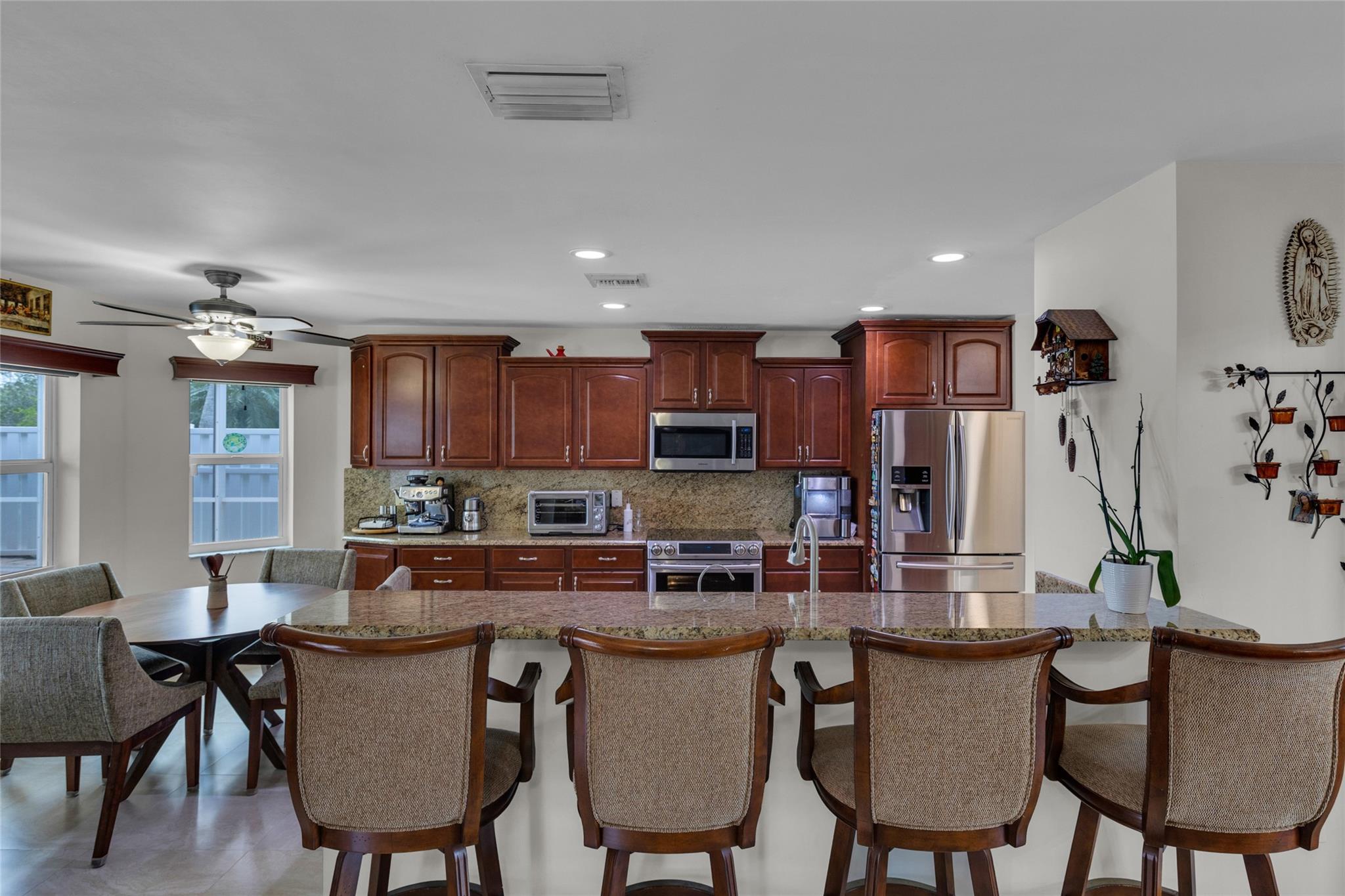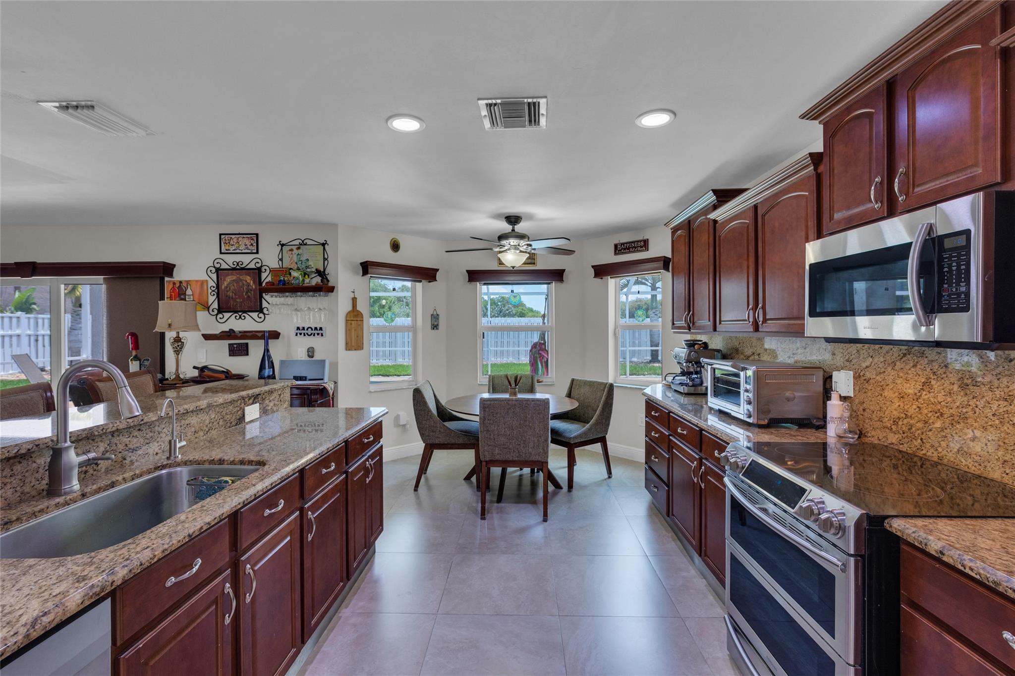 Rare 5 bedroom model with full bedroom & bathroom downstairs. Soaring double height ceiling in main living area along with open concept kitchen/family room. Primary suite upstairs is HUGE. Original owners have updated the ROOF (2021) and all bathrooms with contemporary look. Sparkling screen-enclosed saltwater pool has hot tub - relax and unwind! Home has IMPACT windows and doors, reverse osmosis water filtration system and gas water heater & dryer. Stove can be convered from electric to gas if desired. Extra large expanded driveway easily parks 4 cars - plus more in the 2 car garage. Appliance package is recent with double convection oven. 5 ton A/C is 4 years old. Imported Spanish porcelein tiles in downstairs living area.