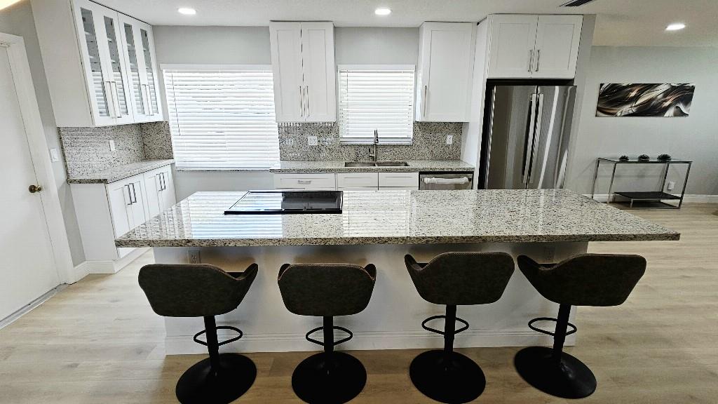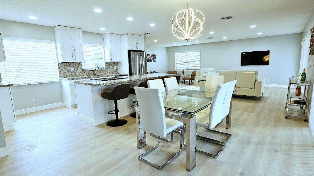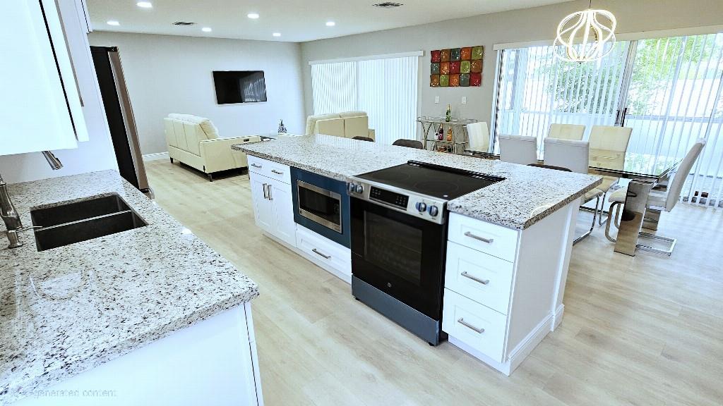 Welcome to your totally renovated, completely open floor plan, move in ready, 2-bedroom 2-bathroom private home in the desirable 55+ Single Family Home section of the Lucerne Lakes Community. The 2025 home renovation includes a brand-new roof, new central air conditioner, new breaker panel, new custom kitchen cabinets, new granite counters, new bathrooms, new hurricane rated garage door and opener, new patio rescreening, new luxury vinyl floors, new textured ceilings, new baseboard, new recessed lighting, and new interior and exterior paint. The dream kitchen includes a brand-new GE stainless steel appliance package. The new modern custom kitchen includes all wood shaker cabinets with soft close doors and drawers. The oversized island includes a slide in stove and built-in microwave.