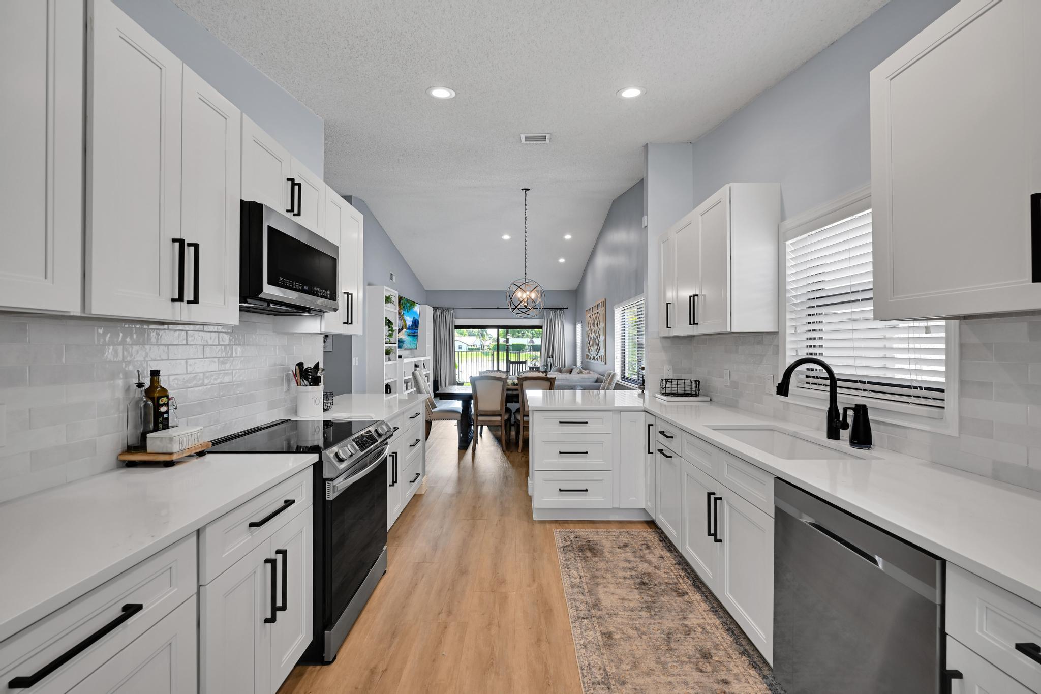 Welcome to your dream home in Boca Raton --no age restrictions, no mandatory membership fees! Enjoy stunning lake views and sunsets from this fully renovated 3-bed, 2-bath gem. Features include marble mosaic and LVT flooring, a sleek white kitchen with quartz counters, soft-close cabinets, and SS appliances. Vaulted ceilings add elegance, while the split floor plan ensures privacy. The primary suite boasts a luxe vanity and modern shower. Complete with impact windows/doors, newer AC (2020), water heater (2020), and more updates through 2023. Top-rated schools. Paradise awaits--book your private showing!