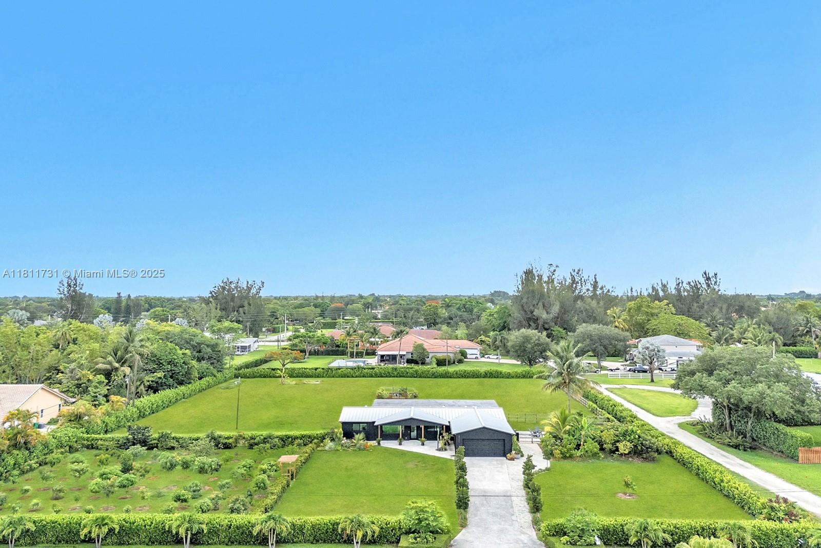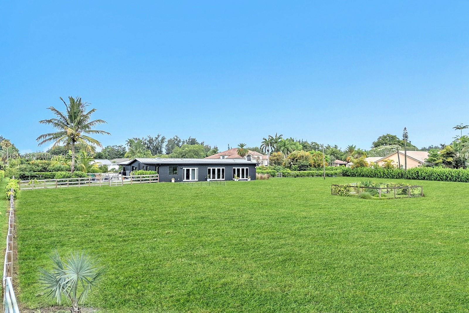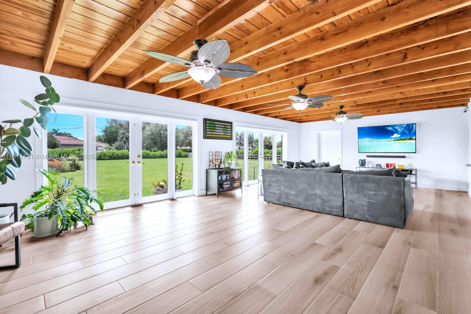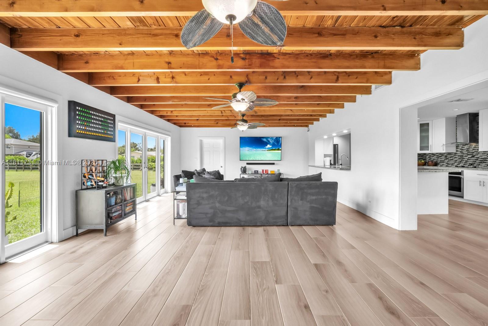 Gorgeous 4 bed 2.5 bath one-of-a-kind home nestled on spectacular 2 acre premium lot on charming street in the heart of equestrian friendly city of Davie. Tastefully updated home features new floors throughout. Kitchen has sleek cabinets w glass accent doors, stainless appliances & range hood. Spacious living room and family room that showcases a wood beam ceiling w 2 sets of french doors to an expansive fully fenced backyard. Triple split floor plan is desirable & versatile. Large primary bedroom w en-suite & view of the grounds. Freshly painted inside & stylish paint outside. Welcoming curb appeal, landscaping is so pretty, including private grove w a variety of fruit trees. Additional highlights: large laundry room, impact doors & windows, metal roof, new ac and water heater.