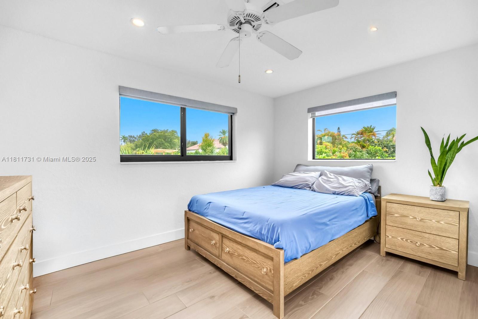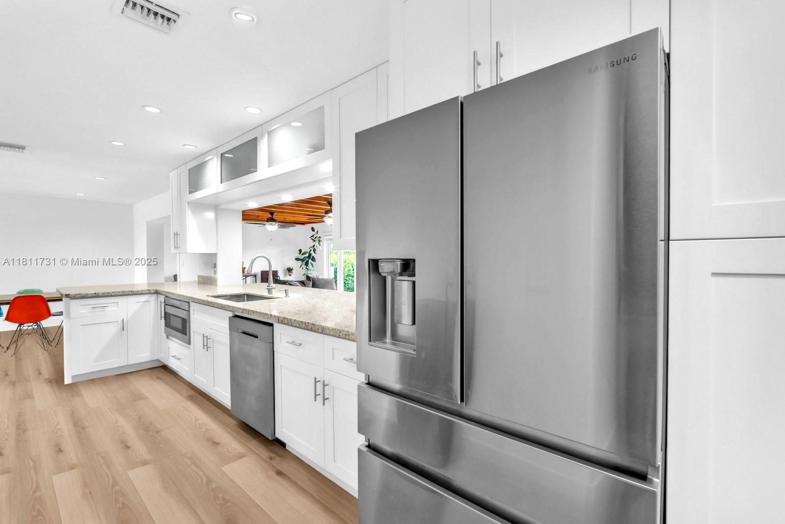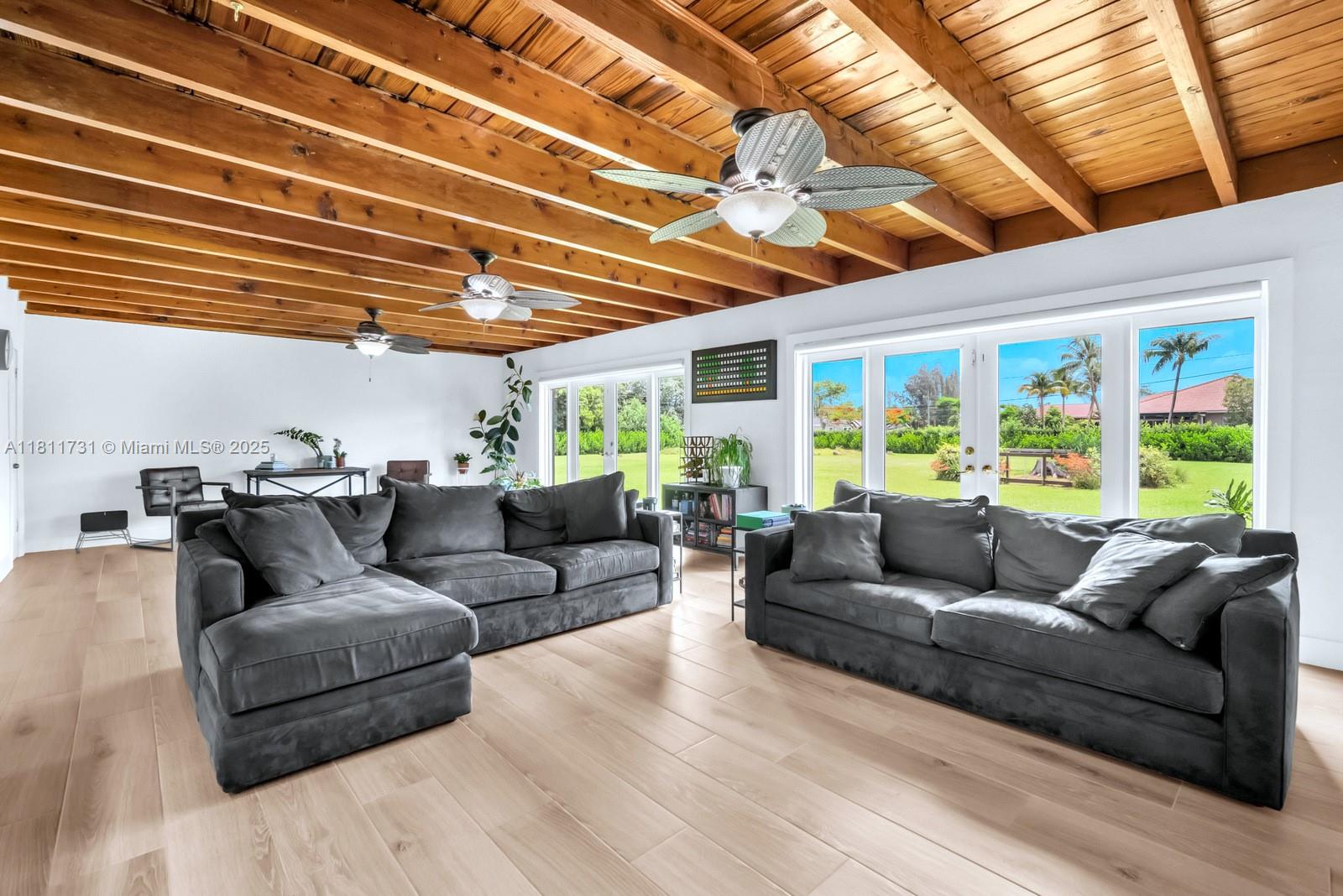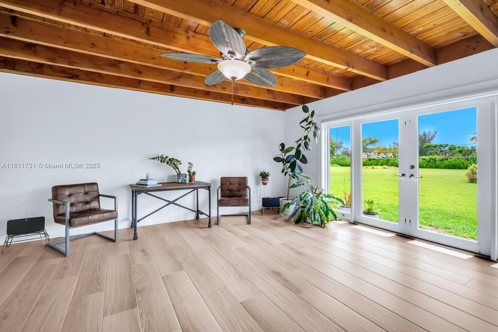 Gorgeous 4 bed 2.5 bath one-of-a-kind home nestled on spectacular 2 acre premium lot on charming street in the heart of equestrian friendly city of Davie. Tastefully updated home features new floors throughout. Kitchen has sleek cabinets w glass accent doors, stainless appliances & range hood. Spacious living room and family room that showcases a wood beam ceiling w 2 sets of french doors to an expansive fully fenced backyard. Triple split floor plan is desirable & versatile. Large primary bedroom w en-suite & view of the grounds. Freshly painted inside & stylish paint outside. Welcoming curb appeal, landscaping is so pretty, including private grove w a variety of fruit trees. Additional highlights: large laundry room, impact doors & windows, metal roof, new ac and water heater.