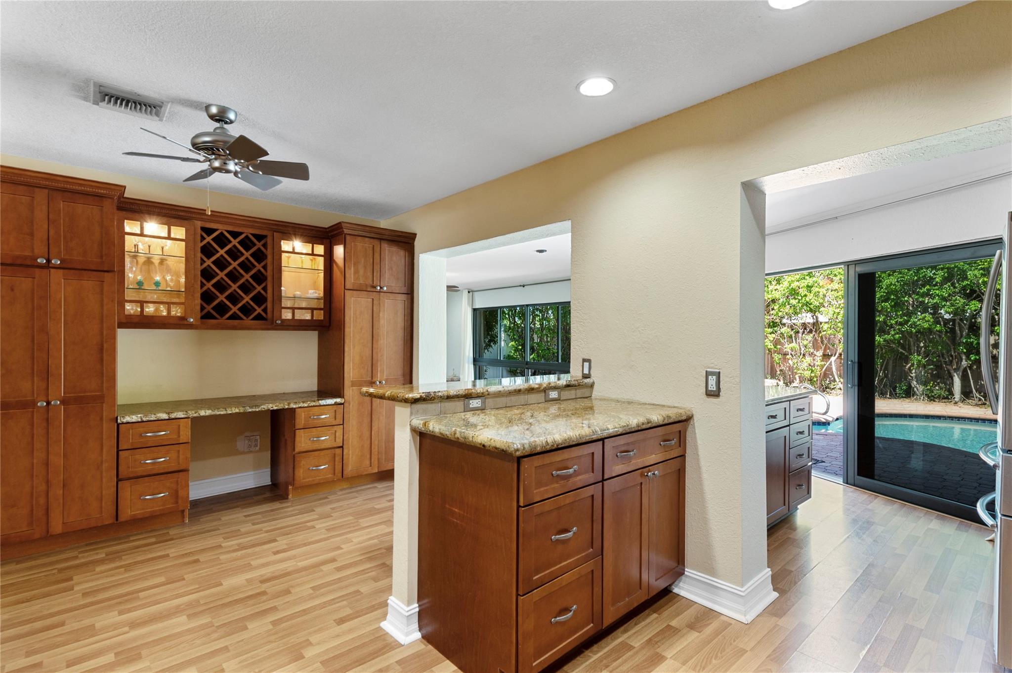 3 /2 home w/over 1900 sqft w/ a small garage, pool and oversized corner lot. Updated kitchen, all new stainless steel appliances, Samsung refrigerator, GE dishwasher & Frigidaire Double oven with wood cabinets, granite counter tops, large pantry. Large family room w/ a real fireplace, Floor to ceiling impact windows w/ pool access. Home has a fully fenced backyard to allow for animals so they cant get out. Kidney shaped Pool with firepit complete w/ stone pavers. Roof is in excellent shape with concrete barrel tiles with, 10 years of life left. A very spacious laundry room. 3rd bedroom can be used as an office or bedroom. Second bedroom in the corner with full bath with tub/shower across the hall, Master bathroom updated with dual sinks, standup shower w/ additional A/C