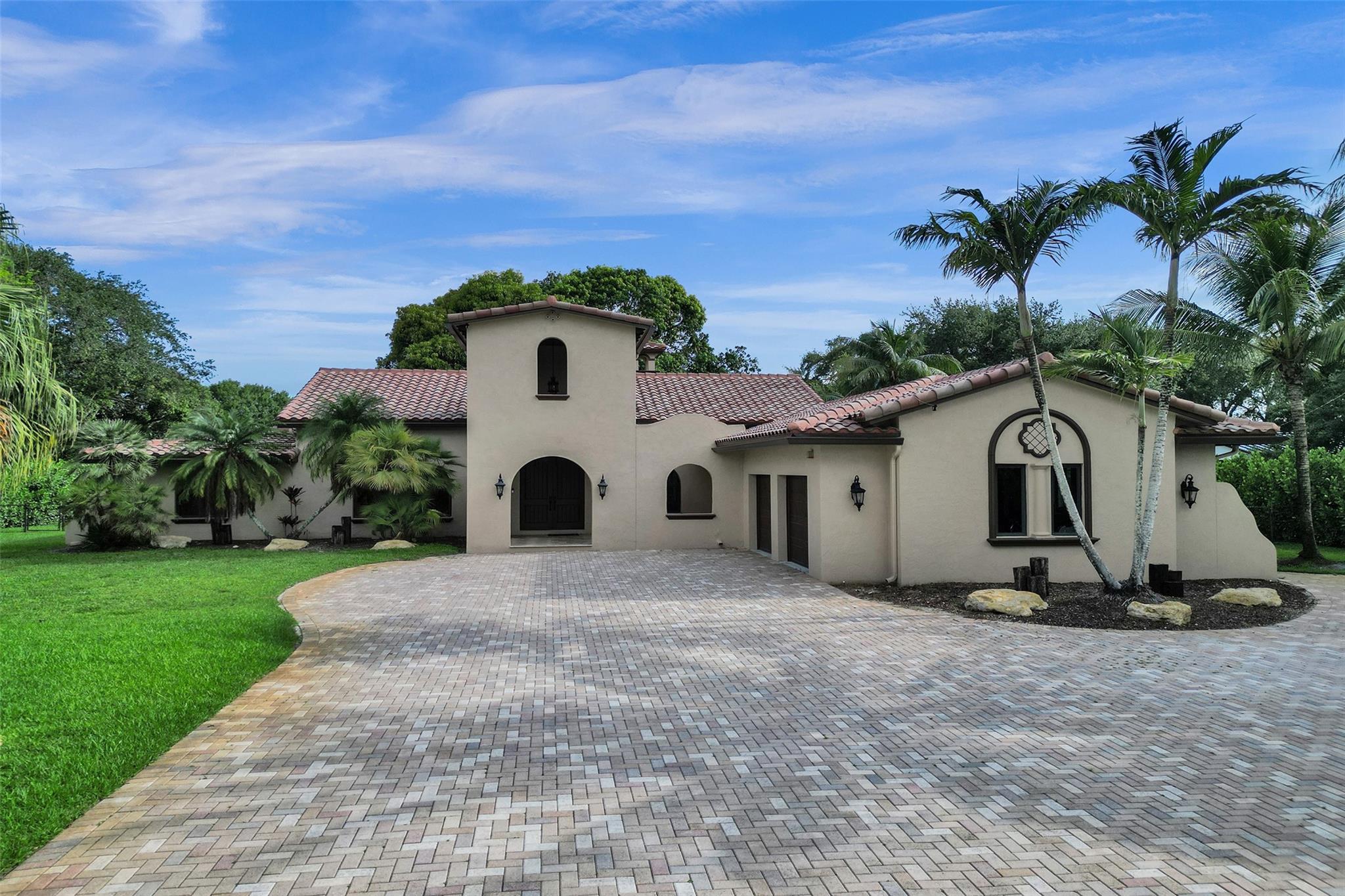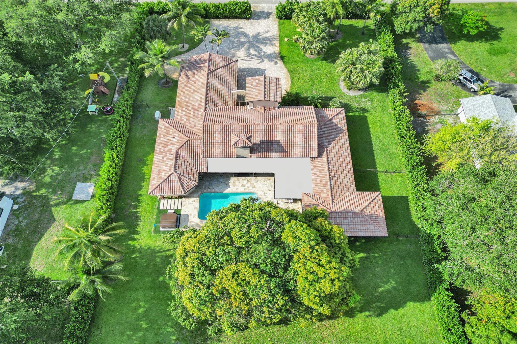 STUNNING CORAL GABLES-STYLE ESTATE ON 1.23 ACRES! This 6 bed/5 bath residence impresses with soaring 12–14 ft ceilings and a dramatic 20-ft tower entryway. Elegant travertine flooring in the front porch and the spacious poolside patio deck—perfect for entertaining. 2 luxurious master suites, one of which can function as a private guest suite with its own entrance. Impact windows and doors throughout offer peace of mind. Enjoy the bounty of nature with a variety of mature fruit trees, including 7 mango, 1 lychee, 1 avocado, and 6 coconut palms—9-zone sprinkler system sourced by a private well. Oversized 2-car garage with impact windows. Expansive paved driveway. 22KW generator. Fully fenced yard and a 10-ft clusia hedge for maximum privacy. NO HOA, in a quiet and desirable neighborhood