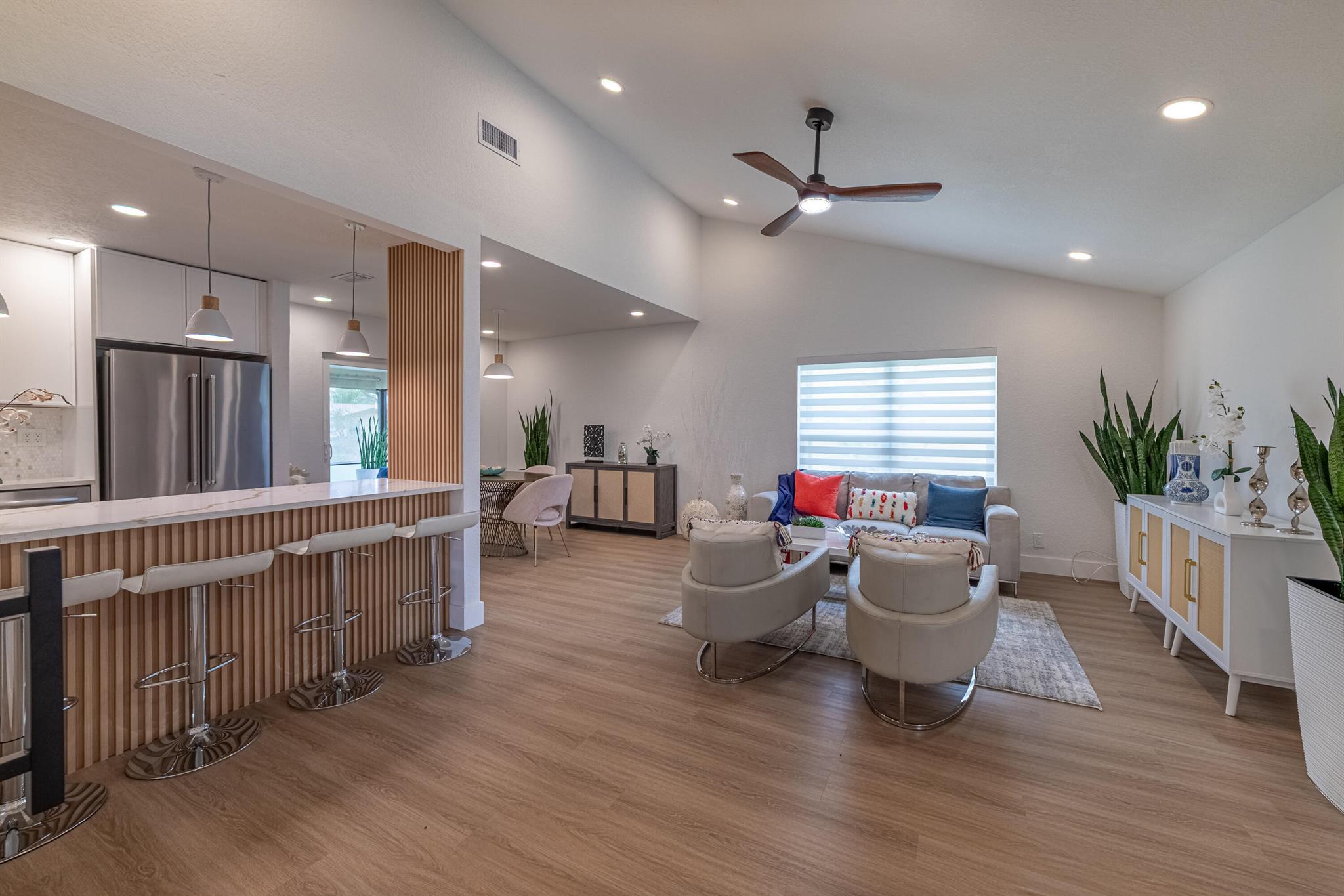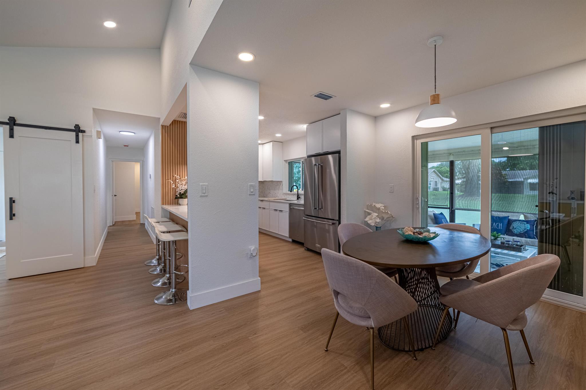*+55 *. All is top of the line in this designer house! first the location, +8000 SFT lot on a very quiet cul de sac with well maintained houses around. Second the roof was installed in 2021, the impact windows were installed in 2012 with permit, including the sliders leading to a beautiful large patio. A new Trane AC system. The main living area has an open concept kitchen with Kitchen Aid appliances! A snack bar and a gorgeous white quartz counter top. Gorgeous waterproof vinyl floor looking like real wood. Recessed ceiling lights in all rooms, 3 good size bedrooms and 2 new bathrooms, one of the bedroom opens on the living area through a large barn door There is a covered patio with a peaceful nature view. A one car garage, a washer and a dryer dedicated area completes this perfect home