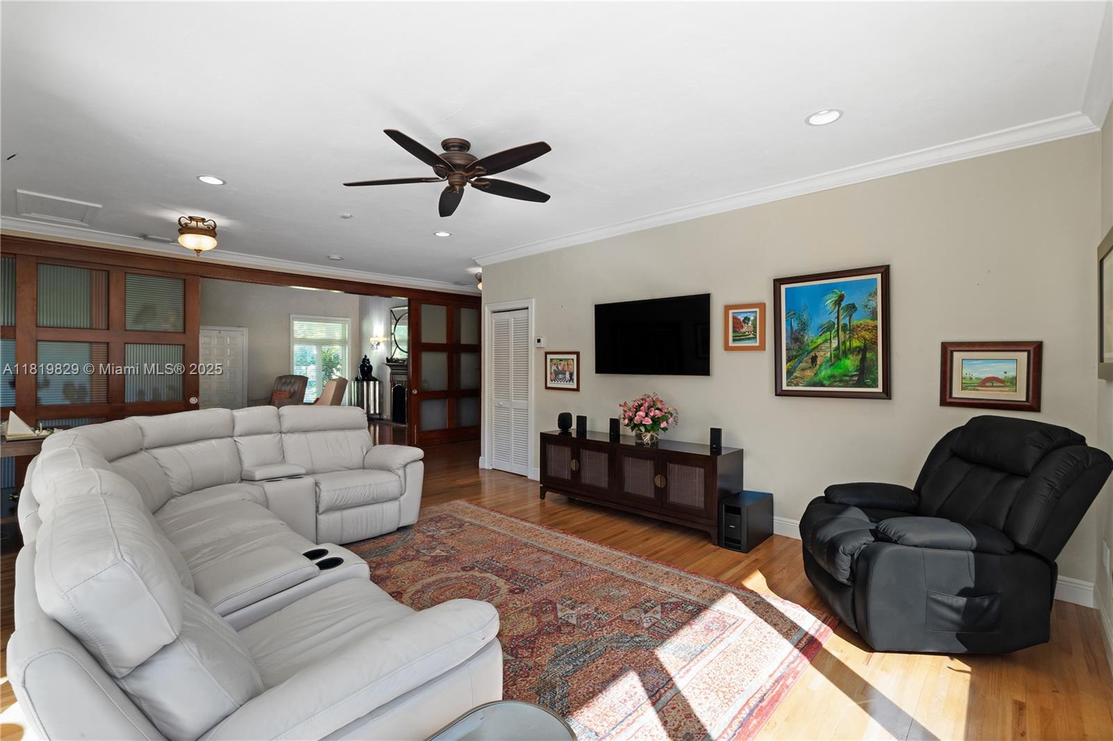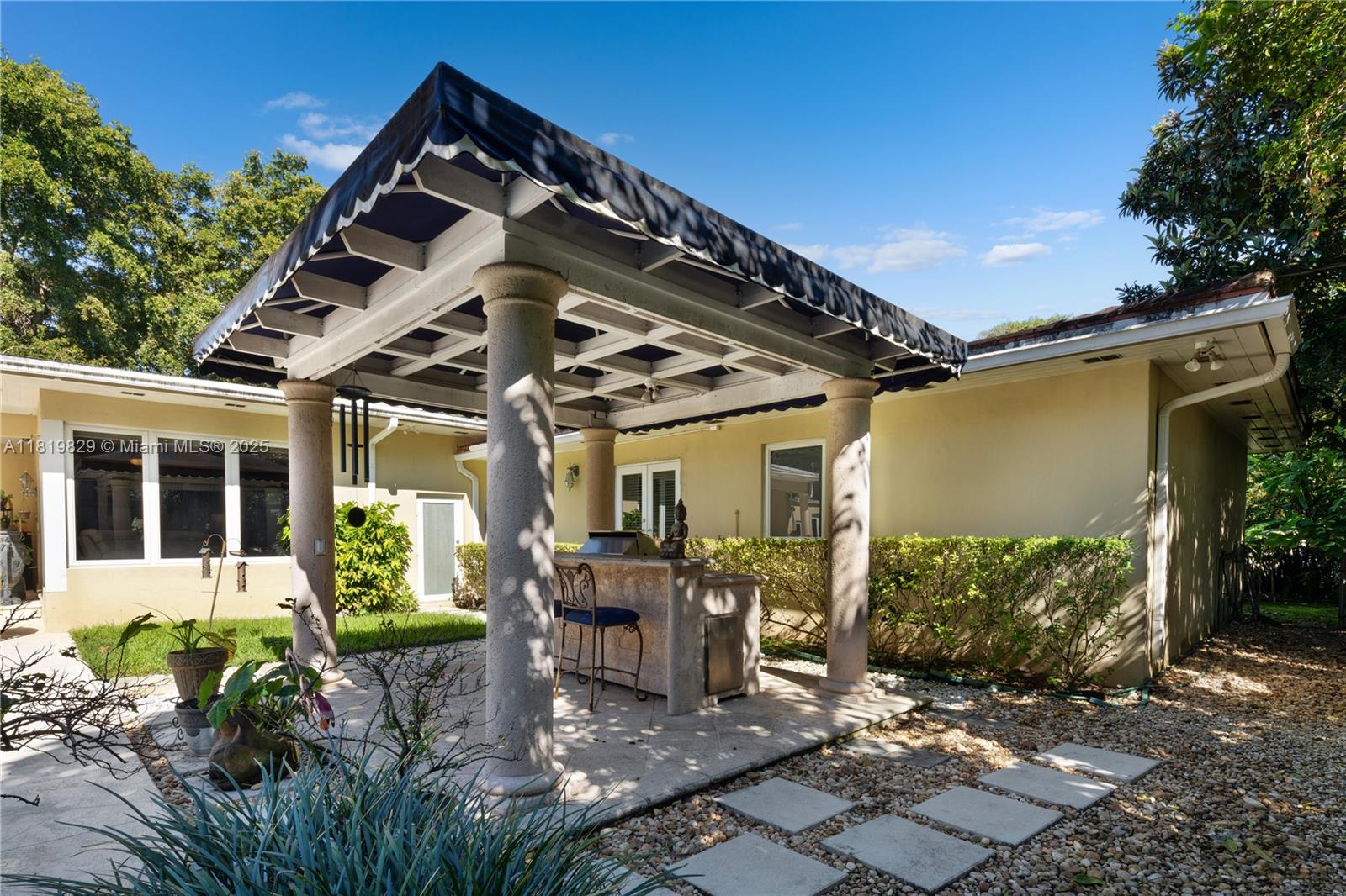 Situated on a double lot (18,000SF) across from the Biltmore Golf Course on Mariola Court, this exceptional home offers a blend of privacy and prime location on a peaceful street. Vaulted ceilings in the living room create an airy, open feel, while the expansive primary suite features a sitting area, two walk-in closets, double sinks, a soaking tub, and a spacious shower. Layout consists of the Primary Suite + 2 bedrooms, then 2 separate live-in quarters on service side of the home. Perfect for outdoor living, a private retreat with sparkling pool, a large covered terrace, and a detached gazebo with outdoor cooking. Impact windows and doors provide protection and efficiency, while a two-car garage adds convenience. A rare opportunity to enjoy Coral Gables living in a sought-after setting.