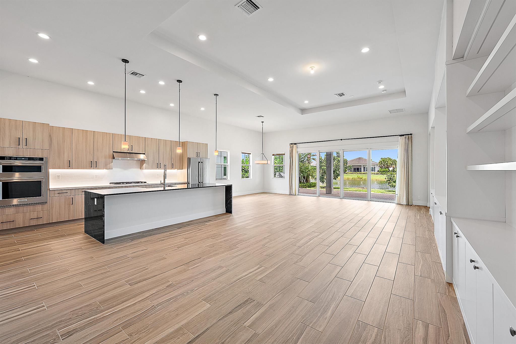 Located in the Tradewinds section of Regency at Avenir, this single-story Isabella model with contemporary elevation blends refined finishes with serene lakefront living. Enjoy panoramic water views from the great room, dining area, primary suite, and expanded covered lanai. Inside, 12' ceilings enhance the open layout featuring a gourmet kitchen with walk-in pantry, a spacious primary suite with dual closets and spa-inspired bath, and a versatile flex room perfect for a den, office, or hobby space. Live the lifestyle in this 55+ gated Palm Beach Gardens community offering resort-style amenities and a vibrant social scene.