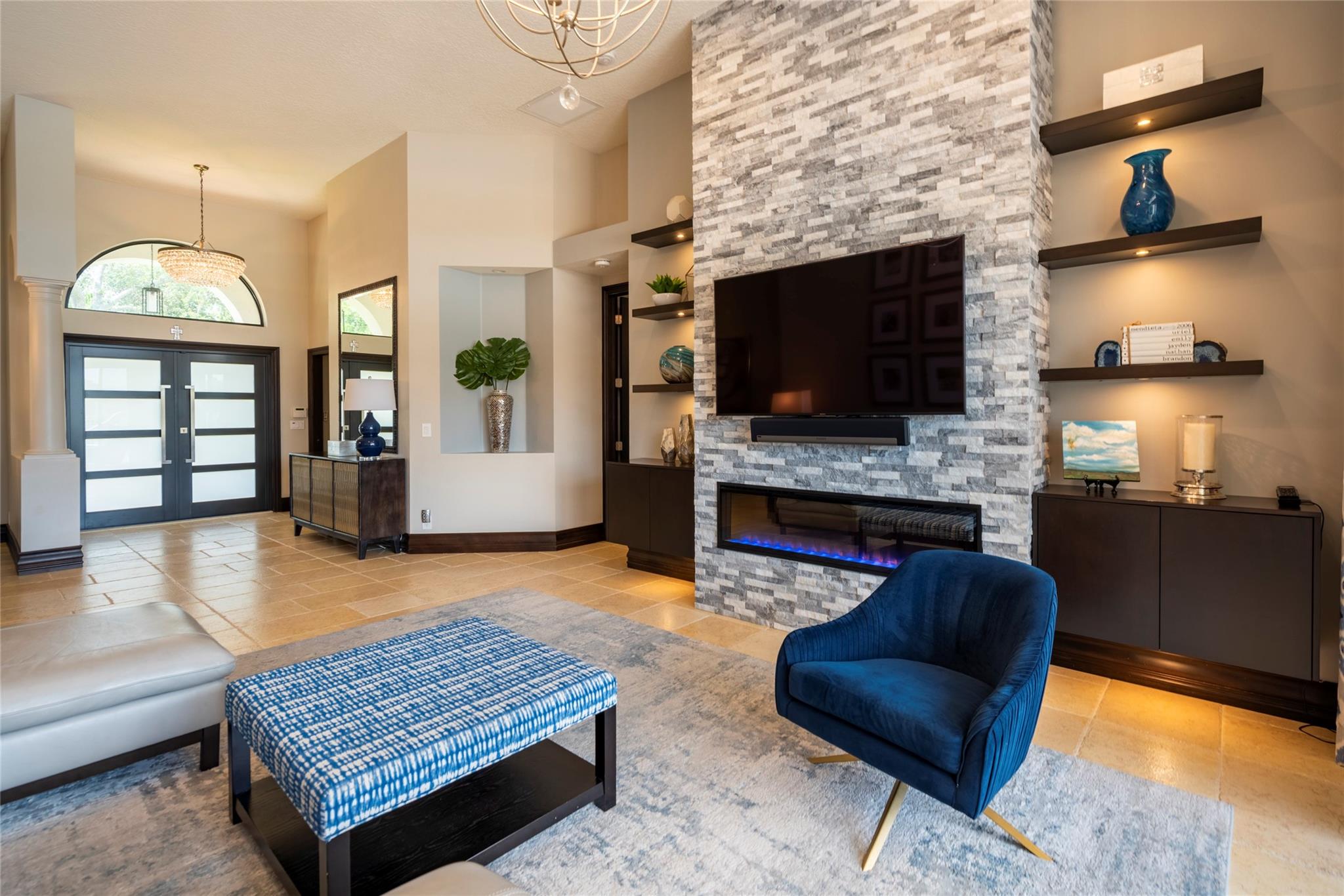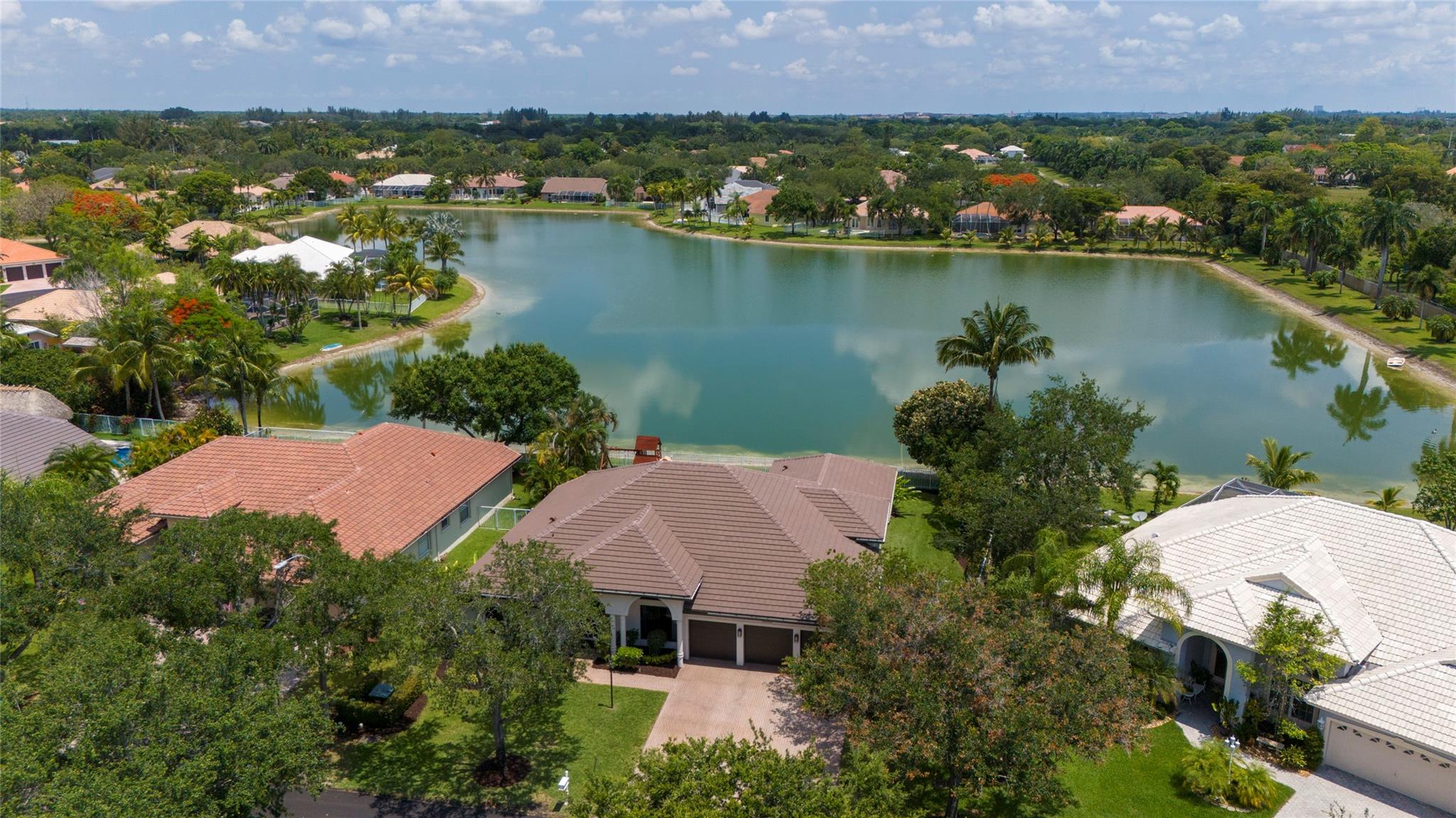 Stunning 5BR/3BA waterfront estate home in premium gated community. A new flat tile roof & front impact windows & doors highlight the substantial upgrades. The interior features a spacious open layout, soaring ceilings, renovated bedrooms & bathrooms, & amazing water views. The gourmet kitchen offers an over-sized island, granite countertops, stainless steel appliances, & custom cabinetry. The separate living & family rooms feature custom TV walls & an electronic fireplace, perfect for upscale entertaining or everyday family comforts. The private primary suite offers dual walk-in closets w/organizers, a luxurious ensuite bath & serene lake/pool views. Enjoy true resort-style, waterfront living w/renovated pool/waterfall & lush landscaping. Fenced yard. Newly paved streets, A-rated schools.
