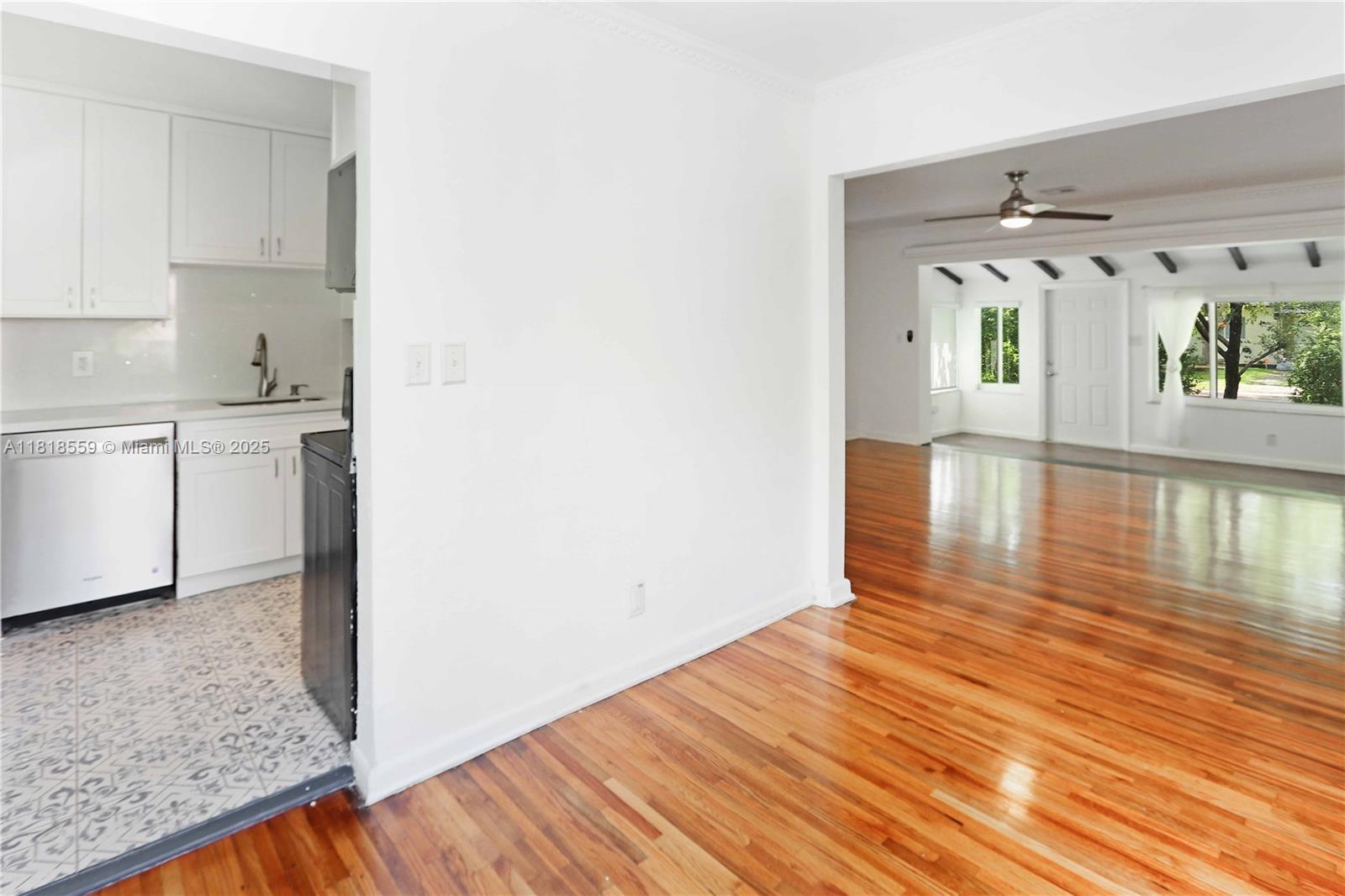 Welcome to this beautiful 2-bedroom, 2-bath home. Situated on a spacious corner lot. This 2-bedroom, 2-bath home includes a versatile additional room with its own cabana bath and private entrance—perfect as a home office. Step inside to original wood floors, crown molding, a kitchen updated with stainless steel appliances, quartz countertops, classic shaker cabinets, and an open living and dining concept. Enjoy the outdoors year-round with an open patio or under the shade of a majestic mango tree. You’ll also find mulberry, banana, and star fruit trees! Extra features include a large utility room, extra storage shed, 2020 shingle roof, and impact windows and doors!! Garage has been converted.