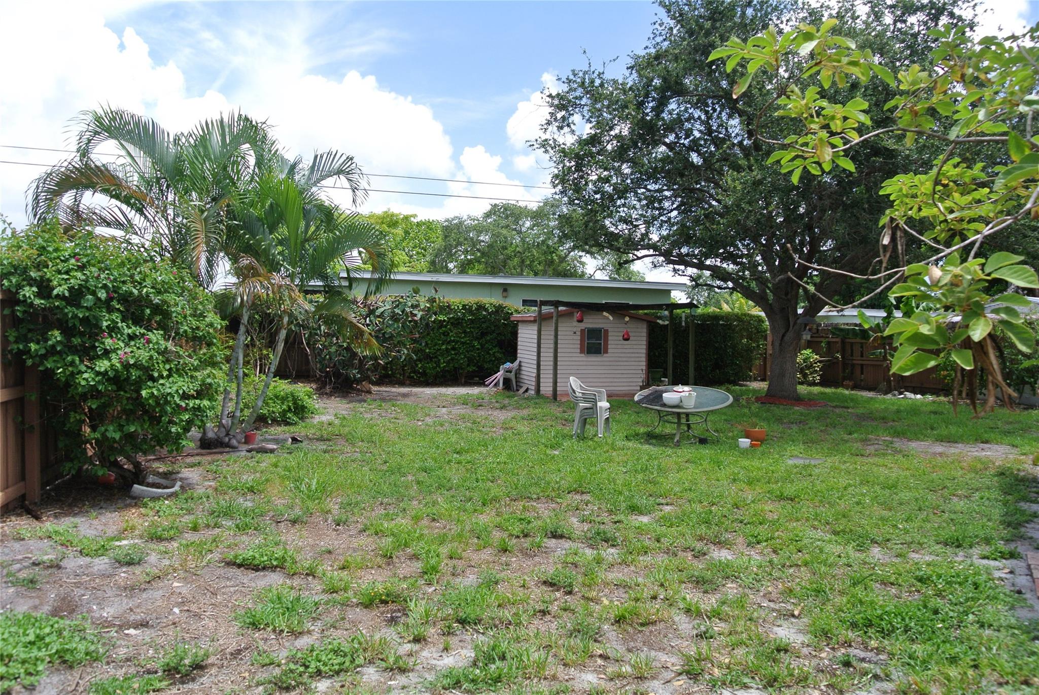 Unlimited possibilities in this charming and cozy single family home on corner lot with large circular driveway. Quiet and quaint neighborhood. Clean and freshly painted with detail trim around doors. Includes washer, dryer, whirlpool refrigerator and nice wood cabinets with tiled backsplash. Beautiful double glass doors lead to generous patio which is tiled and has screen enclosure for pets and children to enjoy. Huge backyard with banana tree, shed and completely fenced in. Room for an expansive pool and more! Roof is 2021. NO HOA. Centrally located. Minutes to the The Hard Rock Casino, amazing restaurants, great shopping and entertainment. Great Opportunity !