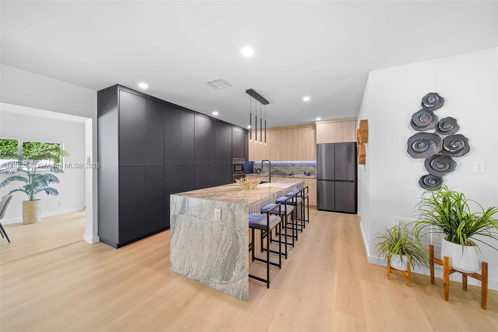 MUST SEE! If you're looking for one of the largest Biscayne Park 4-bedroom pool homes available, check this out (Bitcoin accepted)! Beautifully updated 4 bed-3.5 bath midcentury pool home ~3,000 SF of interiors on a large 11,585 SF lot. Great open flow plan, three living areas, dining room, and eat-in open island kitchen, plush multiple lush entertainment gardens. Four spacious bedrooms (two ensuites) including primary with majestic spa-like double-vanity bath, freestanding tub, and a massive shower with 16 power jets and dual rainfall shower heads. Great features: impact windows-doors, private powder room, huge 20’x40’ pool, multiple patios, mini golf, and outdoor moonlight movie screen. You’ll feel like you’re living in “paradise” in this dreamy Biscayne Park tropical resort-style home!
