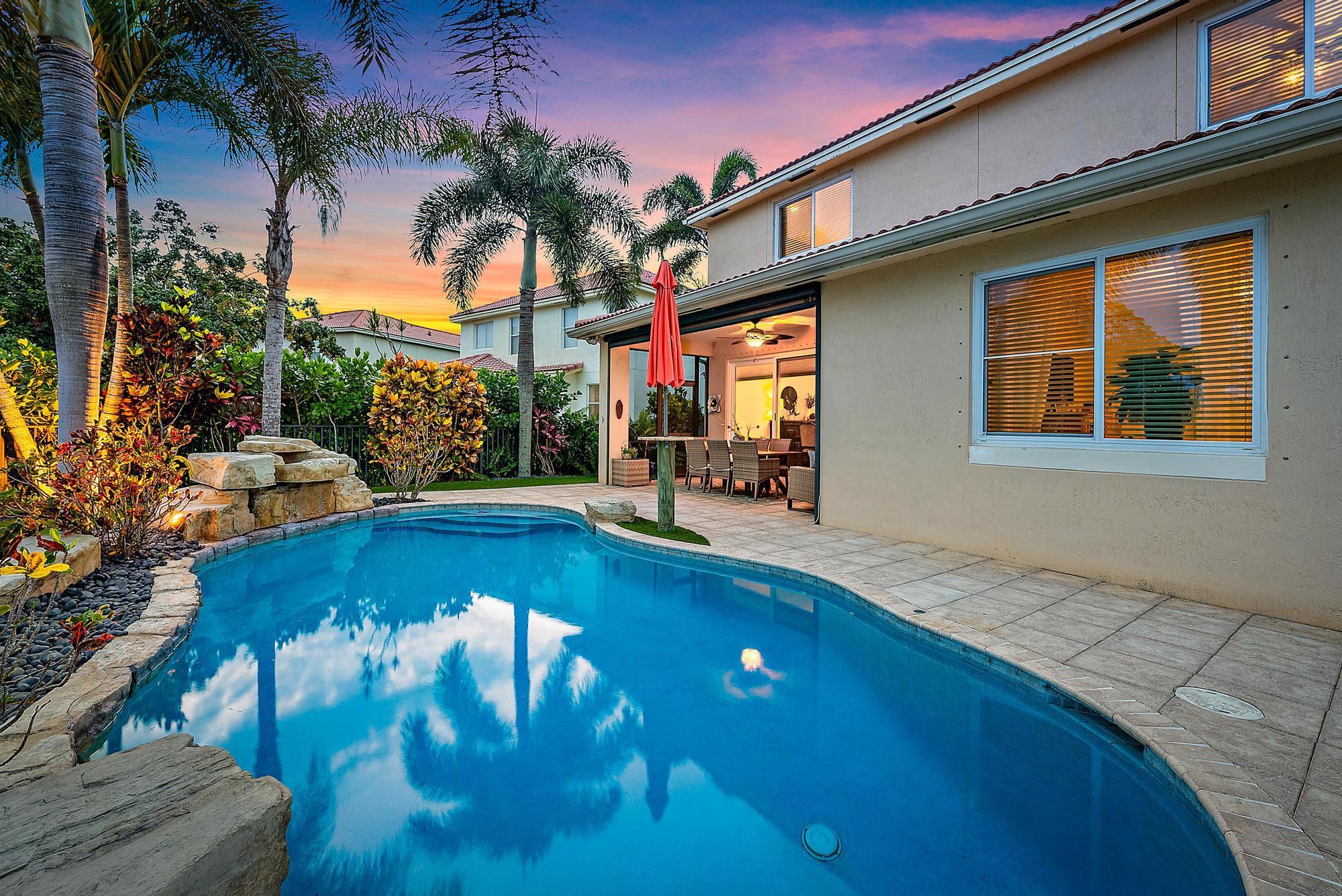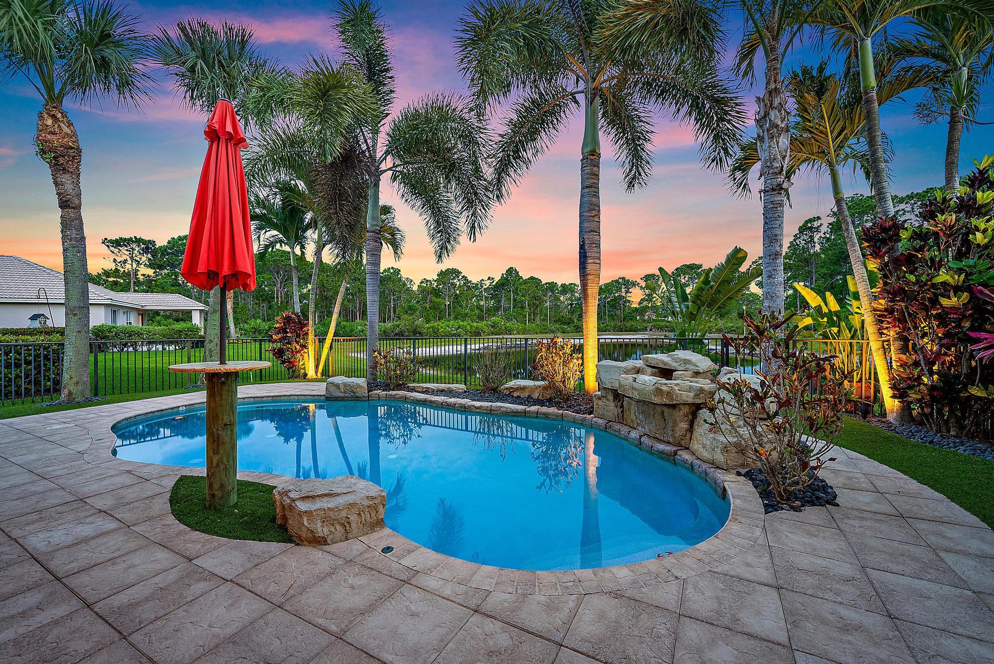 Experience LUXURY living in this stunning 4-bedroom, 3.5 bath pool home located in the sought-after Oaks of Hobe Sound. This beautifully designed lakefront residence offers the perfect combination of style, functionality, and peace of mind. Step inside to soaring 20-foot ceilings and an abundance of natural light. Features include a custom electric fireplace, wood-look porcelain tile throughout the main level, and IMPACT windows. The gourmet kitchen is complete with stainless appliances, double ovens, 42'' wood cabinetry, a center cook island, granite counters, and a picturesque window overlooking the pool and lake. The first floor primary suite is a true retreat, offering direct access through sliding doors to the pool, perfect for a peaceful morning dip or evening swim under the stars.