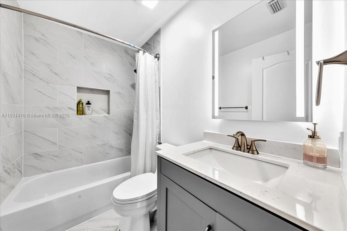 Welcome to this beautiful 3-bedroom, 3-bathroom home in the desirable Somerset Cove community. Two of the bedrooms feature their own private bathrooms for added convenience and privacy. The upgraded kitchen boasts elegant granite countertops and soft-closing cabinets. This home also offers a spacious walk-in closet, high ceilings, and neutral-toned walls, creating a modern, open feel. The new bathrooms, floors, AC, and roof enhance the home’s appeal. Enjoy the convenience of central air conditioning with WiFi control and partial accordion shutters for added security. A charming pergola in the backyard provides a perfect space for outdoor relaxation. Located near major highways, shopping, and dining, this home blends comfort and convenience.