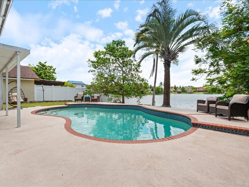 Turn-key 4BR/2.5BA lakefront pool home in Pembroke Pines with major 2025 updates so you can move right in. NEW roof, fresh interior/exterior paint, HVAC, fully renovated baths, new carpet and wood floors, stainless appliances, updated garage with new opener and pool pump. Main level features tile floors, sunken living room with recessed lighting, dining area, breakfast nook and remodeled kitchen with 42" wood cabinets and granite counters. Upstairs bedrooms include a roomy primary suite with walk-in closet, Roman tub and separate shower. Enjoy resurfaced pool, covered lanai and peaceful lake views framed by mango and coconut trees. 2024 water heater and plumbing updates. Low-HOA community near schools, parks and shopping.