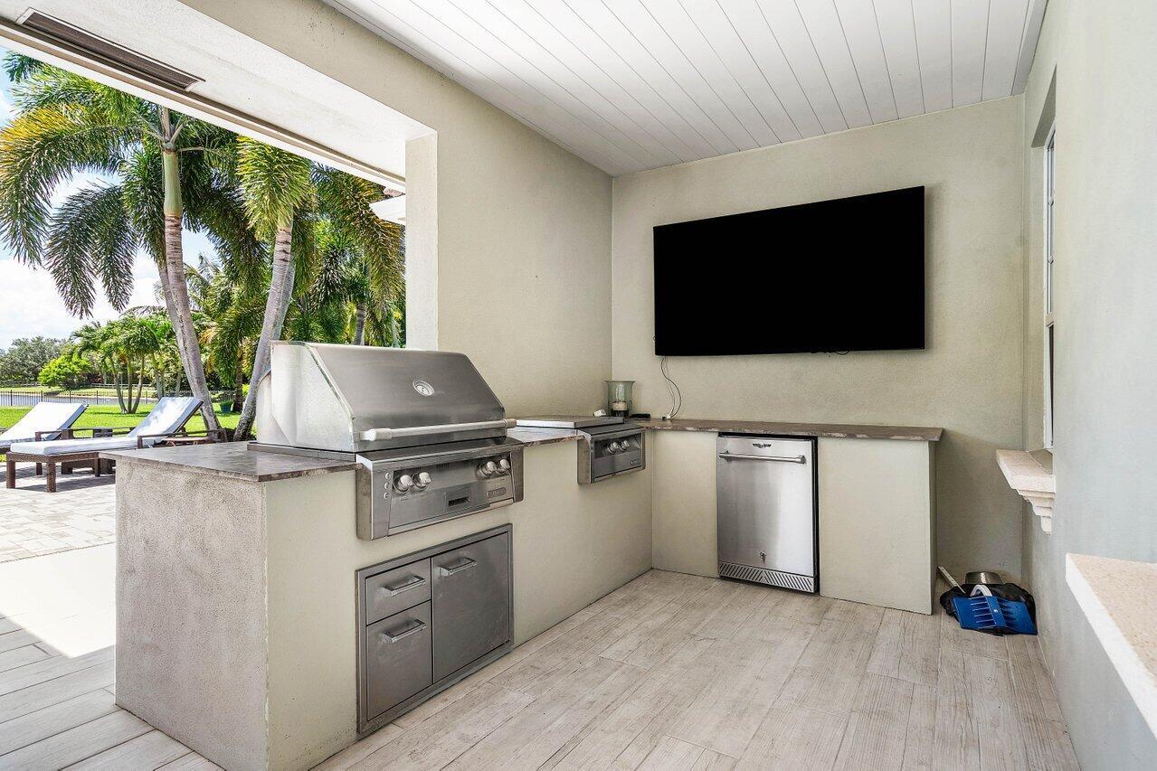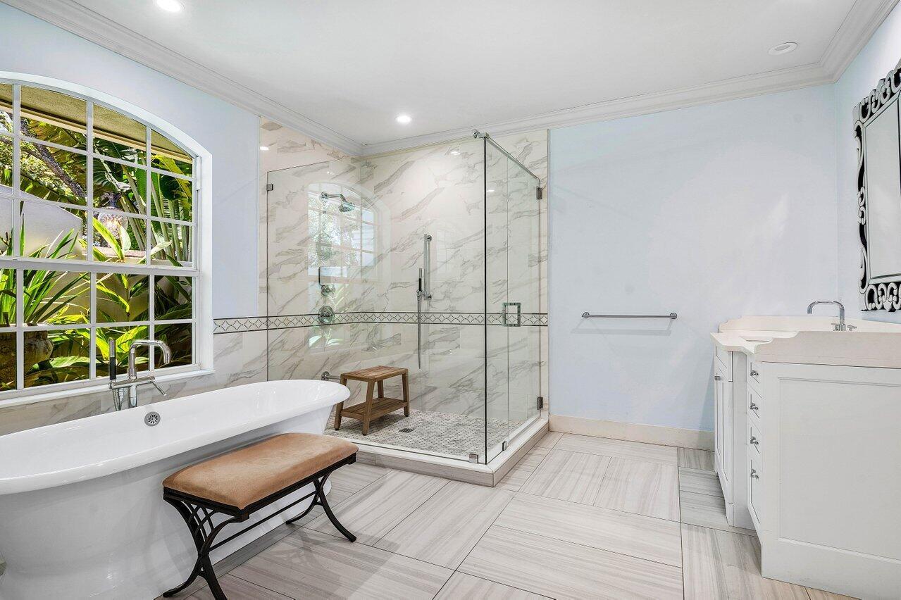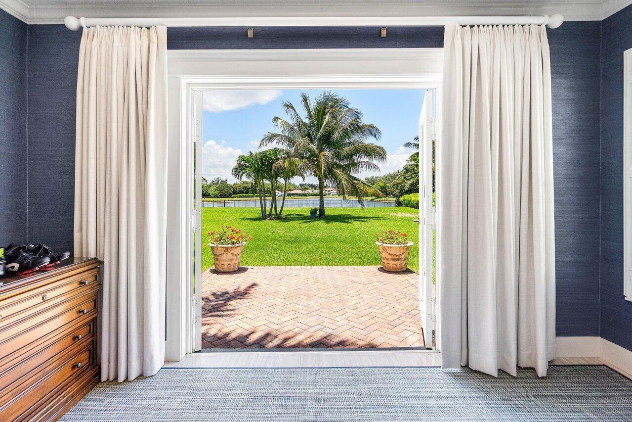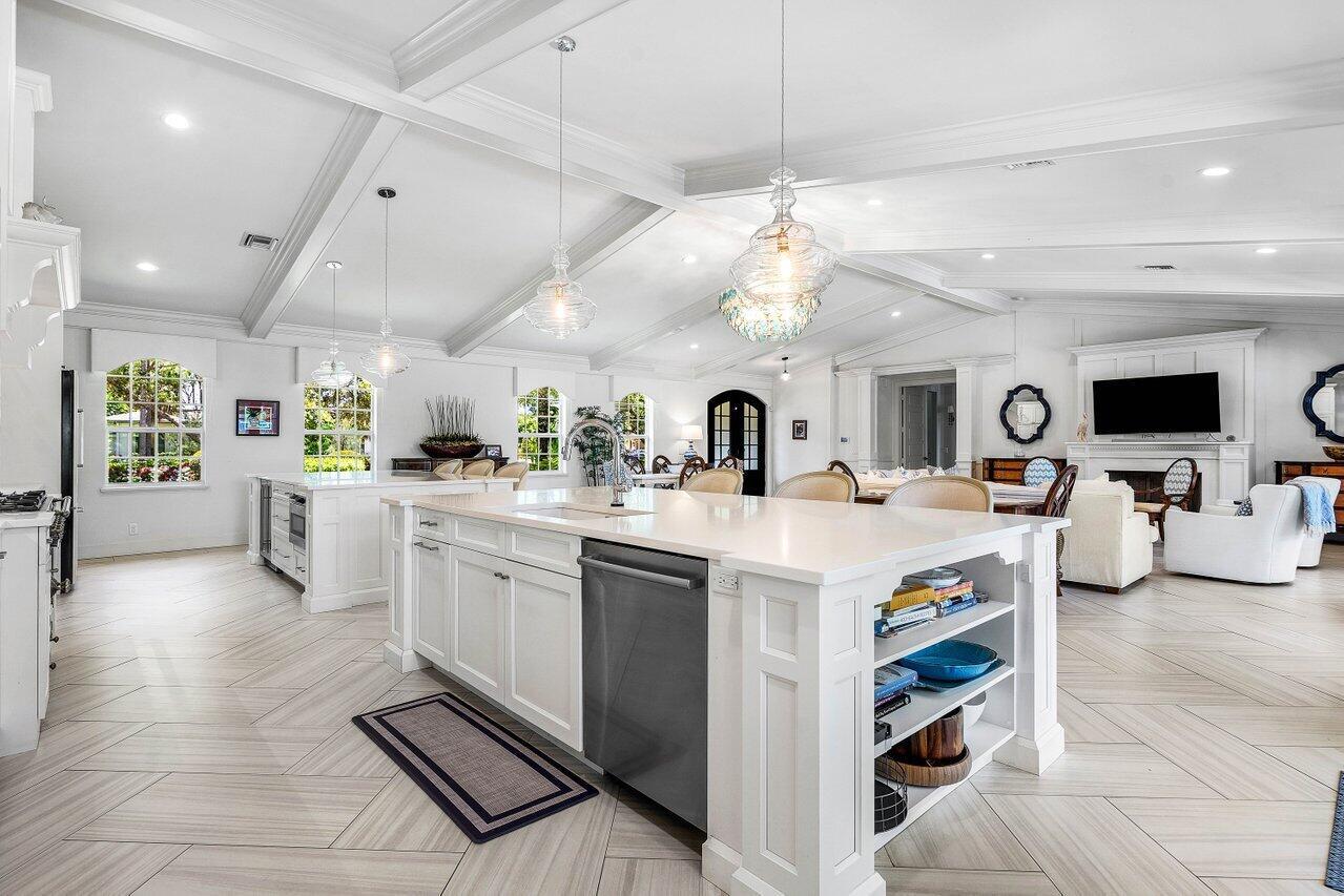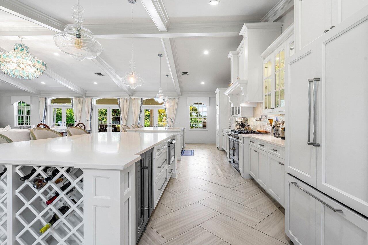 Situated on over one acre of land, this renovated and charming one- story home offers you phenomenal views with nearly 190 feet on the largest lake in Steeplechase!Featuring a modern open plan with traditional and modern details and classical finishes including a french style garden, brick paved circular driveway & boasting a stunning cathedral ceiling with beams and crown moldings as well as impact glass doors and windows and a newer roof.Once you walk through the double iron doors and just past the main living areas an outstanding custom built white kitchen is showcased with an abundance of upper glass cabinetry, an 11' high custom hood, white quartz counters and 2 large islands of 5'x9' each. The focal point of this gorgeous kitchen is a ''La Cornue'' stainless-steel/chrome/