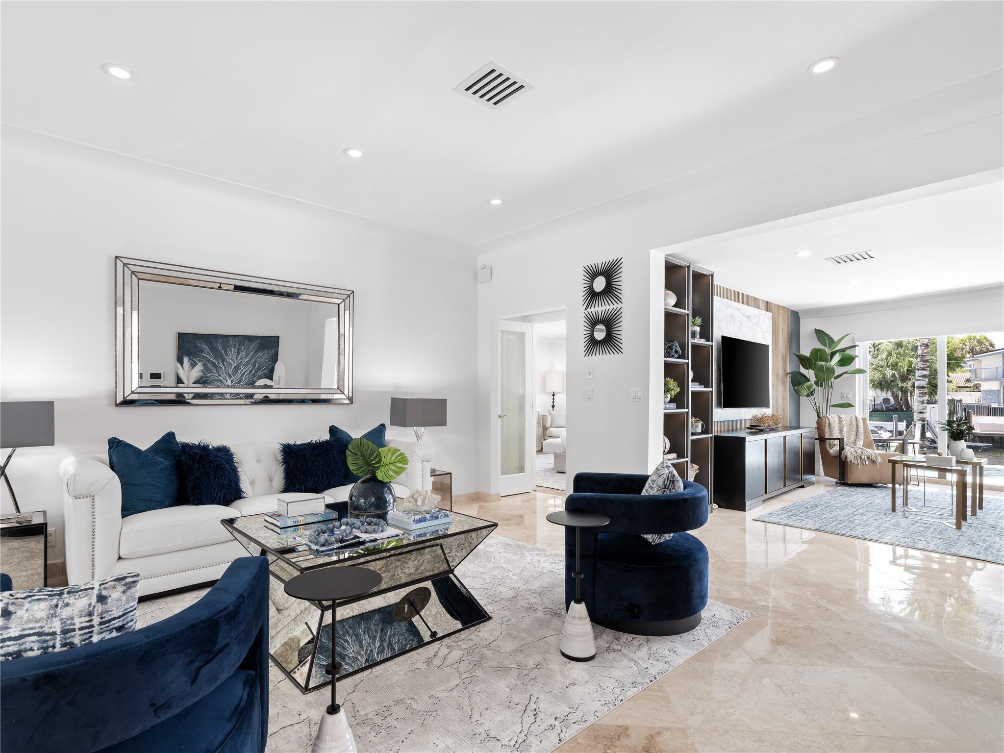Welcome to this stunning renovated coastal retreat located in the prestigious Bermuda Riviera neighborhood of Ft. Lauderdale, 5min walk to the beach! This open-concept home seamlessly blends modern luxury w/timeless elegance, perfect for indoor-outdoor living. Inside, you'll find bright areas with high-impact windows enhancing natural light and energy efficiency. Elegant finishes, including a coffee&wine bar, motorized shades and air- conditioned garage with storage. The outdoor area is an entertainer dream—featuring a newly designed entrance, lush landscaping, new lighting, heated saltwater pool & spa, gazebo, outdoor kitchen&circular driveway enhanced w/artificial grass. Boaters will love the brand-new dock w/ 80 feet on a wide deepwater canal w/direct ocean access no fixed bridges