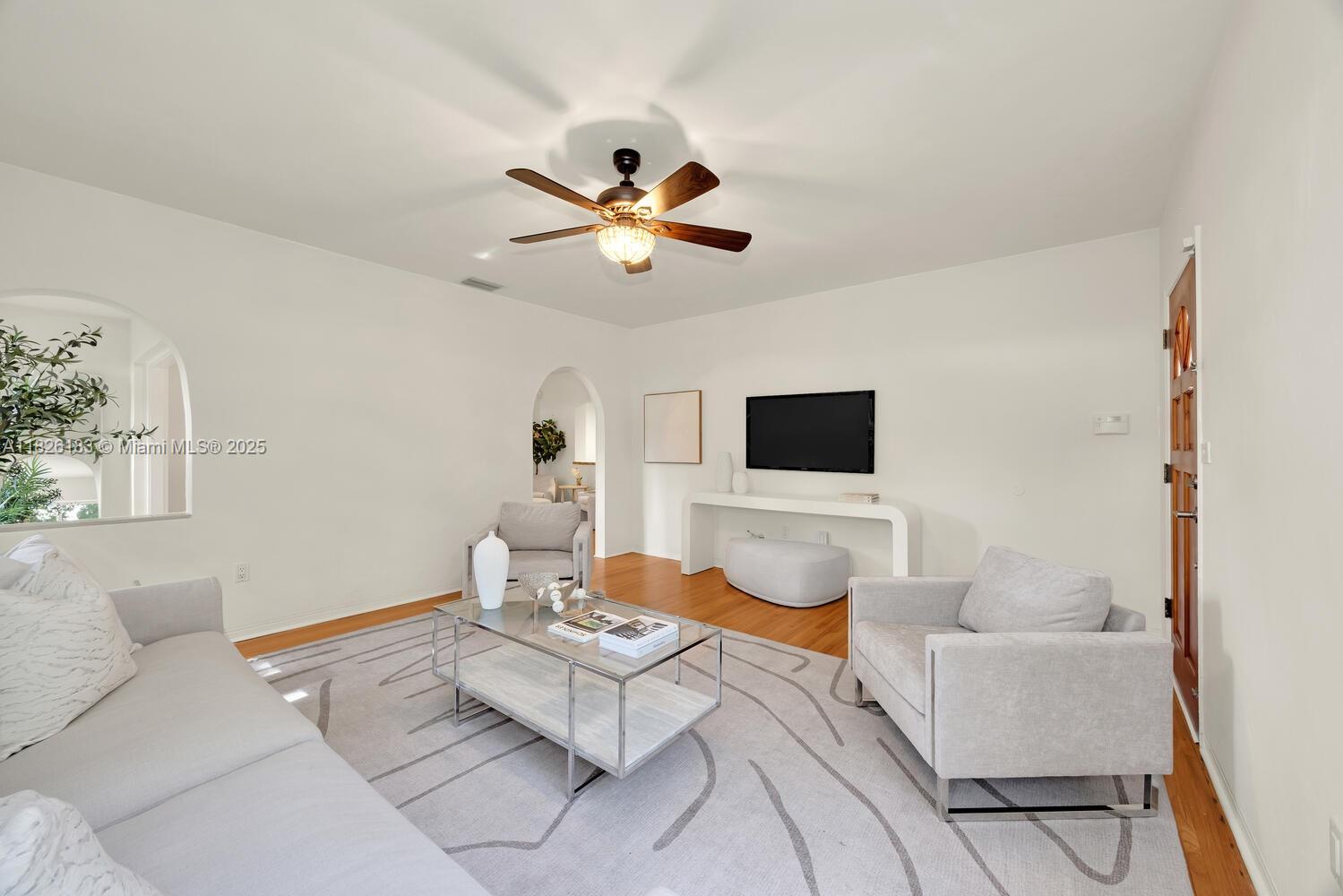 Charming & inviting 2-bedroom, 2-bathroom home on a peaceful, tree-lined corner lot in highly desirable North Coral Gables. Minutes from scenic parks like San Jacinto, Majorca, Venetia, & the iconic Granada Golf Course, this home offers the perfect mix of tranquility & convenience. A brand new roof will be completed by July 2025, providing long-term value & peace of mind. Inside, enjoy impact windows, original hardwood floors, spacious bedrooms, & updated bathrooms.The cozy front porch, privacy hedges, open patio, & generous yard create great spaces for relaxing or entertaining. The bright kitchen features granite countertops, stainless steel appliances, & direct access to the one-car garage.Elegant archways, natural light, & timeless details throughout give this home a warm, classic feel.