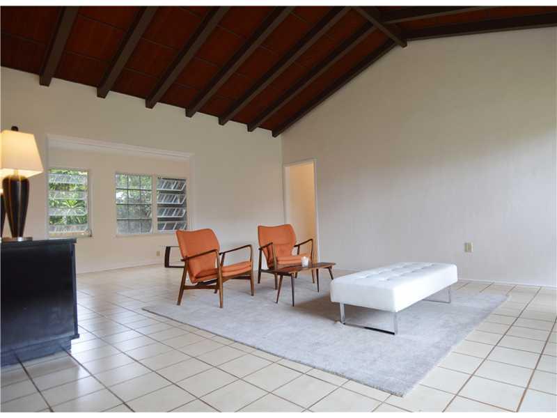 Mid-Century Modern 3/2 with 1854 sq ' on an oak laden 100'X100' lot on a beautiful, low traffic, leafy Gables street. Spacious, logical floor plan, big windows throughout for loads of natural light, dramatic cathedral ceiling in living room adds charm, la rge family room looks out to private, spacious yard with plenty of room for a pool. Original 40's baths have been preserved and the original white terrazzo floors are still there under the tile and carpet ready to restore for that Madmen retro look