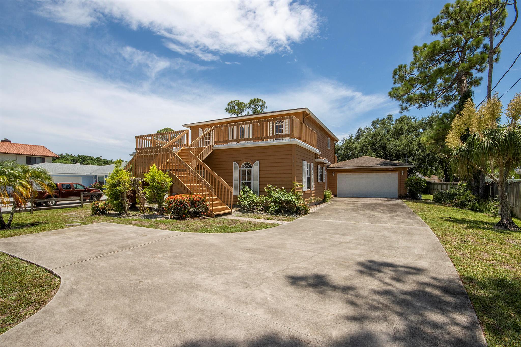 Charming Key West-Style Home - Oversized Lot & No HOA!Discover this rare 4-bedroom, 3-bath gem tucked away on an oversized tropical lot with no HOA, offering endless potential. Add a pool, extra garage, or your own private retreat--the space is yours to create.Enjoy stainless steel appliances, a cozy fireplace, and balconies on both the front and back, plus a covered patio perfect for outdoor living. The upstairs features a versatile suite that can serve as a primary bedroom, in-law space, or rental, complete with a mini fridge, sink, large en suite bath, and walk-in closet.A-rated schools, holiday parades, and just minutes from the beach, highways, and entertainment, this home offers both comfort and convenience.