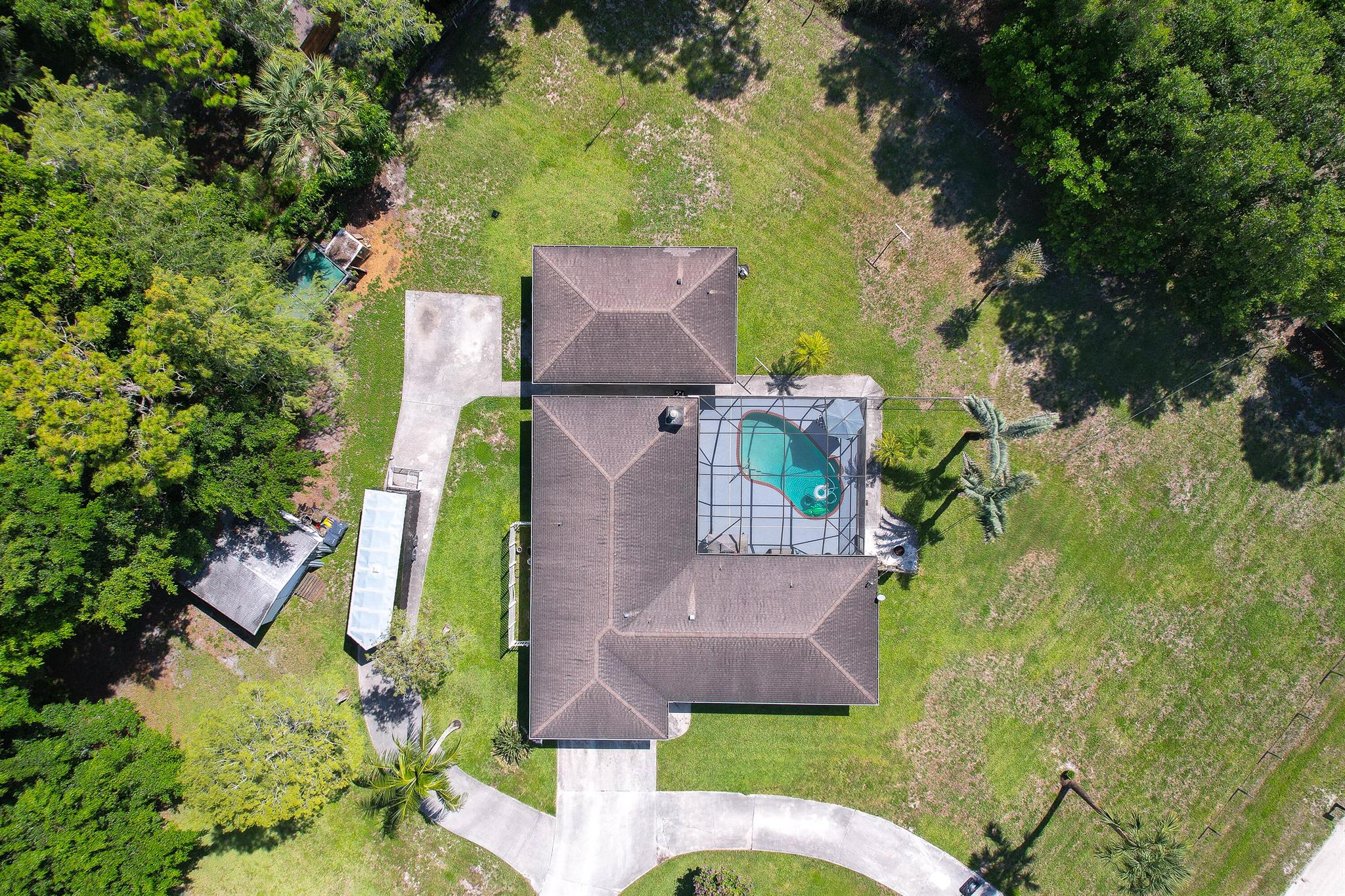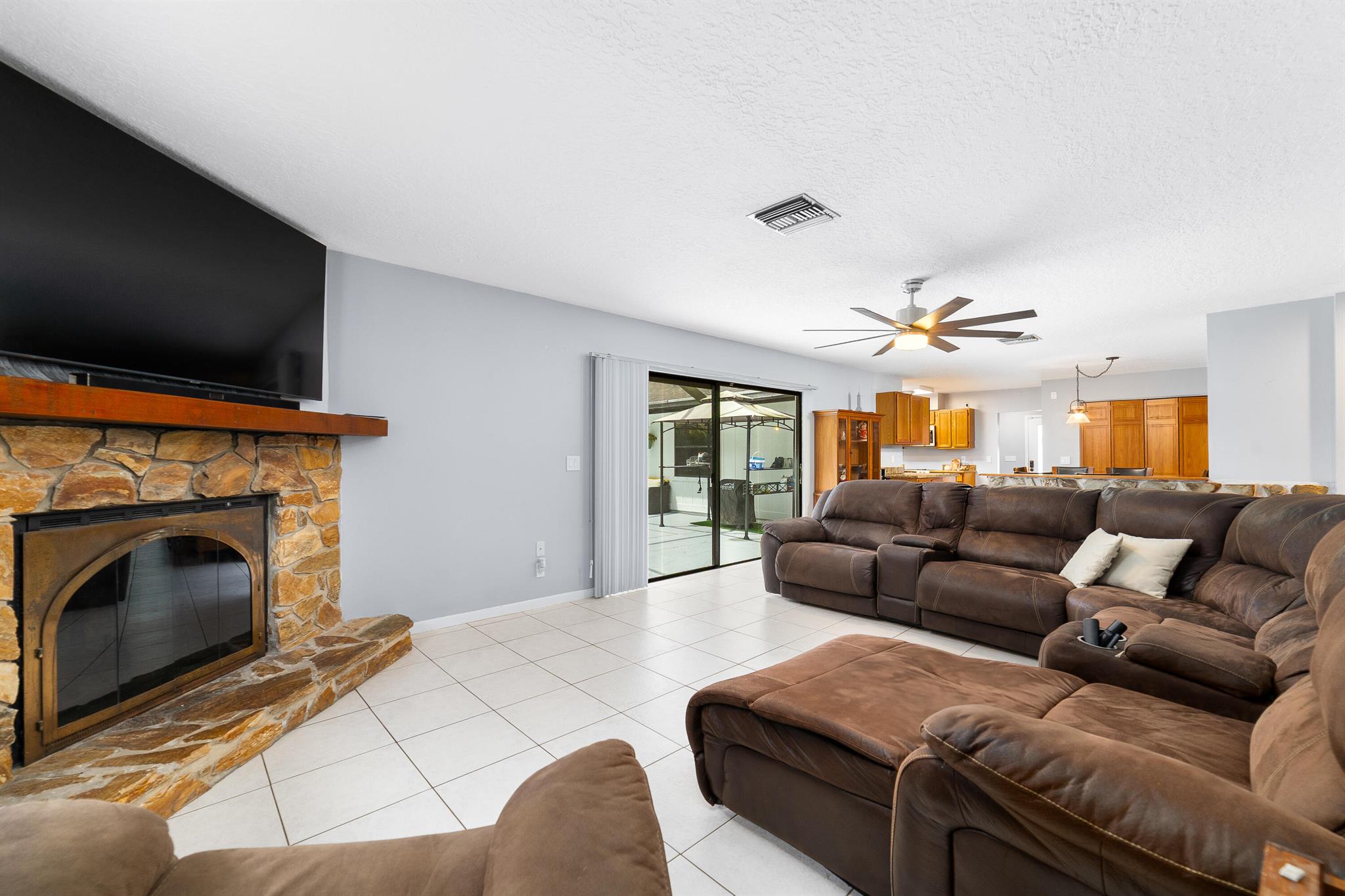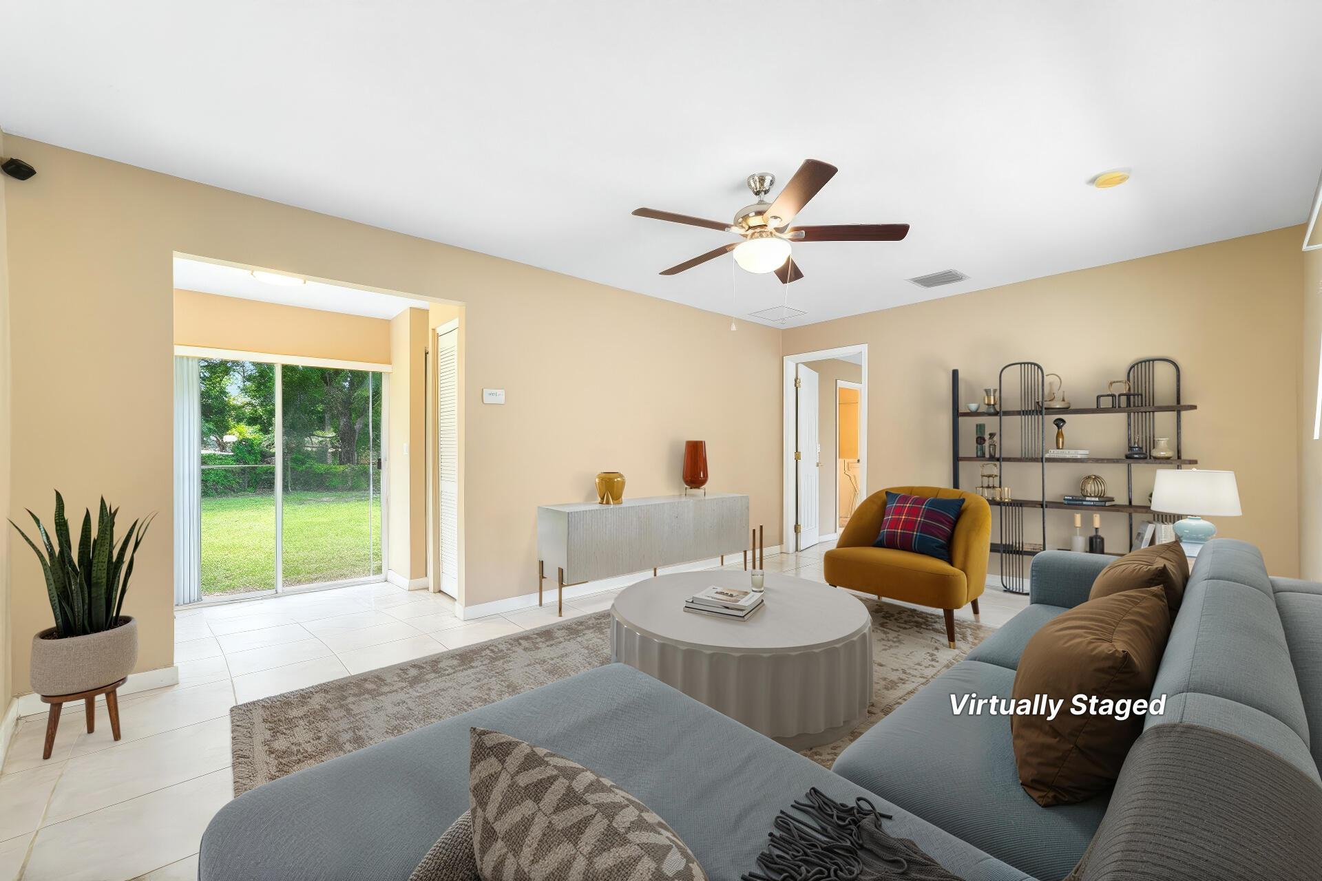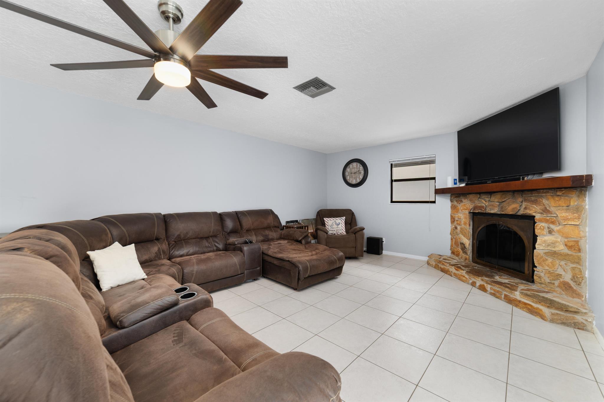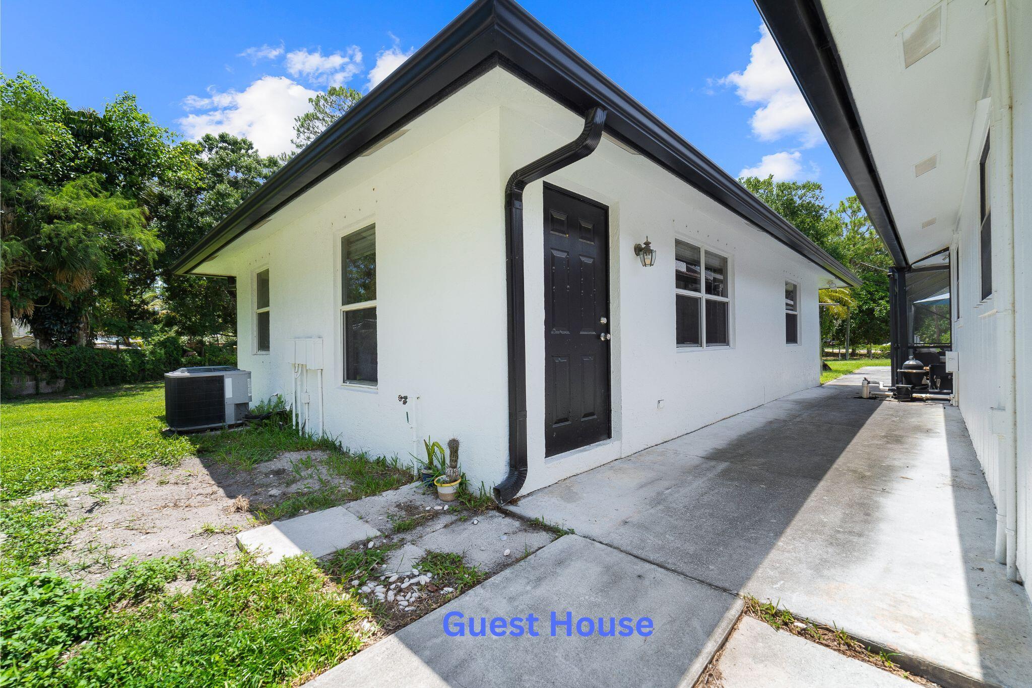 Welcome to this spacious one-level residence offering comfort, privacy, and flexibility on 1.54 acres. The main home offers 3 bedrooms and 2 baths, while the detached guest home includes 1 bedroom and 1 bath. The main home features tile flooring throughout, a welcoming stone fireplace, and abundant storage. The kitchen is equipped with a new stove and microwave (2023), and the washer and dryer were replaced in 2024. The home also includes complete hurricane shutters, whole-house window tinting (2021), and a main A/C unit and ductwork replacement (July 2024) on the south side, ensuring peace of mind and year-round comfort. The property's exterior is just as impressive, featuring a screened pool with an extended pressed concrete deck, rescreened in 2021, and a pool pump replaced in 2020.