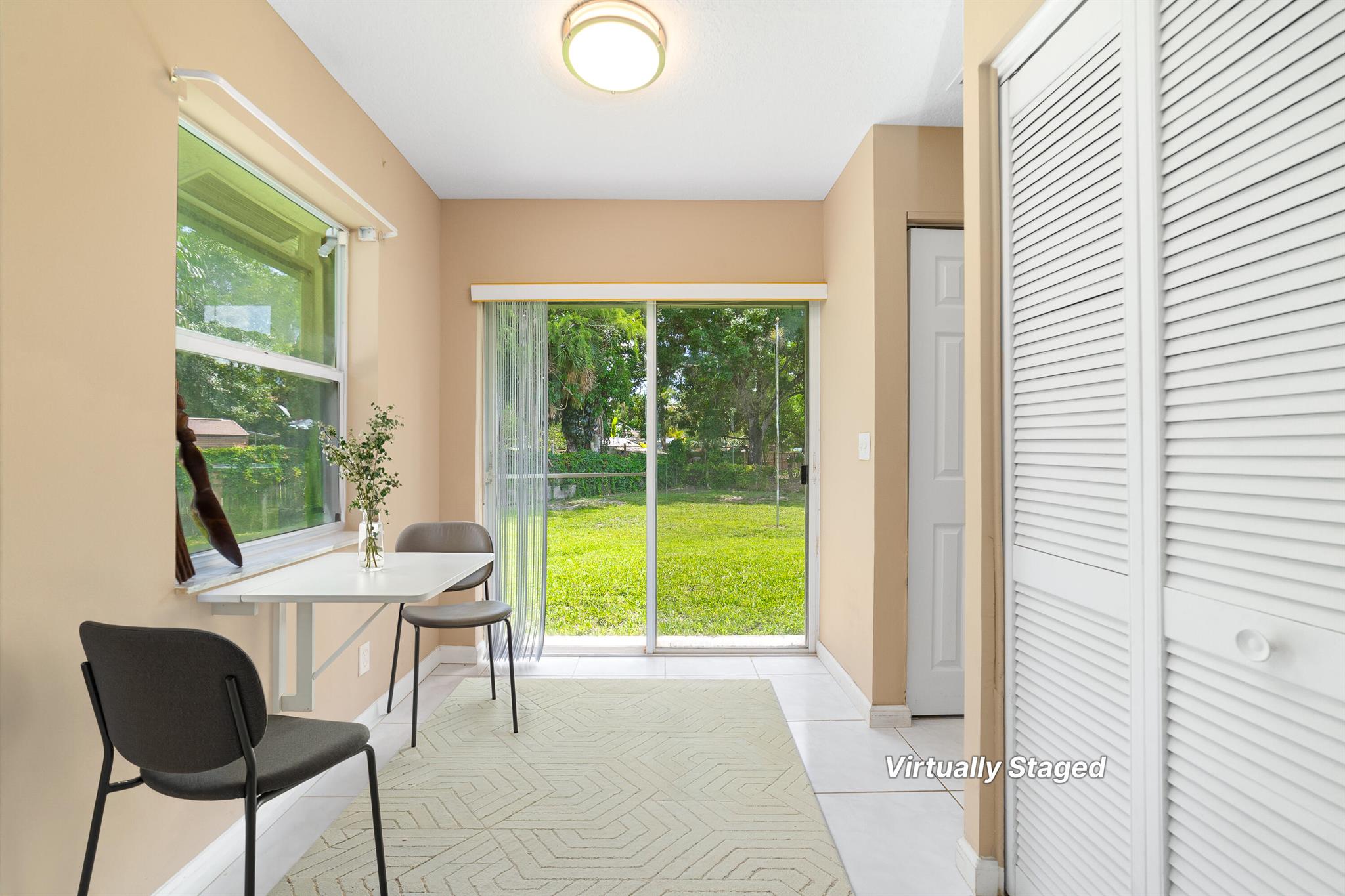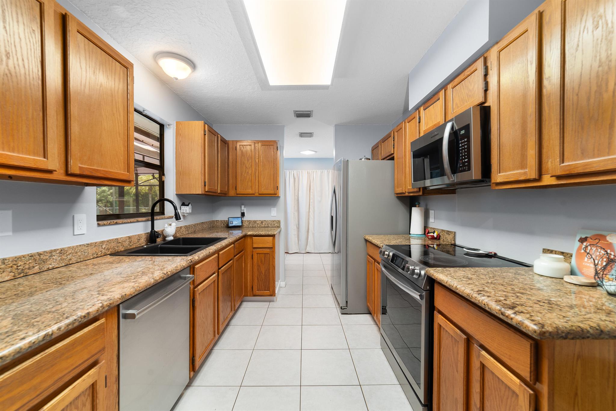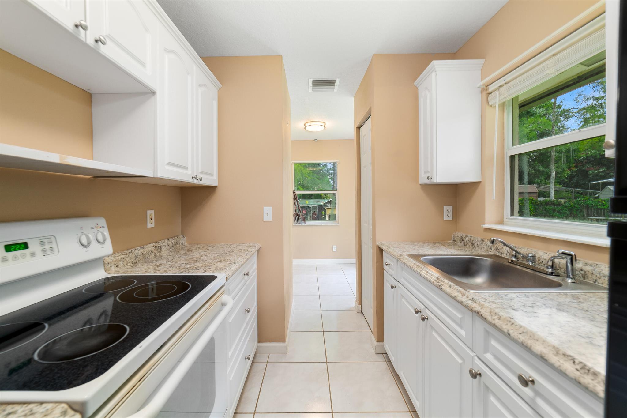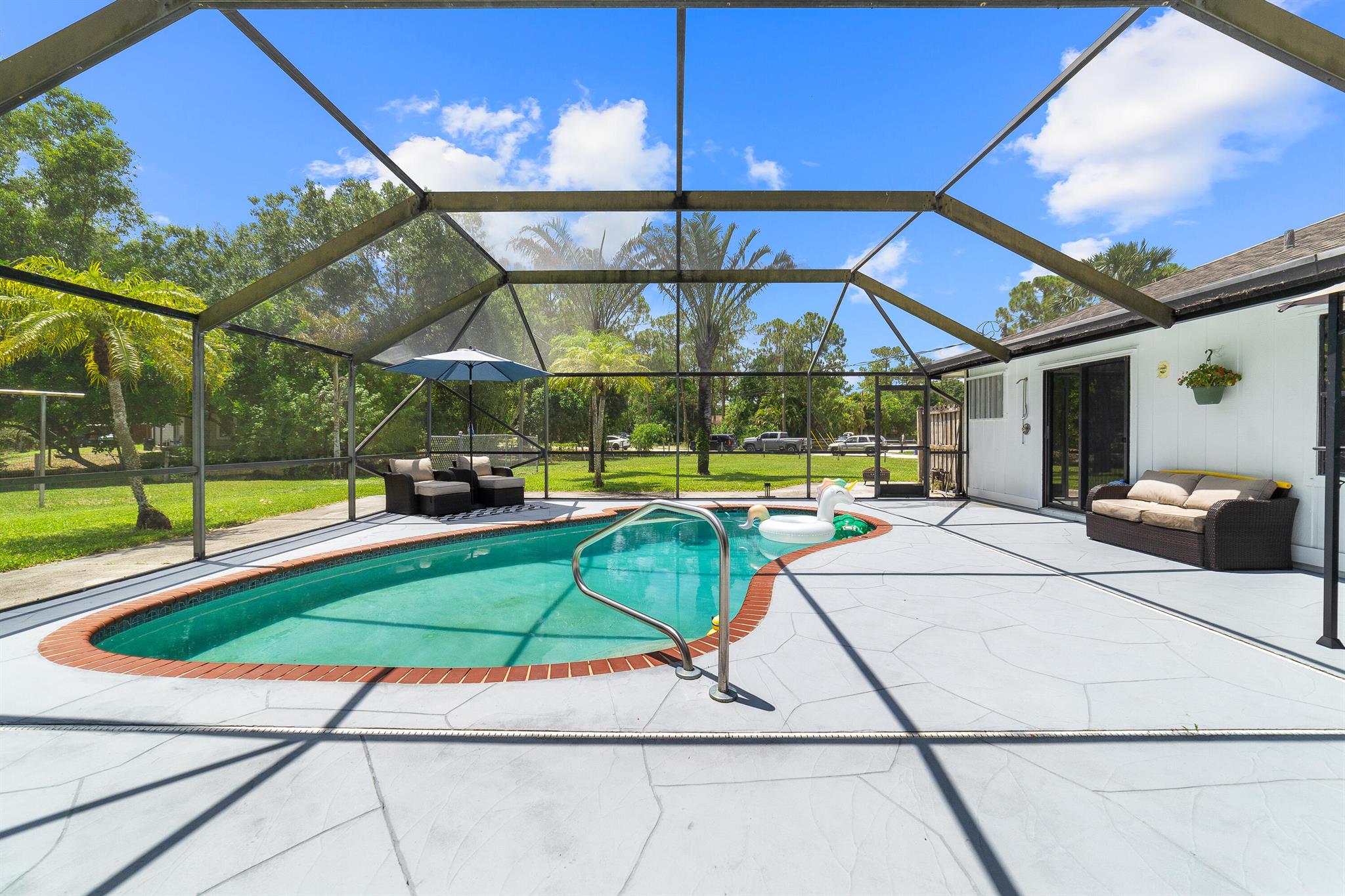 Welcome to this spacious one-level residence offering comfort, privacy, and flexibility on 1.54 acres. The main home offers 3 bedrooms and 2 baths, while the detached guest home includes 1 bedroom and 1 bath. The main home features tile flooring throughout, a welcoming stone fireplace, and abundant storage. The kitchen is equipped with a new stove and microwave (2023), and the washer and dryer were replaced in 2024. The home also includes complete hurricane shutters, whole-house window tinting (2021), and a main A/C unit and ductwork replacement (July 2024) on the south side, ensuring peace of mind and year-round comfort. The property's exterior is just as impressive, featuring a screened pool with an extended pressed concrete deck, rescreened in 2021, and a pool pump replaced in 2020.