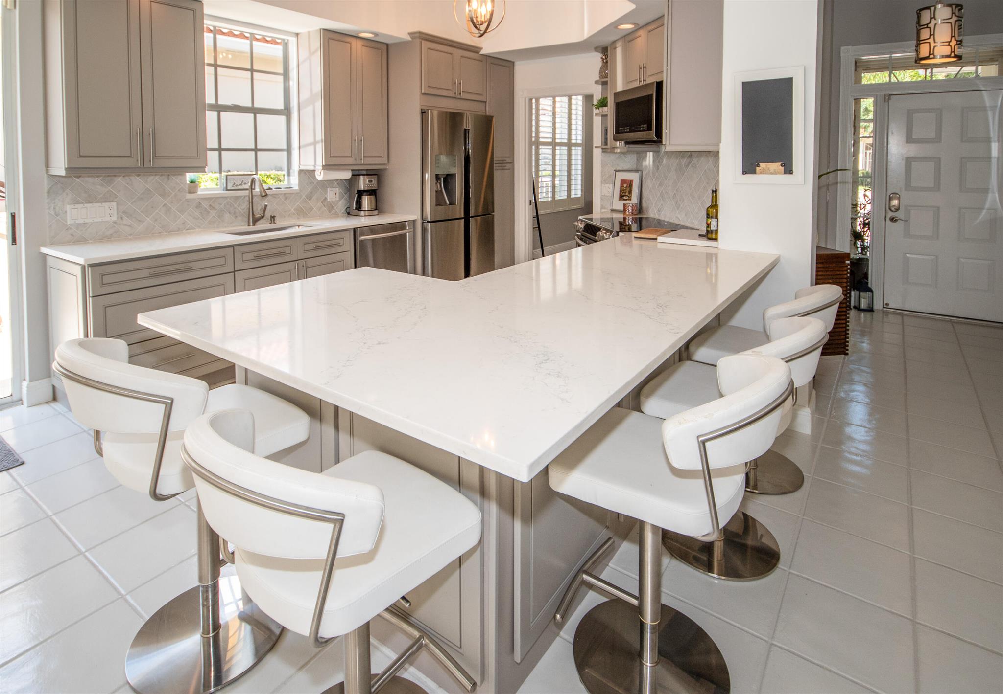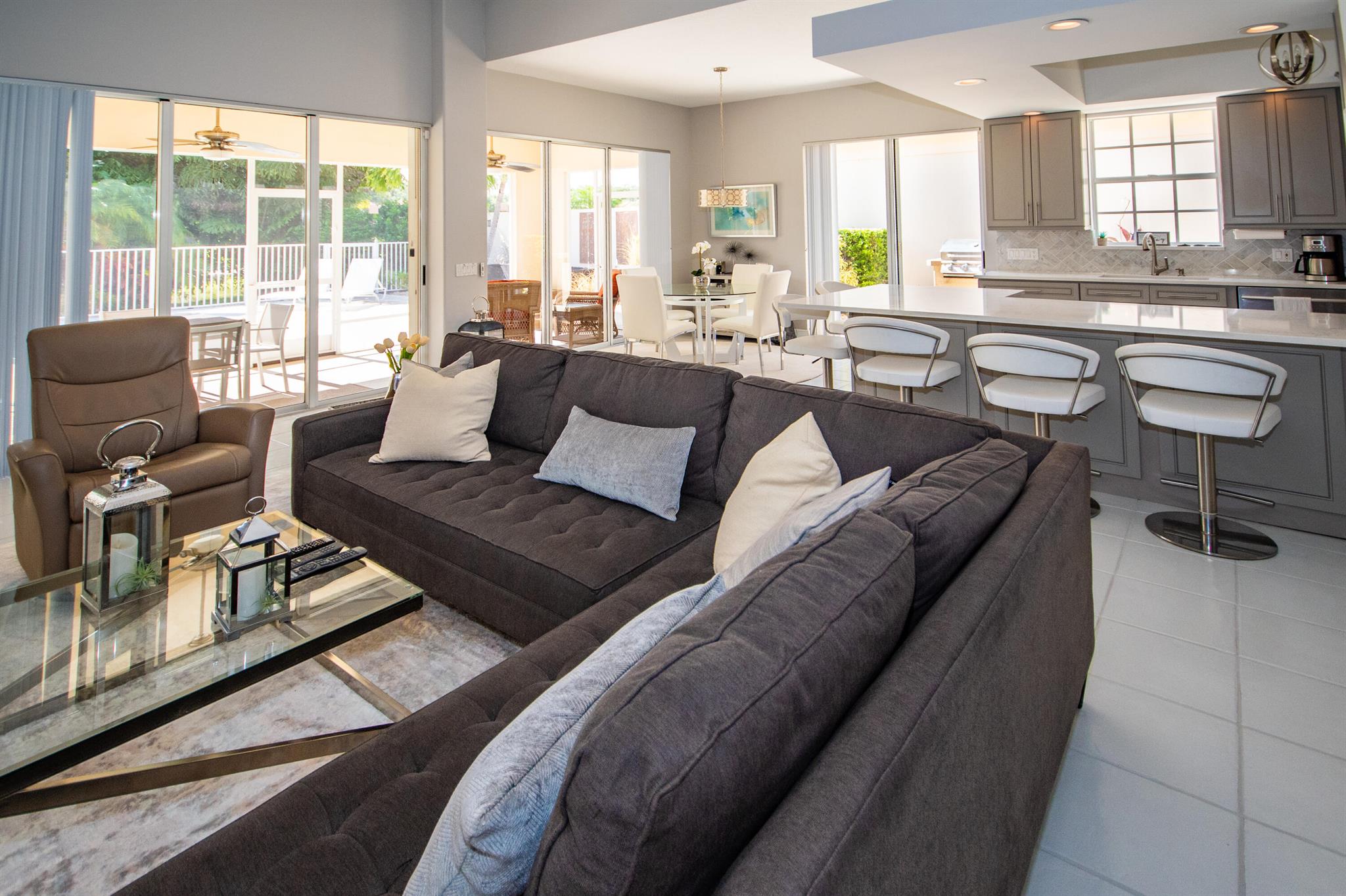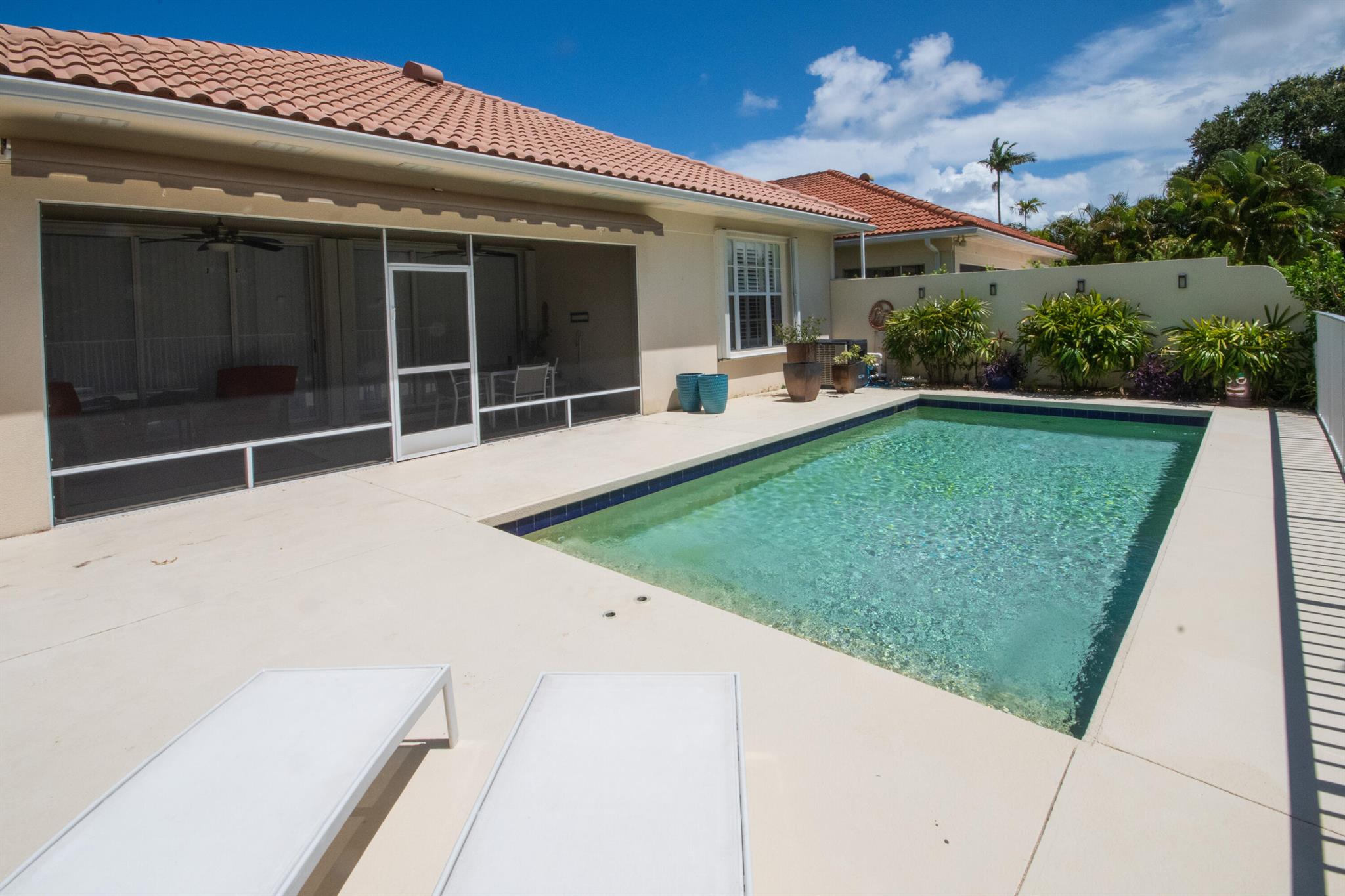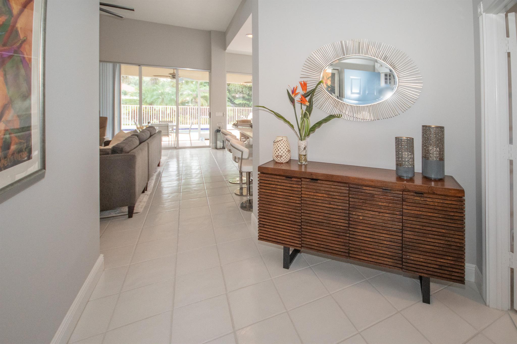 Charming & Private Lakefront Pool Home with extended Patio & deck area, Remote Sun-Shade Awning, lovely covered & screened Patio area & Lush Landscaping. Updated custom kitchen offering an entire suite of SS Appliances, a Pantry w/pullouts, a large L-shape bar counter topped with a sea of luscious quartz countertops & a window over the large SS sink. U'll also enjoy the convenient sliding door just off kitchen with side patio & outdoor grilling station. Open Concept living & dining area, Soaring Ceilings & NO POPCORN throughout. New flooring, Plantation Shutters, Murphy Bed, Most Popular, Divosta Built Solid Model: 3 bed/3bath/Plus Bonus Flex Rm/oversized 2 car garage/Laundry Rm with full size W&D, 6-Bays of 42'' Cabinets & Large Utility sink.GR8 Entertaining spaces inside & out. A MUST C