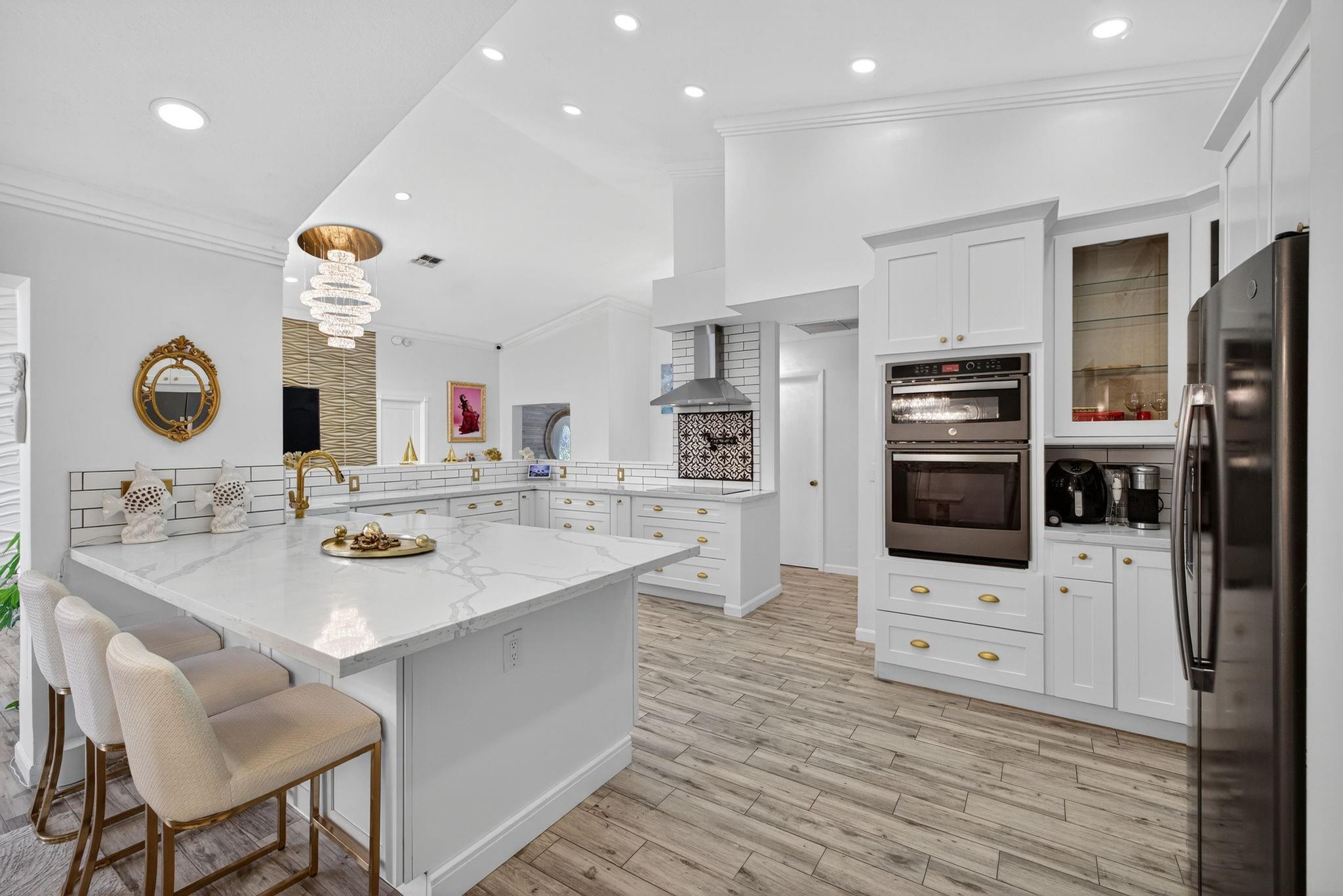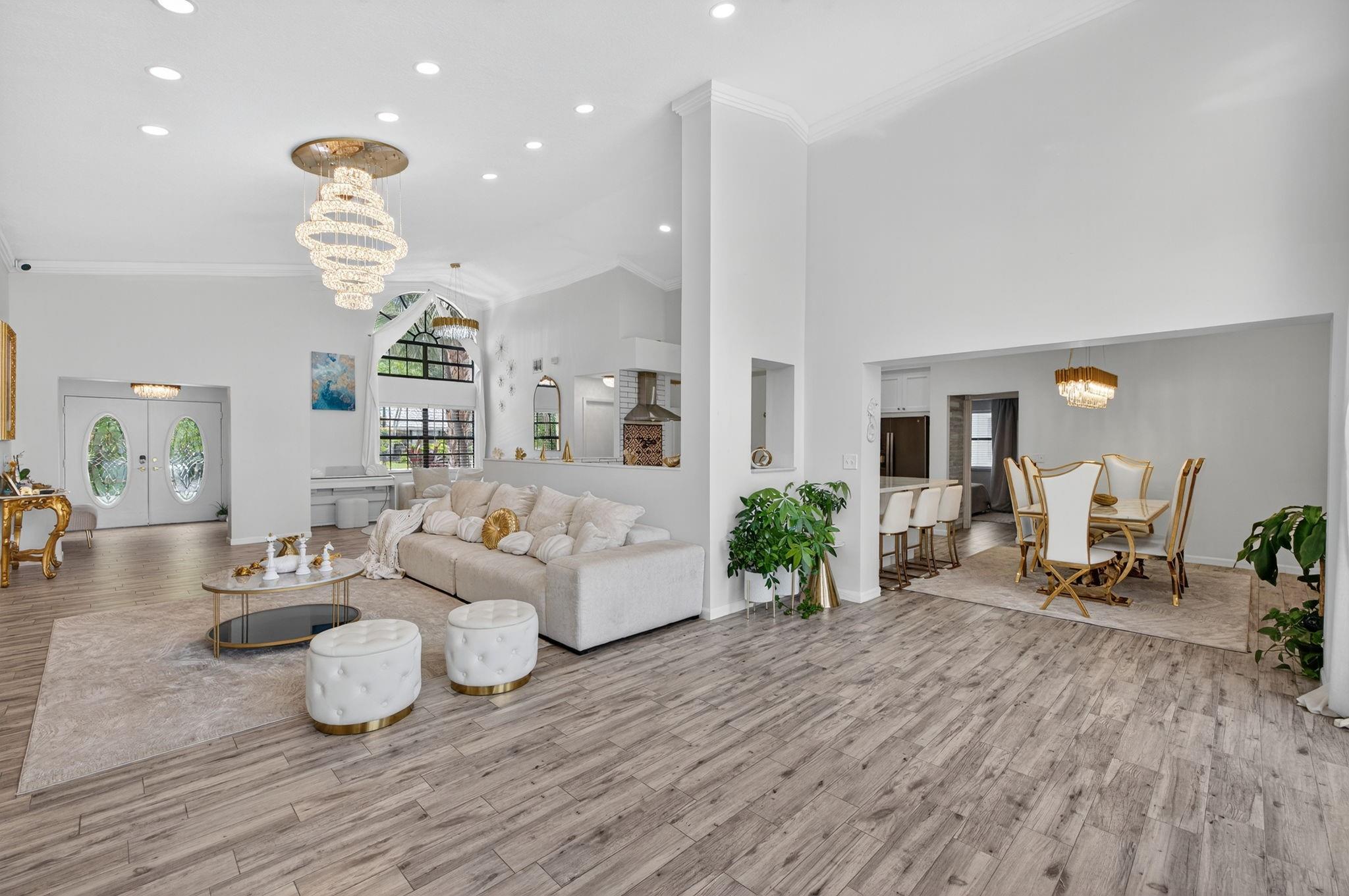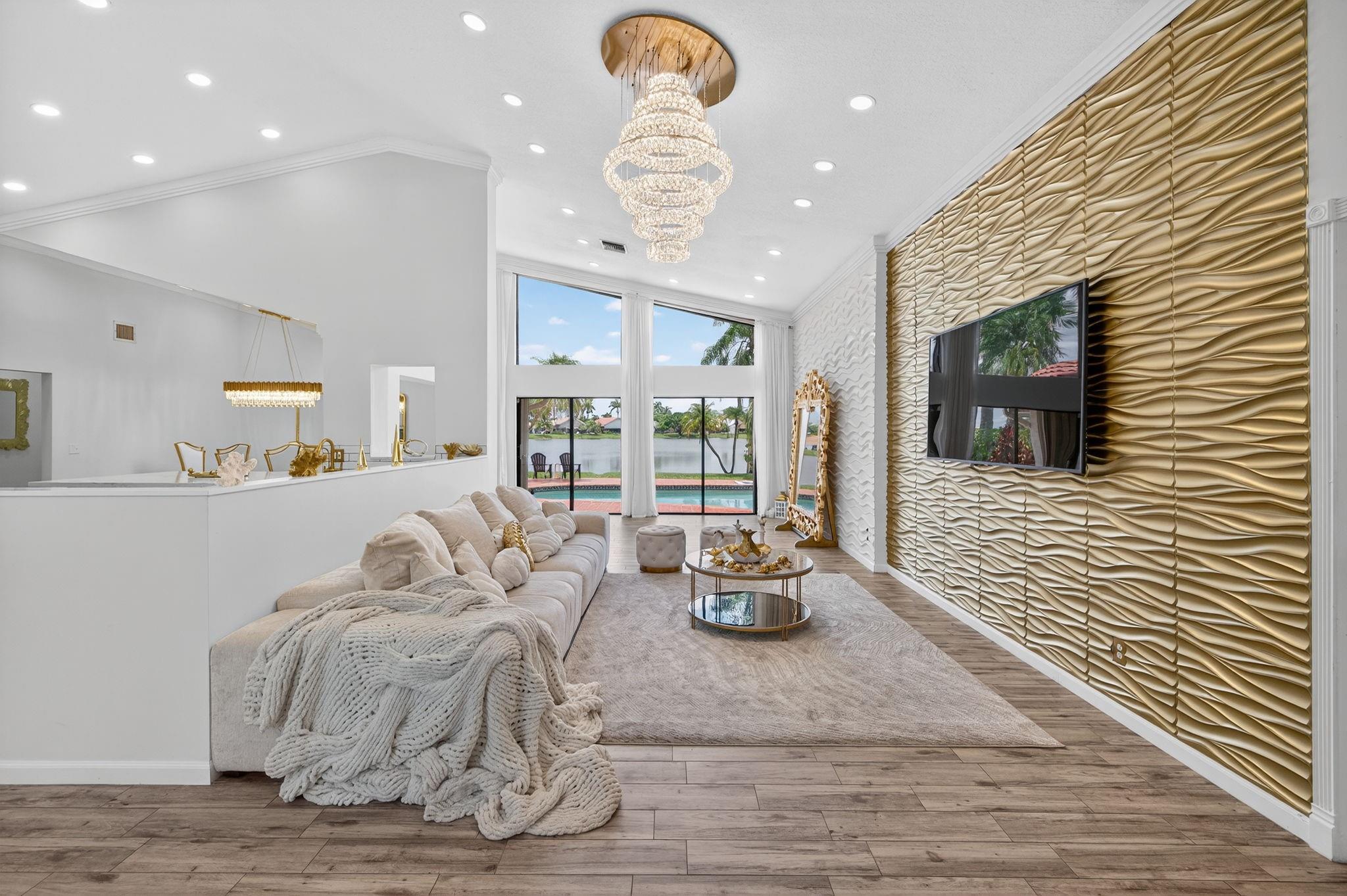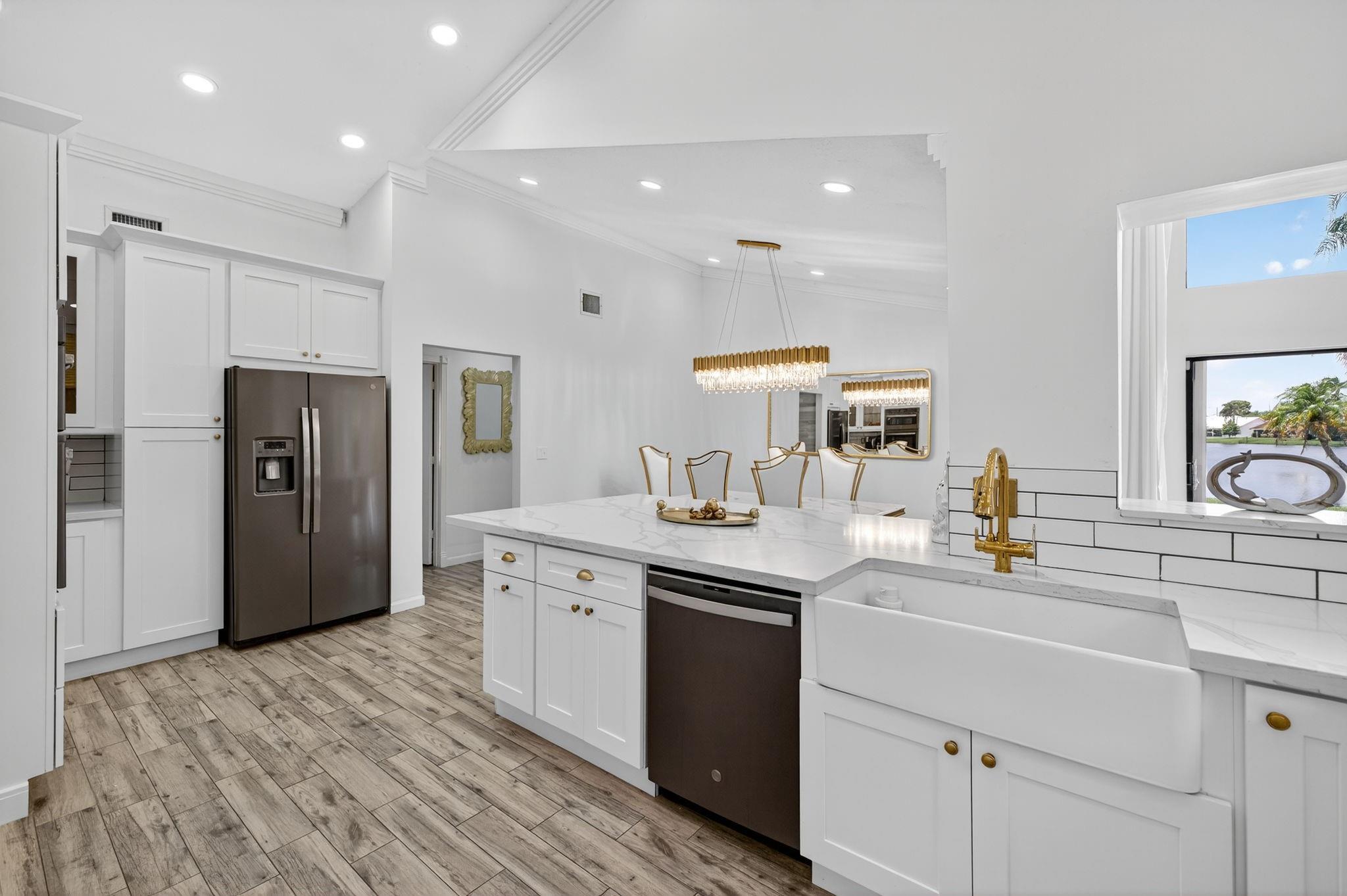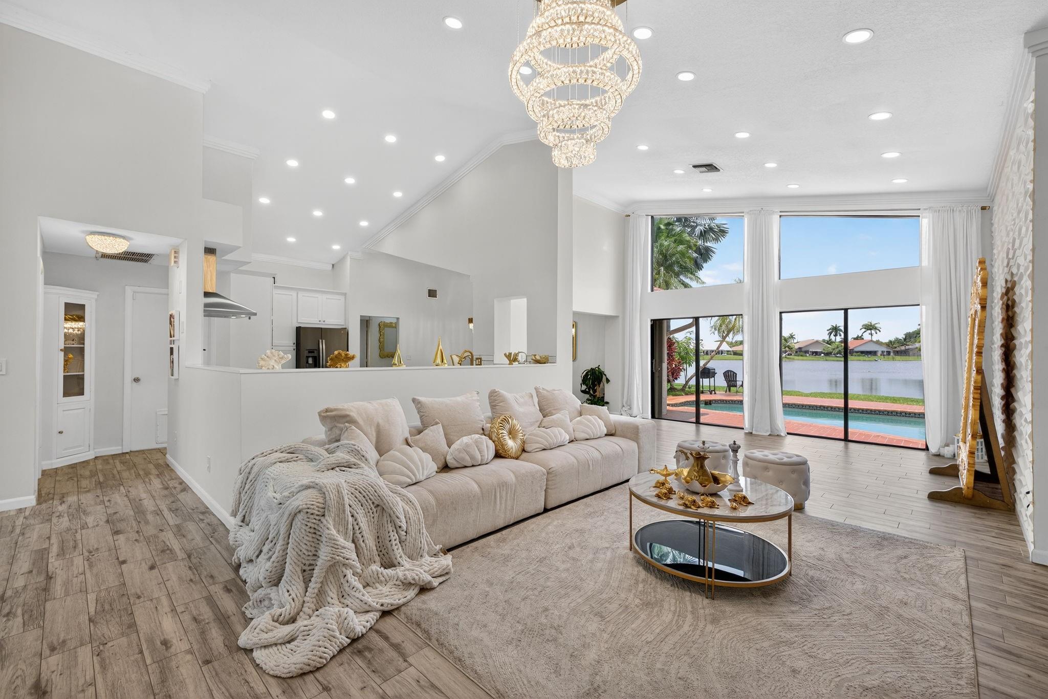 Desirable OAK KNOLL ESTATES! Lakeside living at its finest in this stunning 4 BR, 2 BA, 2-car garage split BR pool home, perfectly positioned for breathtaking sunset views over the water. Thoughtfully designed with elegance & comfort, it features a newly renovated all-white chef's kitchen with high-end appliances, custom cabinetry & gleaming countertops. Soaring 15 ft ceilings & modern LED lighting create an airy, sophisticated ambiance. 25k in real crystal lighting. The open concept flows to an outdoor oasis—sparkling pool & serene lakefront setting. Whether entertaining or unwinding, every space offers beauty, tranquility & refined detail. Roof 2008, AC 2014,new washer/dryer & water heater.