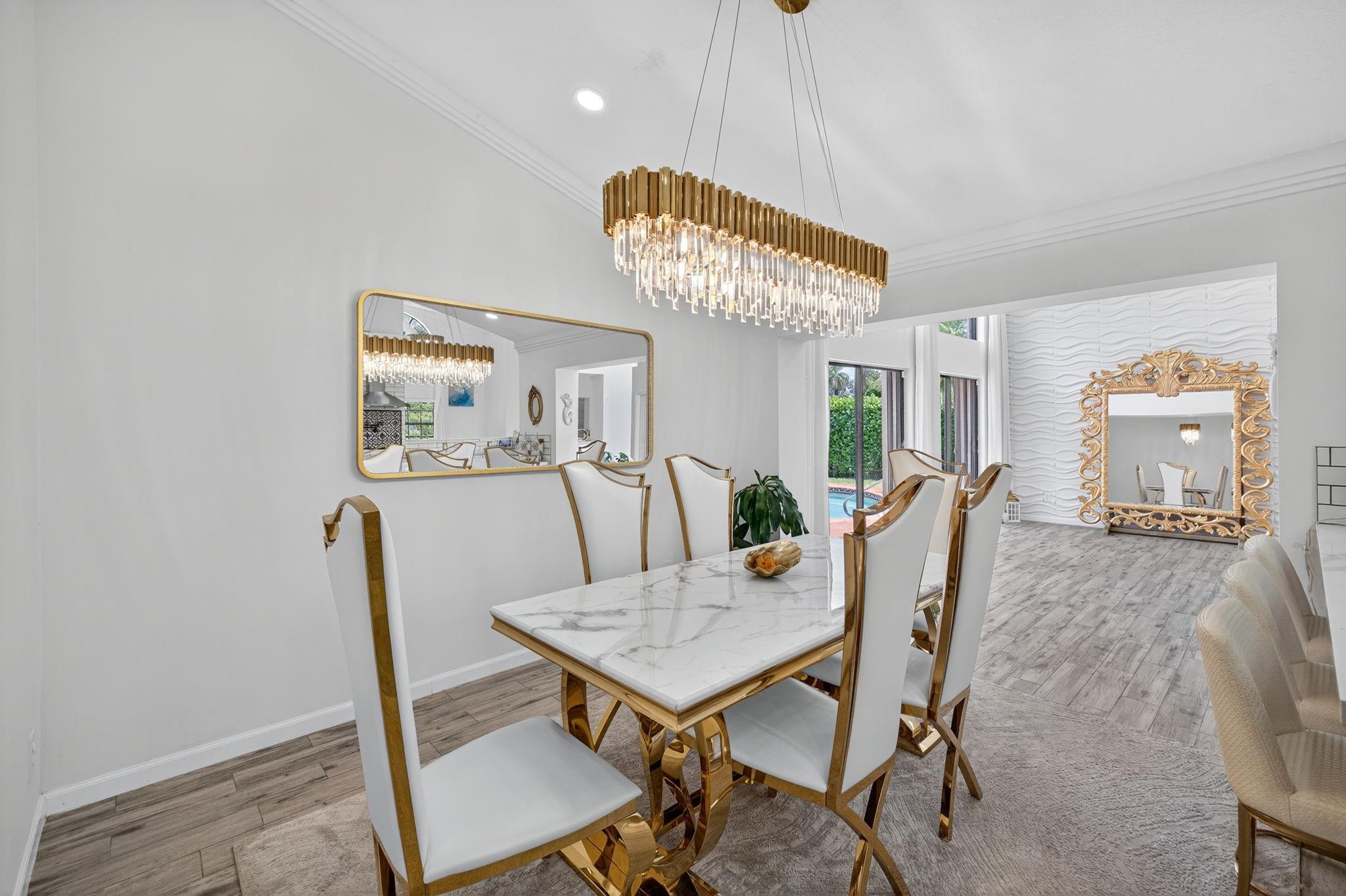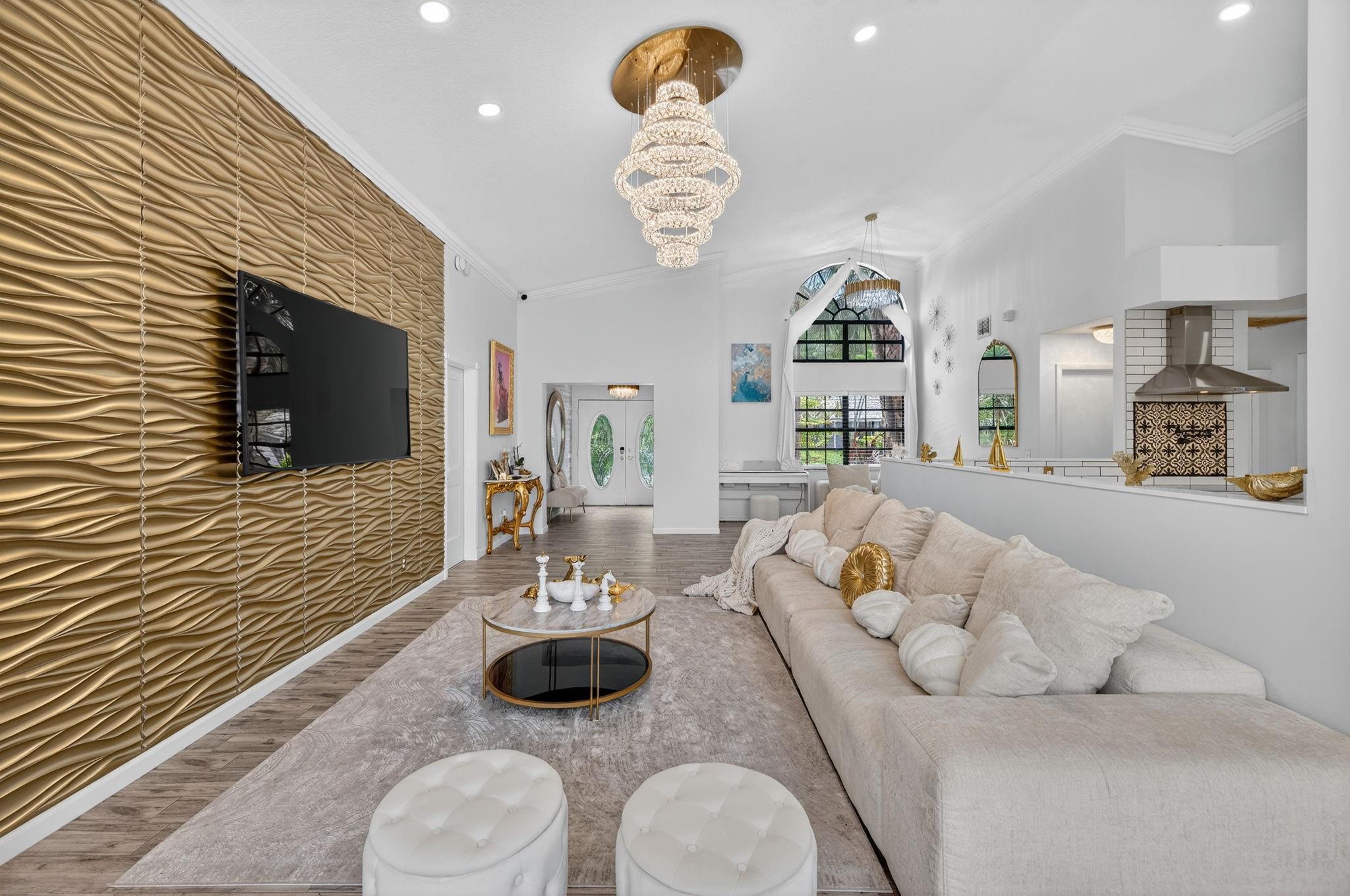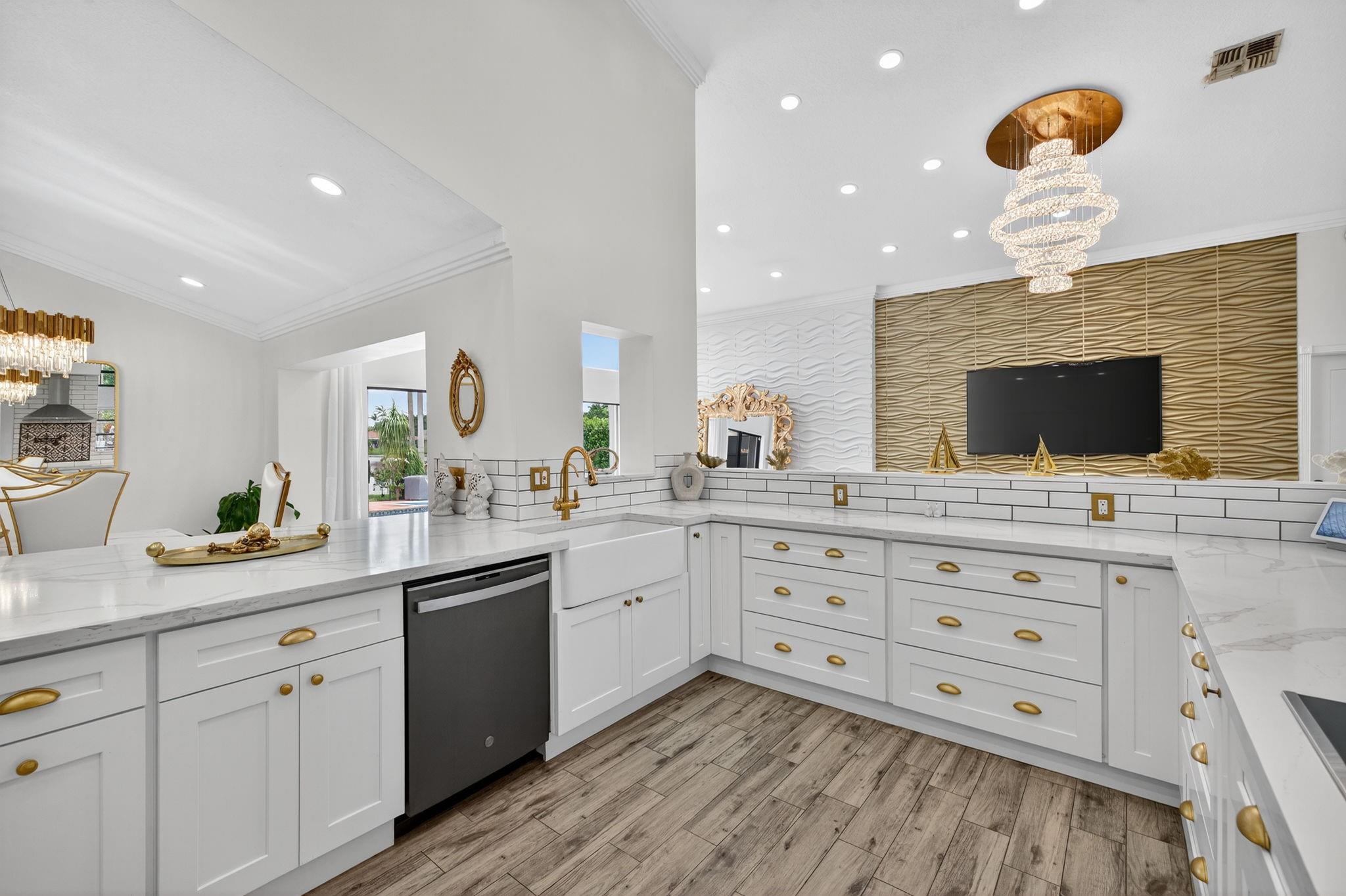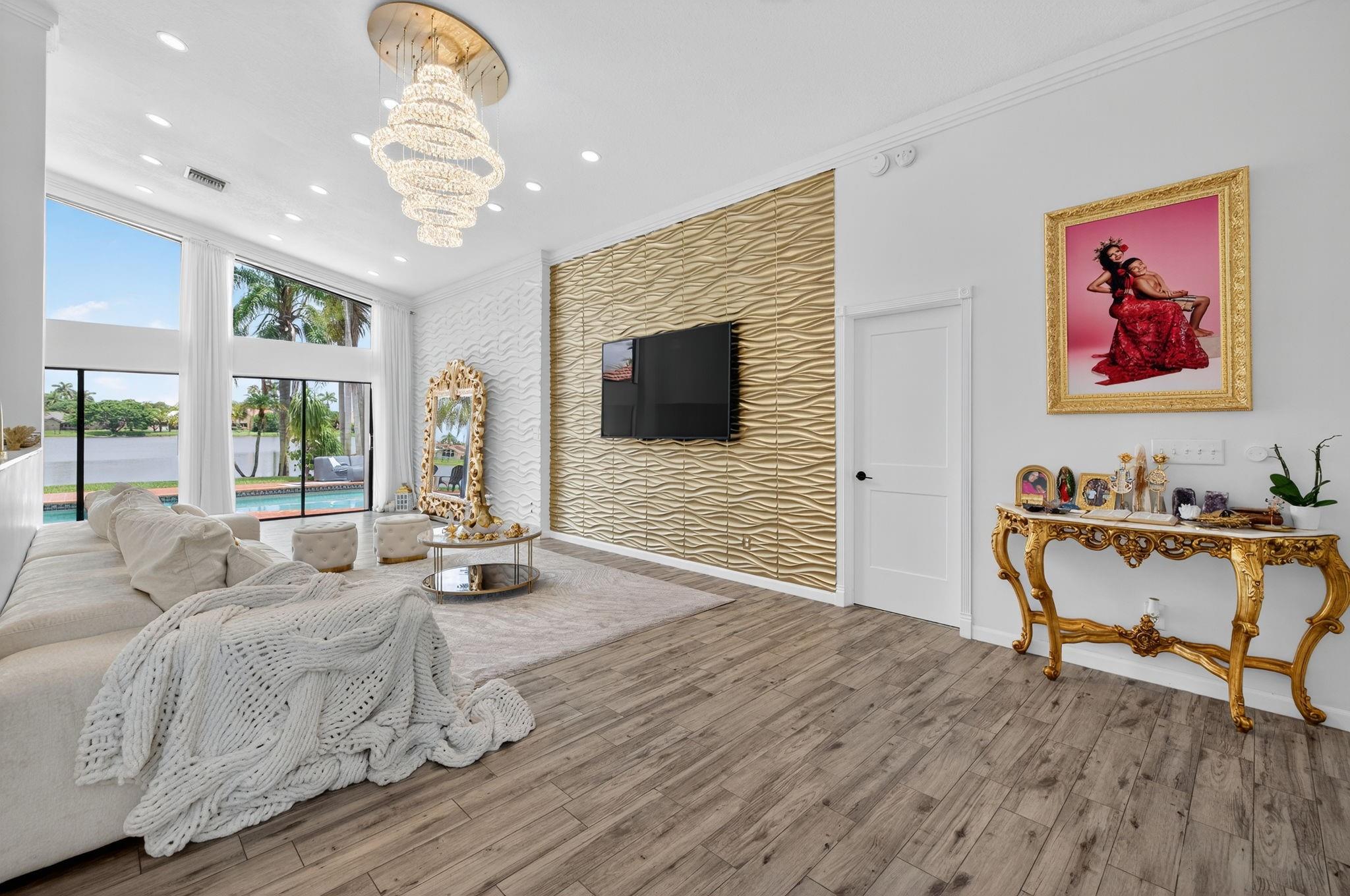 Desirable OAK KNOLL ESTATES! Lakeside living at its finest in this stunning 4 BR, 2 BA, 2-car garage split BR pool home, perfectly positioned for breathtaking sunset views over the water. Thoughtfully designed with elegance & comfort, it features a newly renovated all-white chef's kitchen with high-end appliances, custom cabinetry & gleaming countertops. Soaring 15 ft ceilings & modern LED lighting create an airy, sophisticated ambiance. 25k in real crystal lighting. The open concept flows to an outdoor oasis—sparkling pool & serene lakefront setting. Whether entertaining or unwinding, every space offers beauty, tranquility & refined detail. Roof 2008, AC 2014,new washer/dryer & water heater.