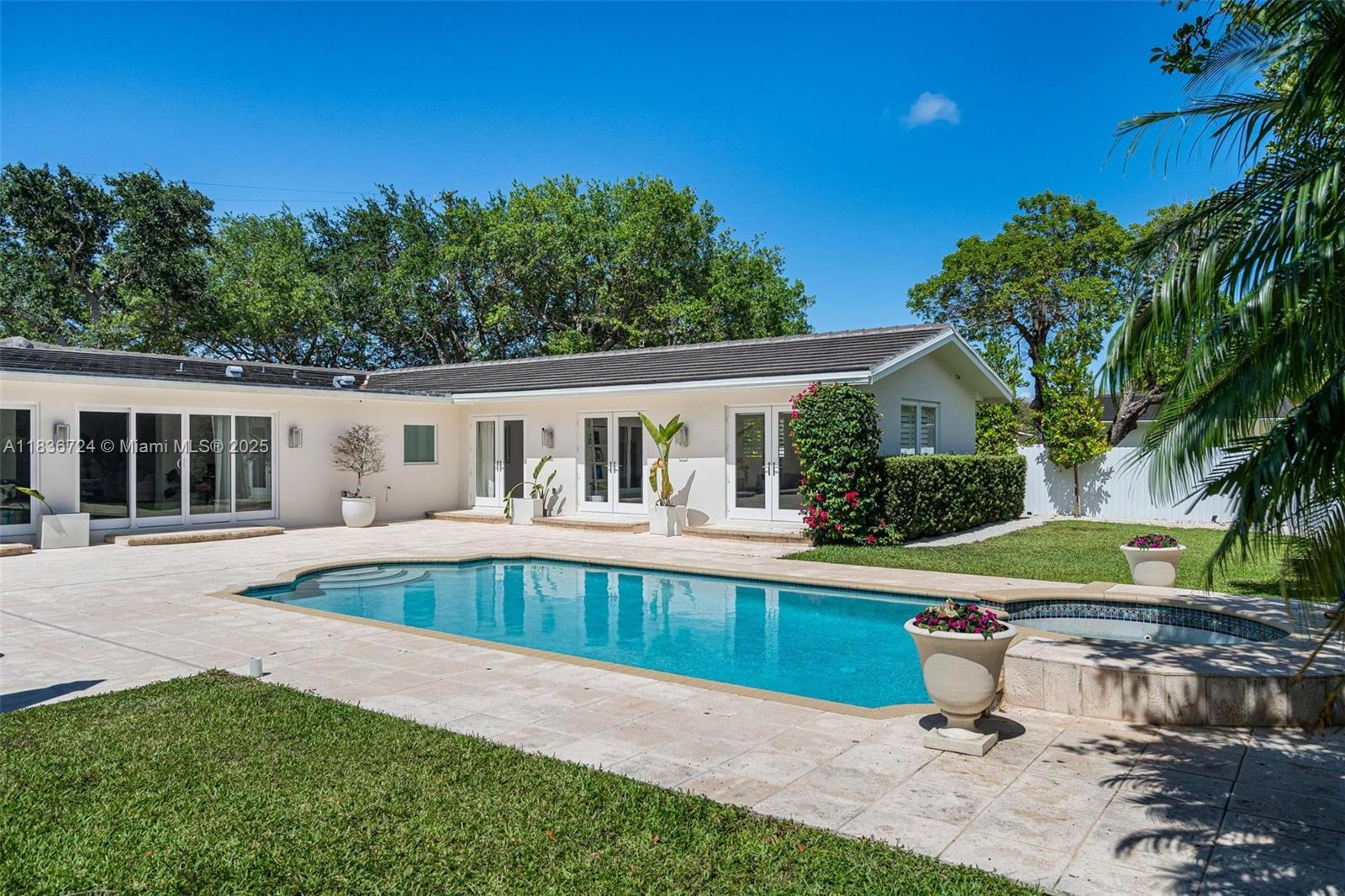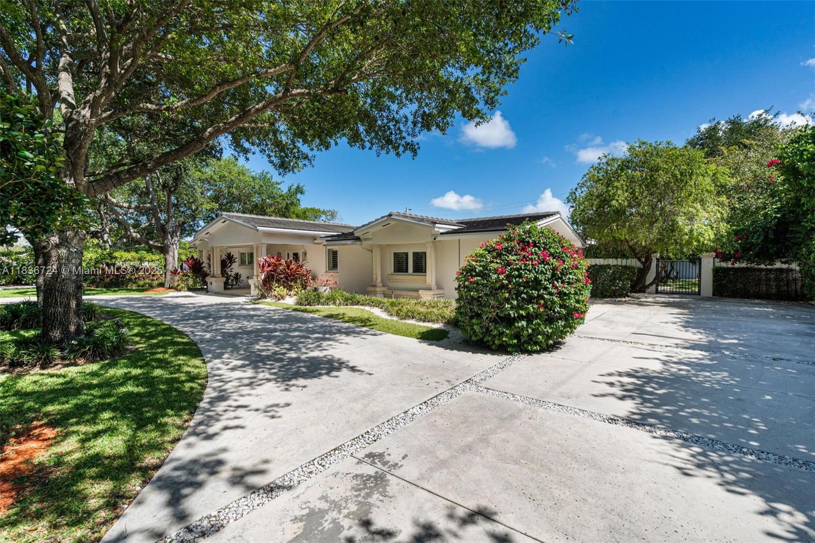 A pristine and elegant Pinecrest residence, set behind a graceful circular driveway and secure electric gate. Offering 4 bedrooms and 3 bathrooms across 3,152 sq ft, this home is designed for both comfort and ease. The sunlit primary suite includes a generous walk-in closet. A bright kitchen features stone countertops, plentiful cabinetry, and a cozy breakfast nook. The open dining area with built-in bar invites entertaining. A spacious office or family room offers versatility. Outside, enjoy a large covered summer kitchen with built-in BBQ, lounge space, saltwater pool, and spa—ideal for enjoying the South Florida lifestyle. Surrounded by oak trees and lush tropical landscaping, this property offers a private, serene oasis close to everyday conveniences including Pinecrest schools.