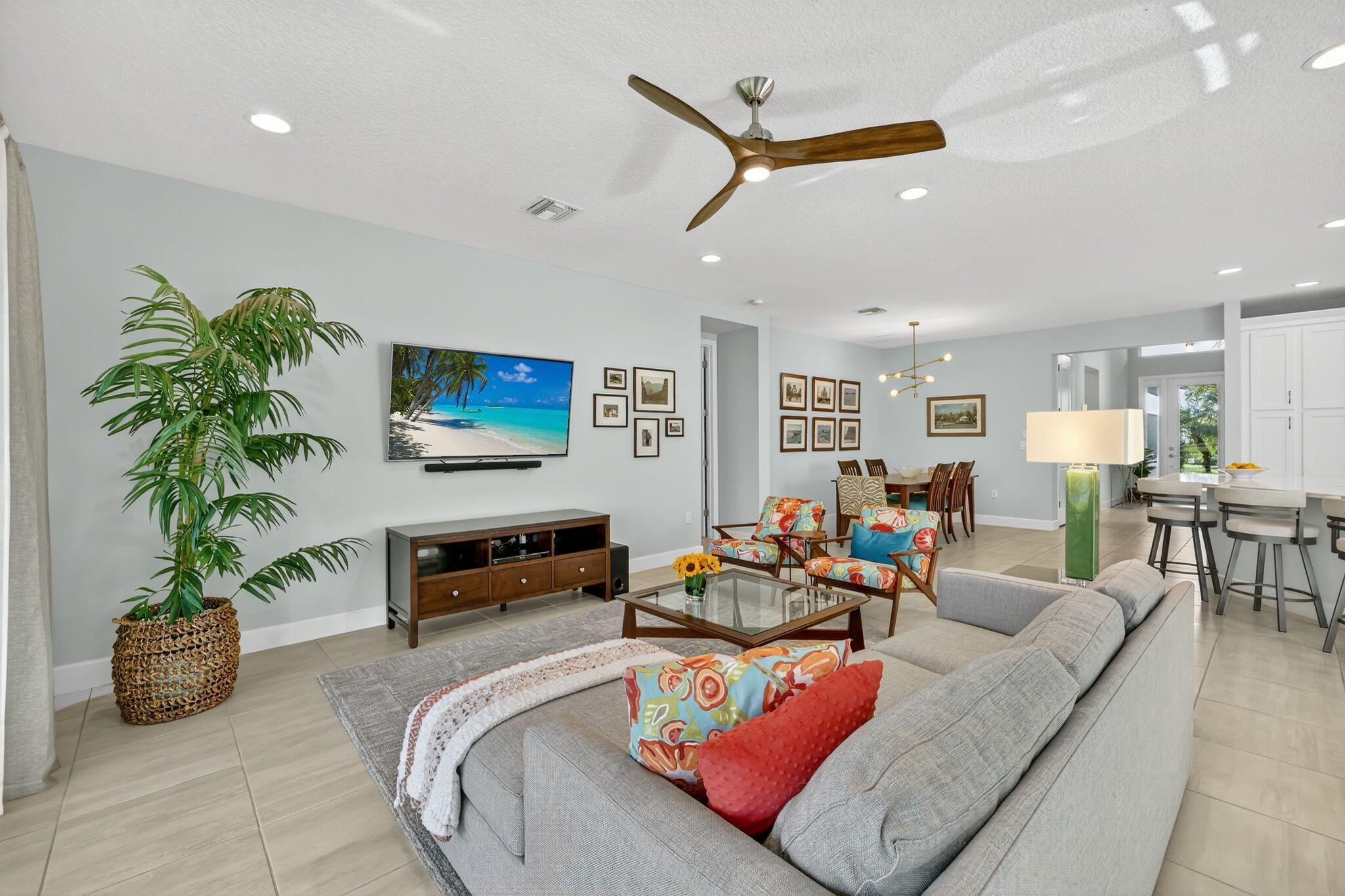Welcome to your dream home in the sought-after 55+ community of Valencia Cay at Riverland! This beautifully designed Bimini Model sits on an oversized premium lakefront lot, offering breathtaking water views and the perfect blend of luxury, comfort, and lifestyle. Featuring 3 spacious bedrooms, 3 full bathrooms, a den/flex room, and over 2,358 sq. ft. of living space, this open-concept layout is ideal for entertaining and everyday living. The gourmet kitchen boasts quartz countertops, stainless steel appliances, a large island, and upgraded cabinetry, seamlessly flowing into the expansive great room and dining area, all overlooking the large, covered patio and sparkling lake with a south exposure.