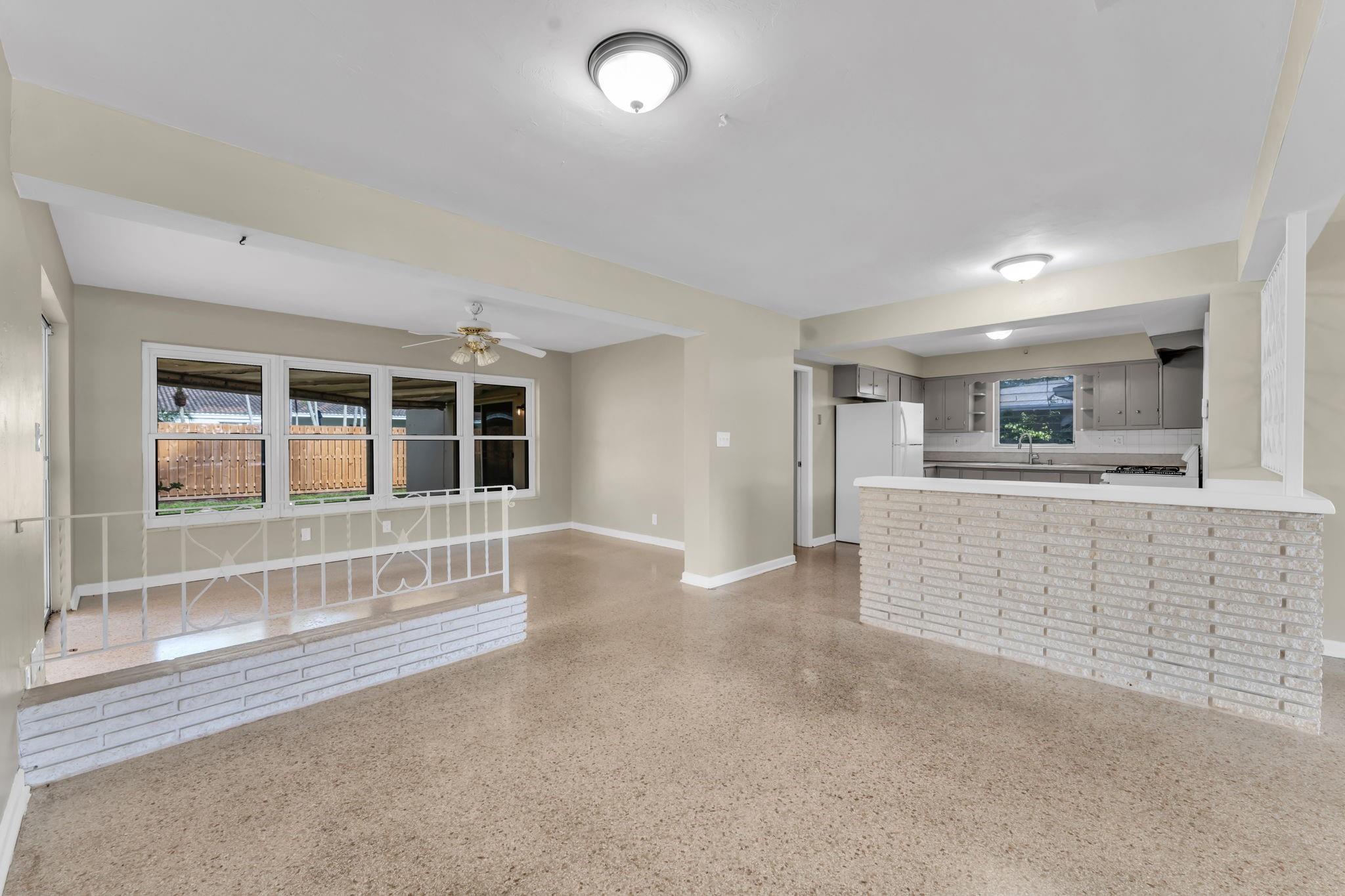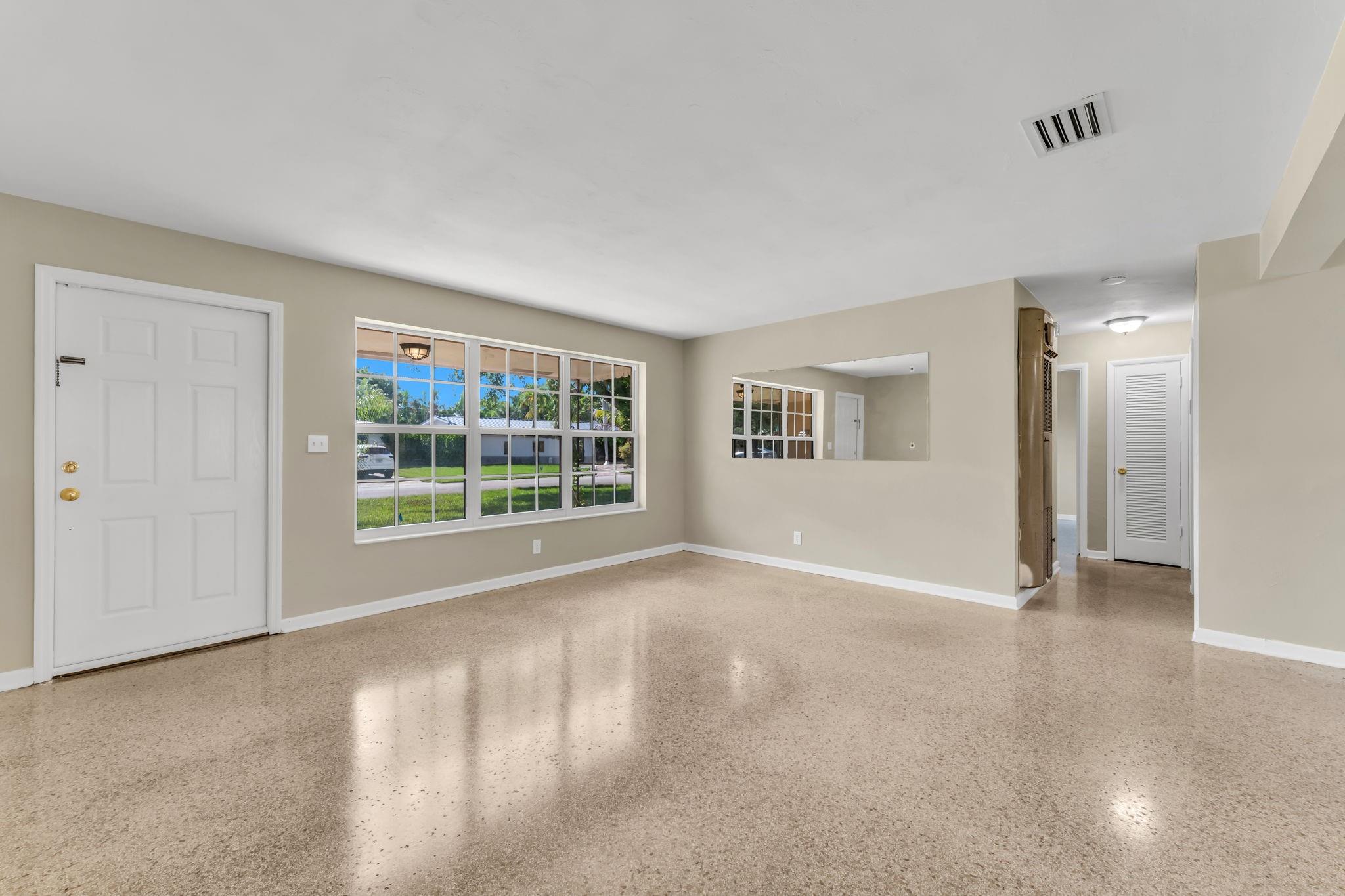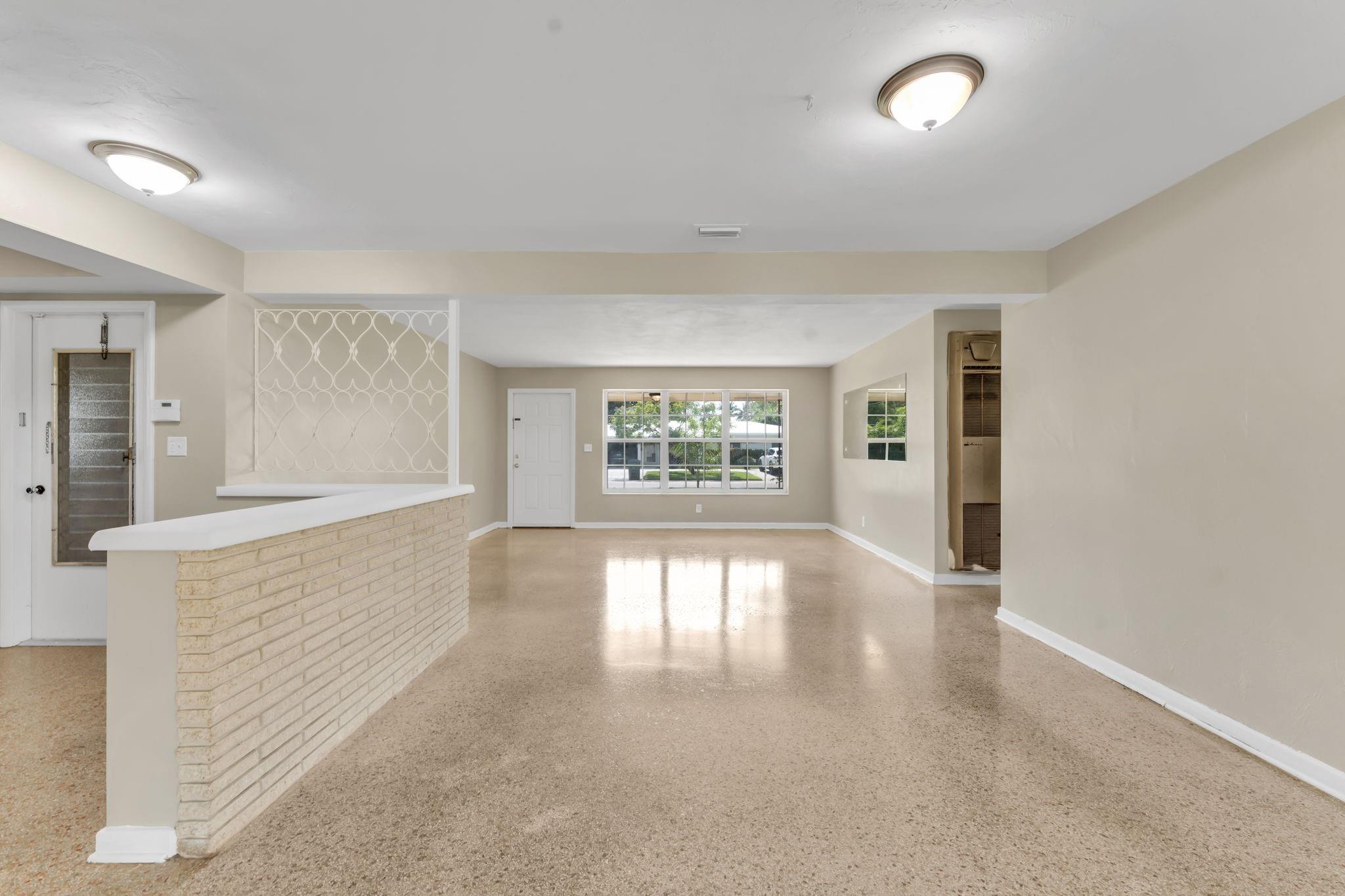 PRICED BELOW MARKET VALUE. $309/SQ. FT.! Mid-Century charm looking for your personal touches! Desirable Floranada School district. 3/3 split layout. (3rd bedroom makes a great in-law suite or efficiency). This room has a private entrance, full bath, kitchenette, wood burning fireplace and access to backyard patio. Home features include; natural gas, partial impact windows and panels, polished terrazzo floors, updated electric panel, central A/C (2015), new lawn irrigation system and sod, interior and exterior freshly painted, 2 car garage plus resurfaced driveway with parking for up to 4 cars. This spacious home has endless possibilities and is PRICED TO SELL! Main house has Central A/C although some wall units are still in place. Efficiency has a wall unit a/c.