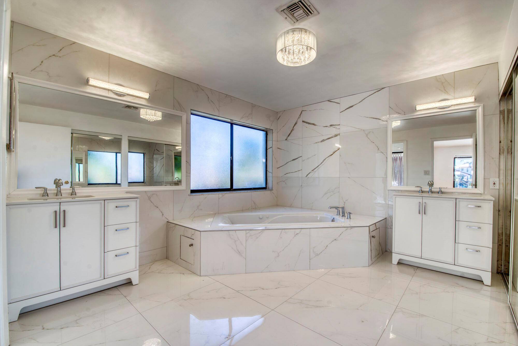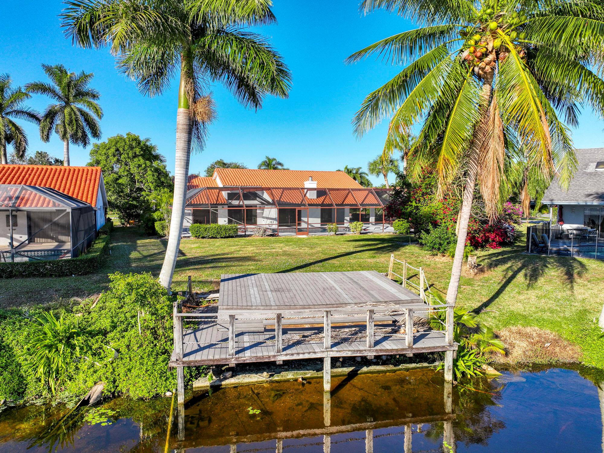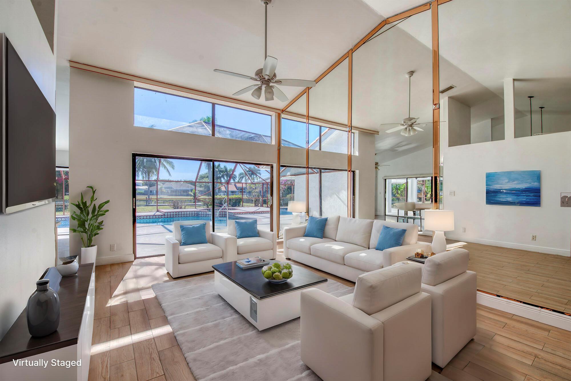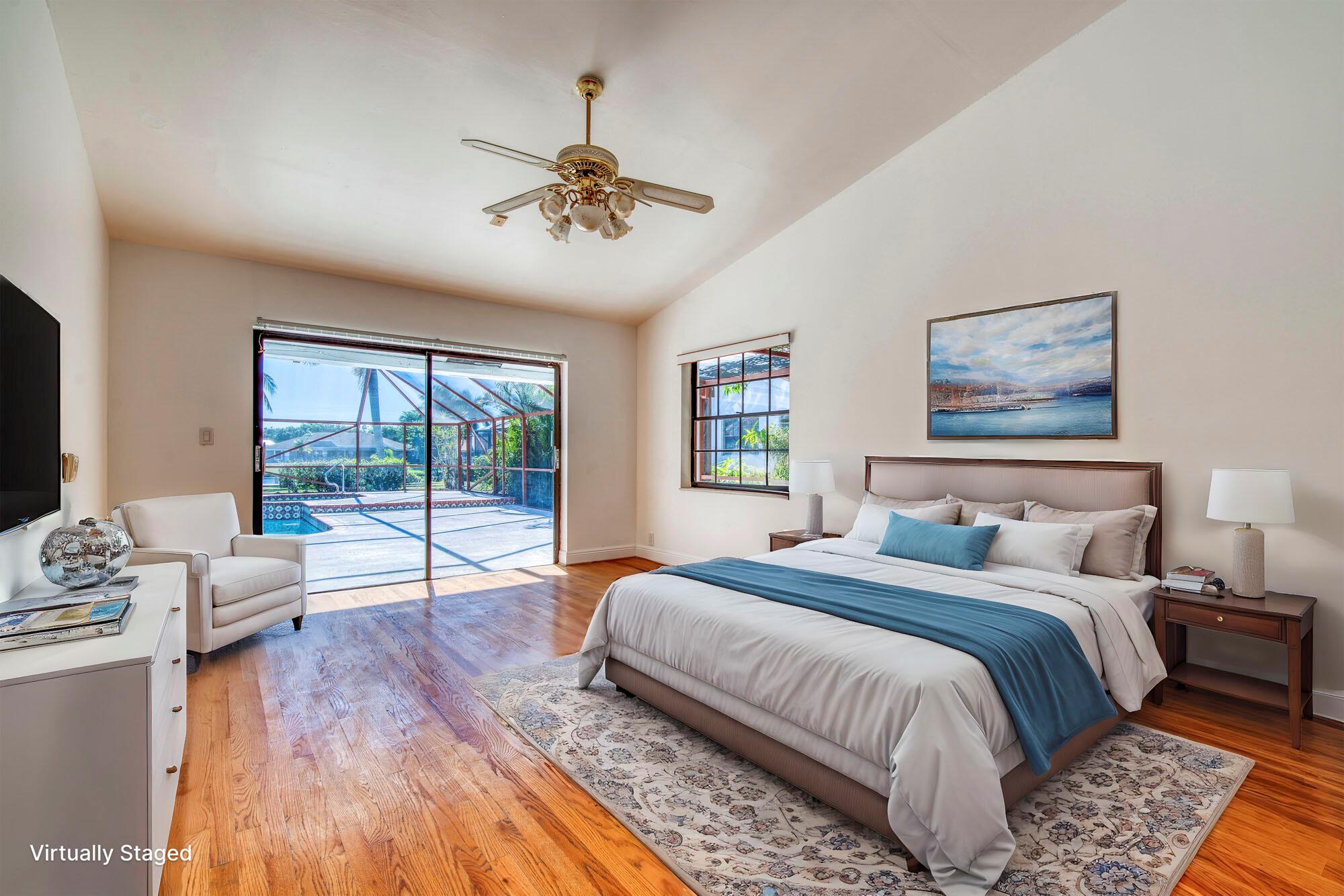 This extremely bright and expansive lakefront home in Greenview Shores has rear southern exposure that keeps the patio, large pool, jacuzzi and backyard oasis in the sun all day. The master bedroom, primary guest room, living and family room have glass sliders that lead out to the backyard oasis and gets sun all day. The triple split floor plan allows for privacy for owners, children or guests. Both full bathrooms have been updated, as well as the kitchen which has separate dining and breakfast room. Florida Pine has been laid in the master bedroom and one of the guest rooms. Ceramic wood-look tile layers the main living area, dining area, and the additional two guest bedrooms. Massive garage has been widened and heightened to accommodate an RV or 2 horse trailers.