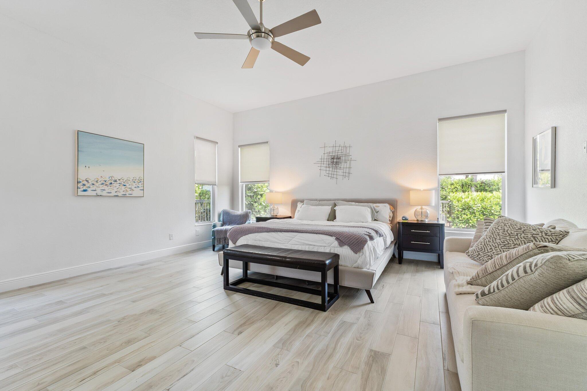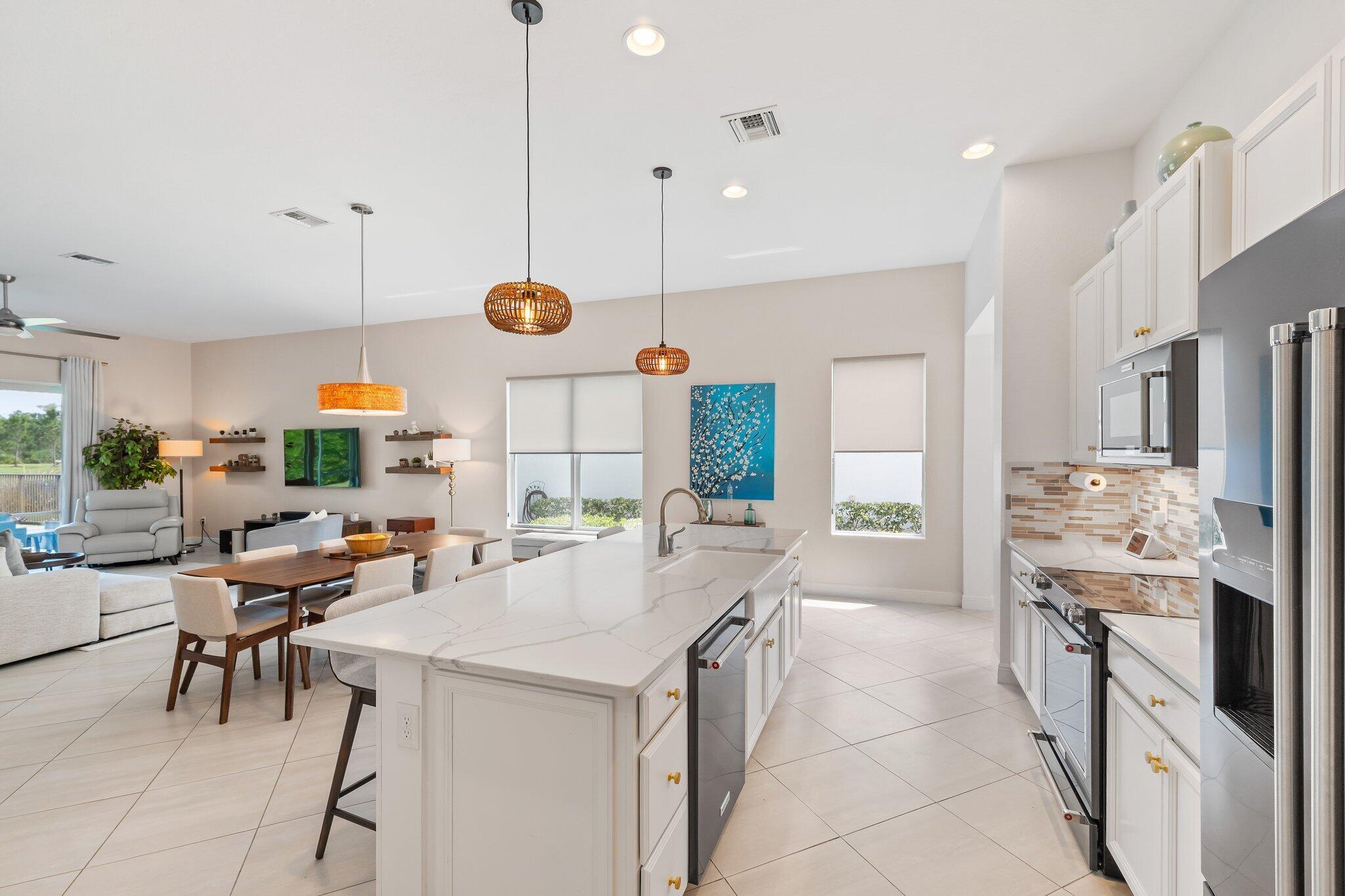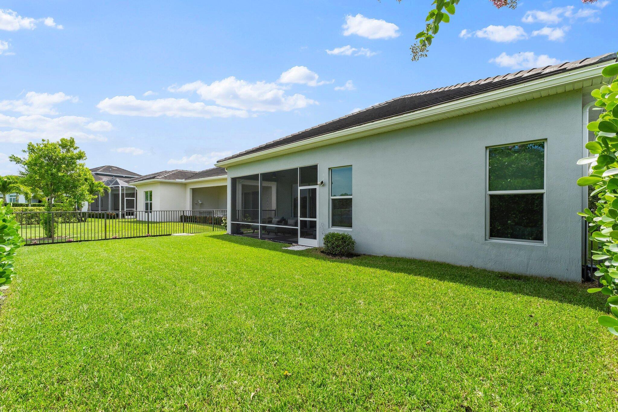 This is the beautiful Antigua Model home. One of the most sought after floor plans in Banyan Bay with 3 Bedrooms and 3 full baths, all on one floor! The Calcutta Quartz Kitchen Counters, Black Stainless Steel appliances and Farmhouse Sink make this home a standout! You'll also love the Custom Features throughout, including Shades & Blinds, Lighting, Shelving, Ceramic Tile flooring and more! A new Lennox AC with UV light was installed in October 2024. The fully fenced yard is great for kids and pets, and the screened in Lanai provides beautiful lake views. There's plenty of room for a pool, but the community pool is wonderful, so a great community with sidewalks, a private boat launch for kayaking or paddle boarding.