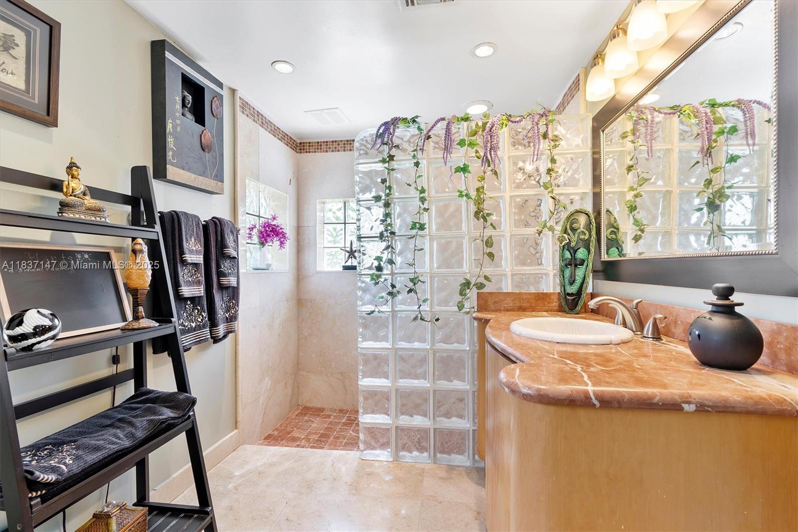 Stunning 2bed/2bath home with an open spacious layout and serene garden views. With no HOA. Features elegant marble floors throughout, a luxurious kitchen with granite countertops, a spacious island with a Thermador glass range, and a Sub-Zero refrigerator. Wet bar with granite tops and wine racks. The primary bedroom opens to the outdoors. Walk-in closet easily converts back to 3rd bedroom. Bathrooms are Roman-style with recessed designs, fully clad in marble; the primary bath boasts steam shower, and Jacuzzi tub. The fully fenced backyard features double French doors leading from the living area to a spacious patio, plus a shed for storage. Ample room for a pool. Bundled service pricing available for buyers. Connect with the listing agent for details. *Priced considering roof condition.
